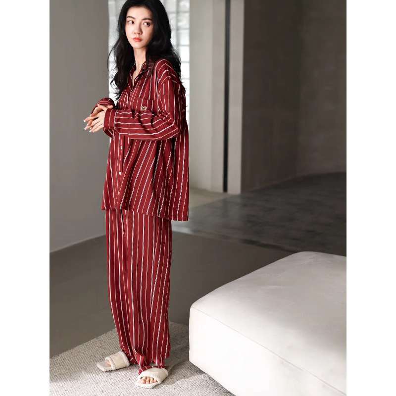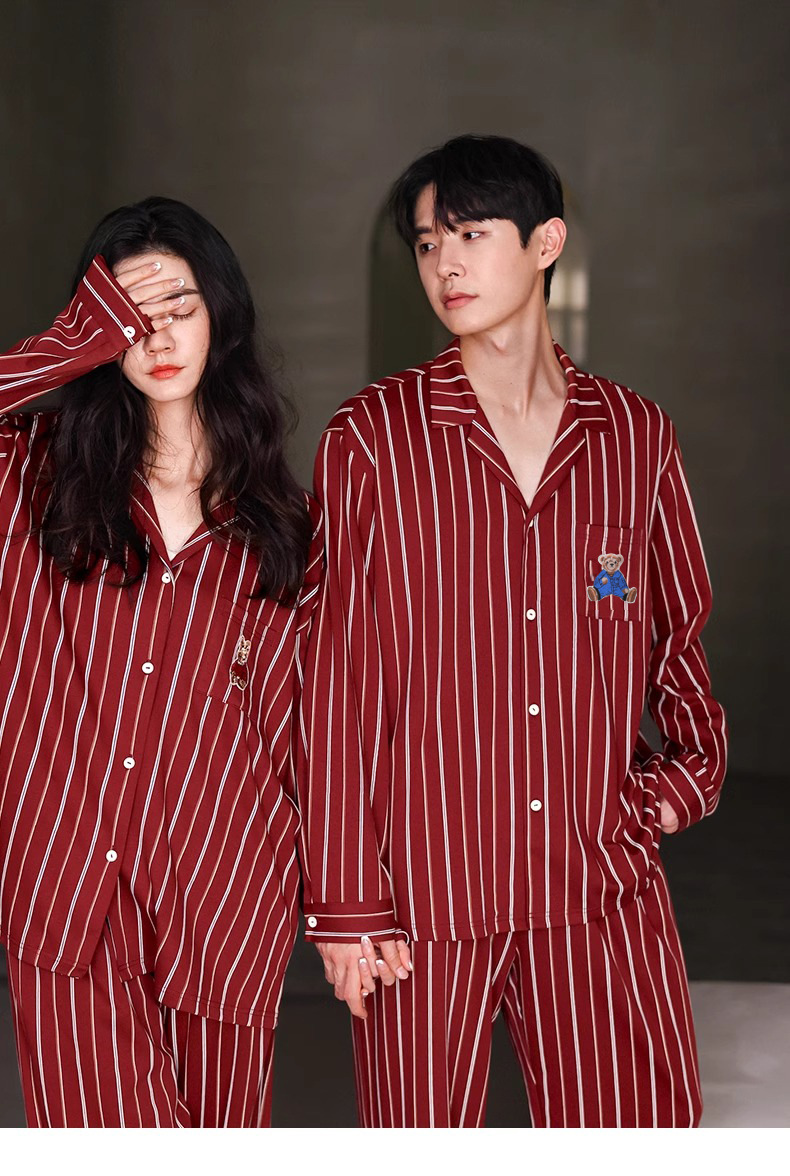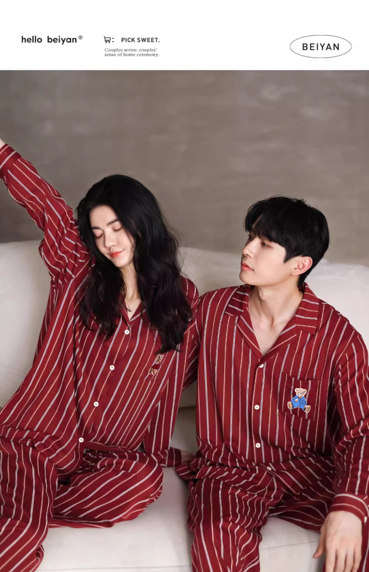Beiyan 같은 스타일 퓨어 코튼 레드 커플 파자마 신혼 결혼식 세트 봄과 가을 긴 소매 얇은 남성과 여성의 홈 옷스토어 가기