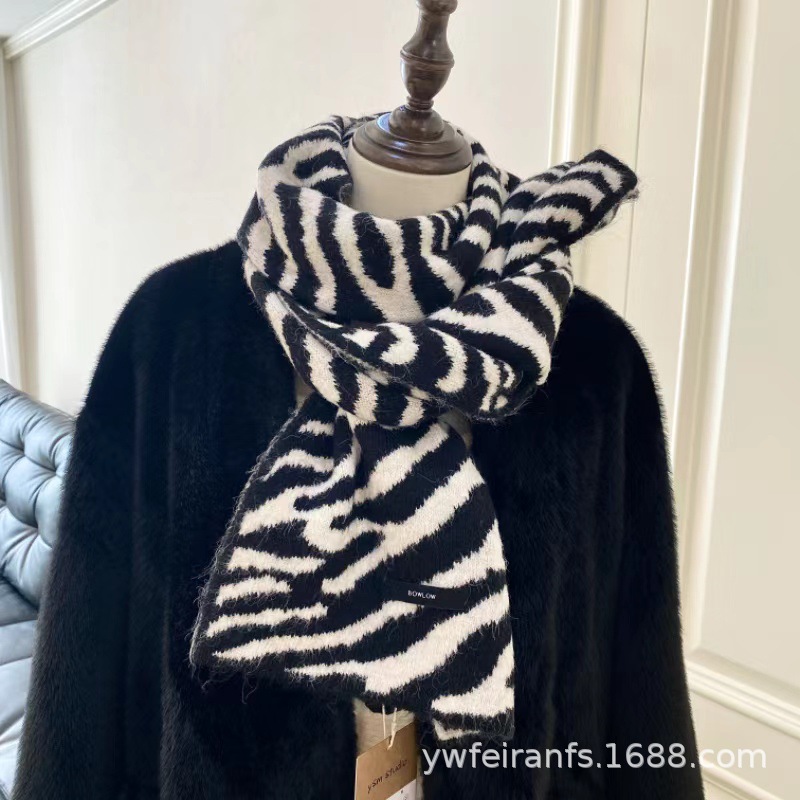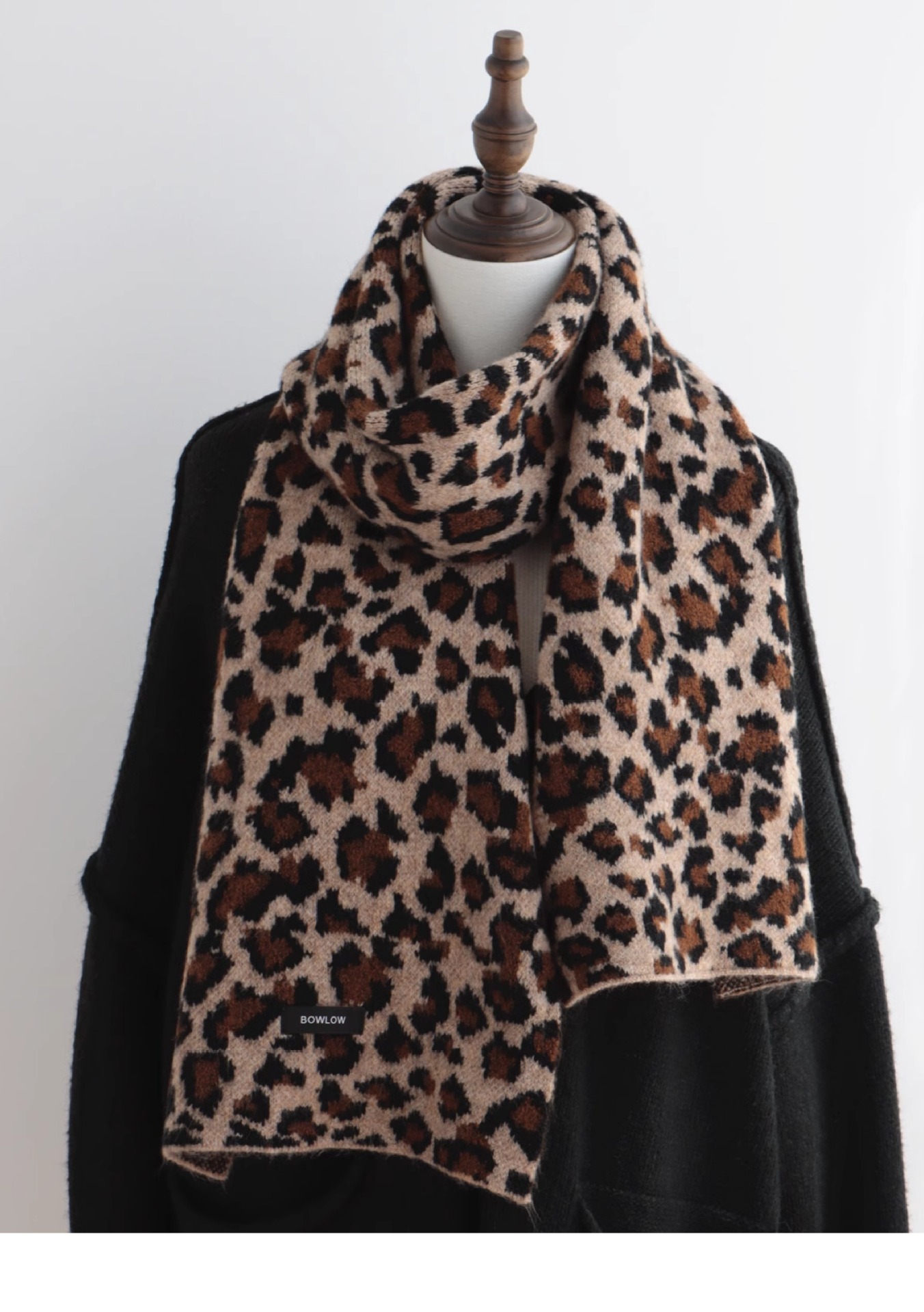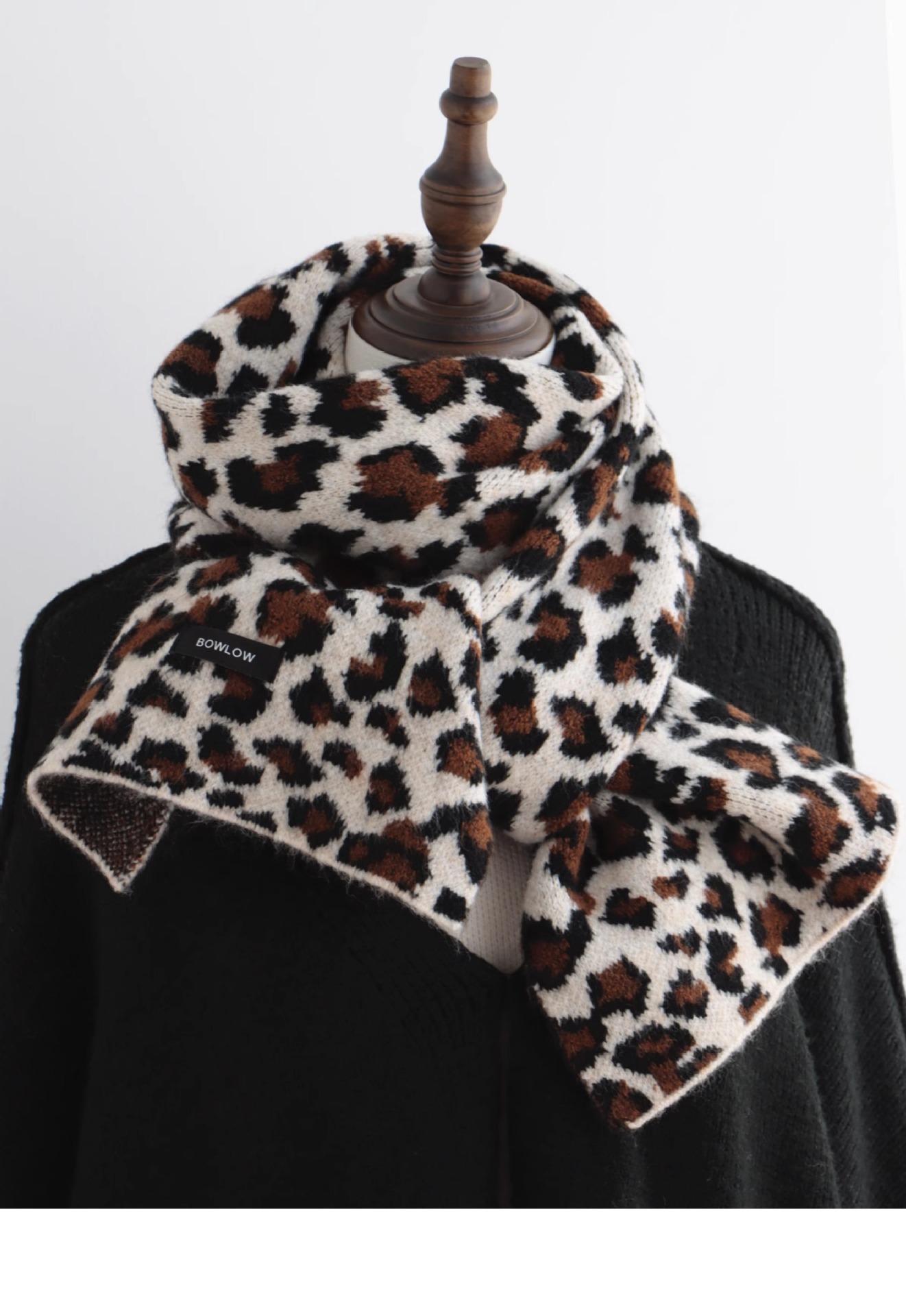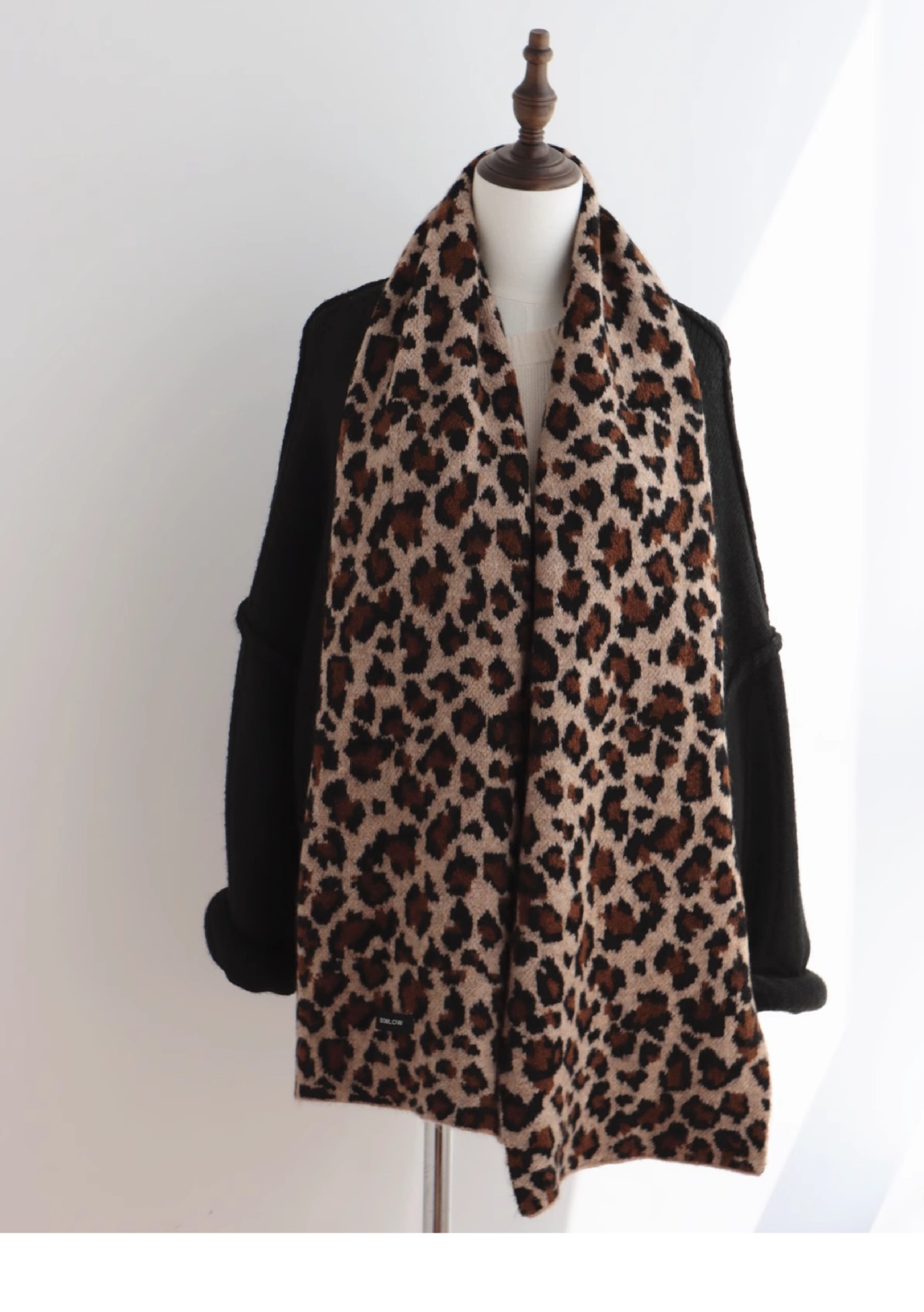 2024豹纹针织毛线围巾女士冬季加厚羊毛混纺网红围脖气质百搭保暖