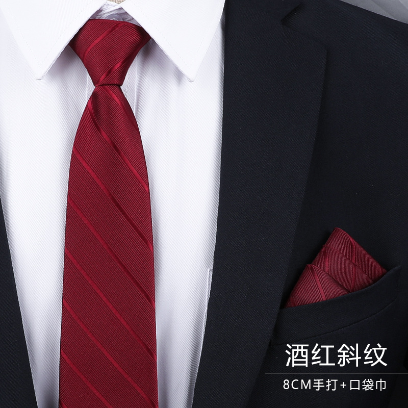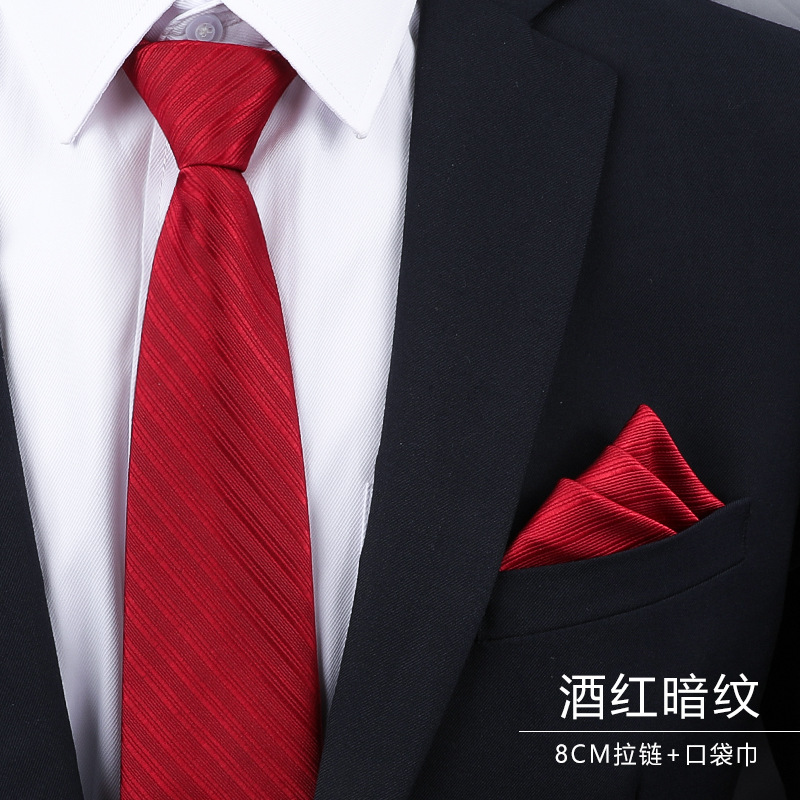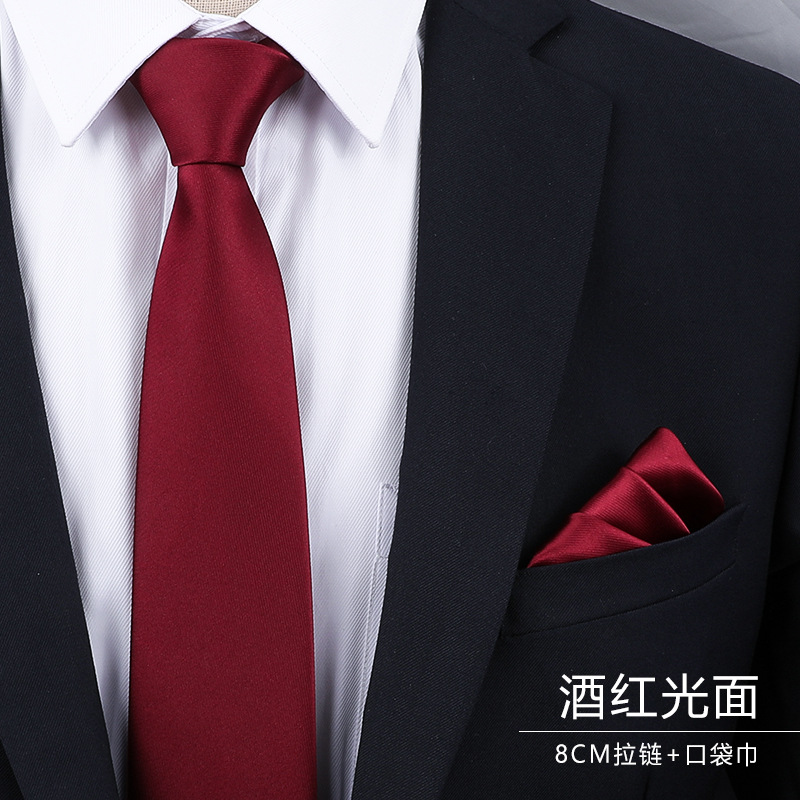 • 8CM 우아한 버건디 지퍼 타이 + 포켓 스퀘어