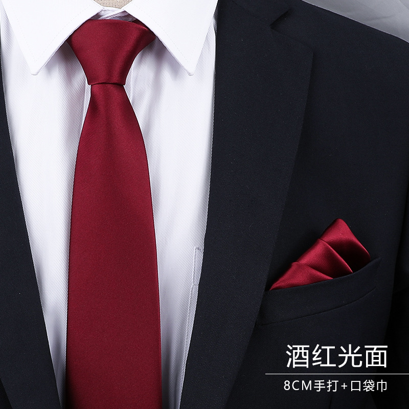 • 8CM 버건디 글로시 핸드 타이 + 포켓 스퀘어