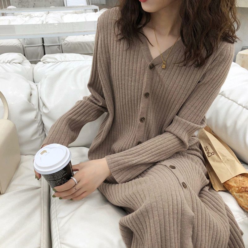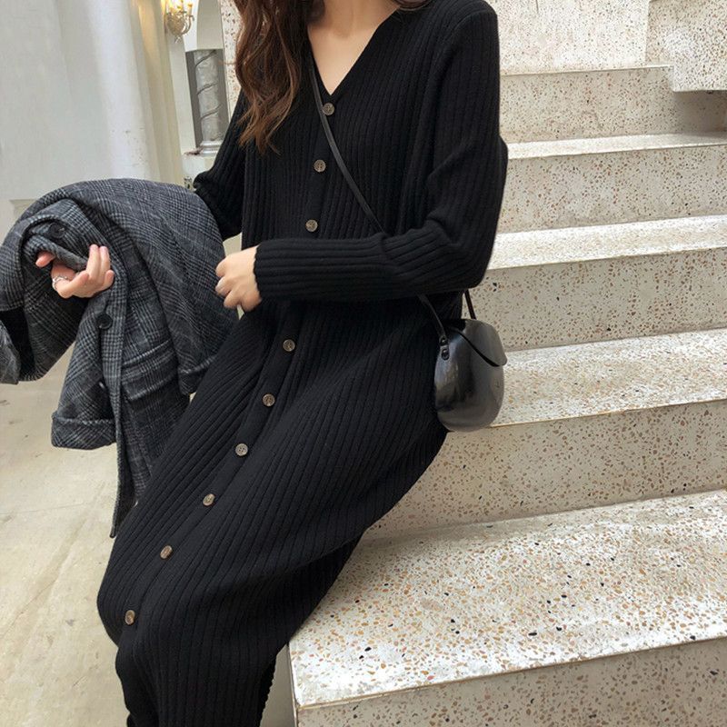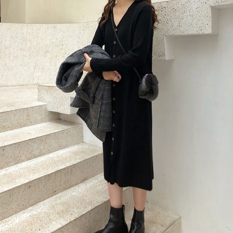 2024 새로운 게으른 스타일 니트 원피스 여자 캐주얼 올 매치 느슨한 가을 Bottoming 중간 길이의 스웨터 원피스스토어 가기