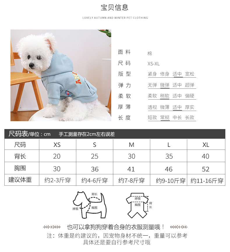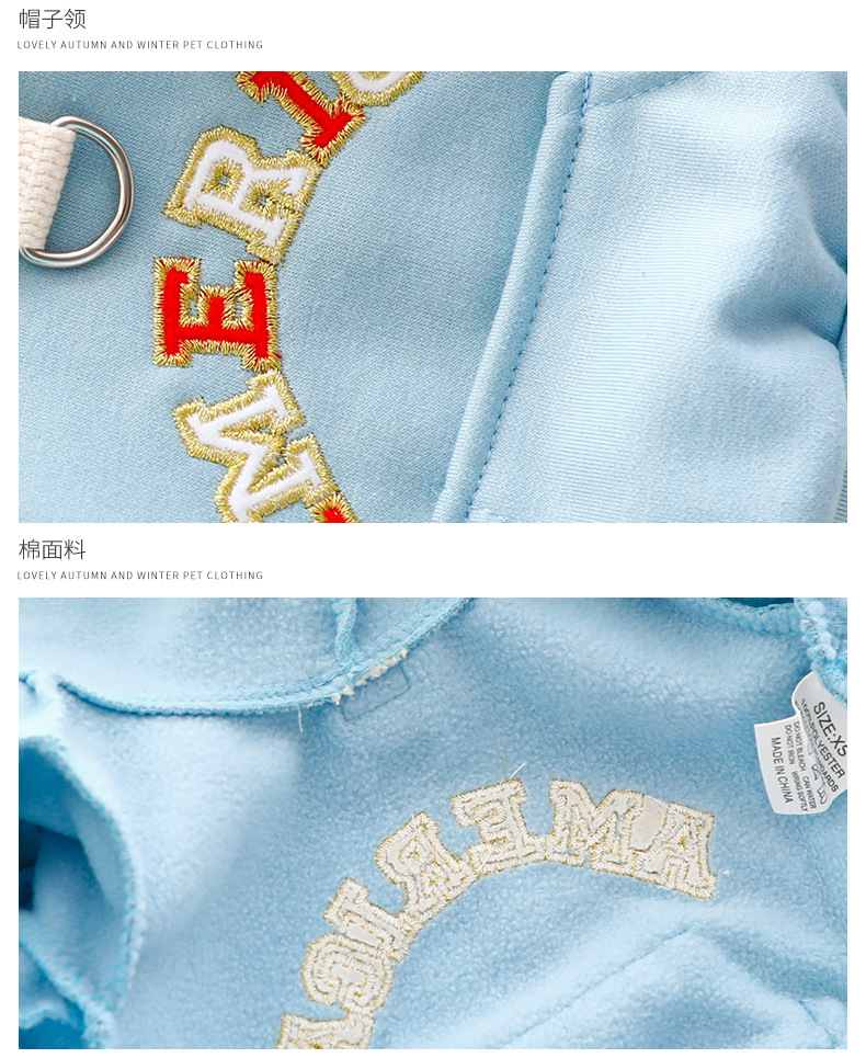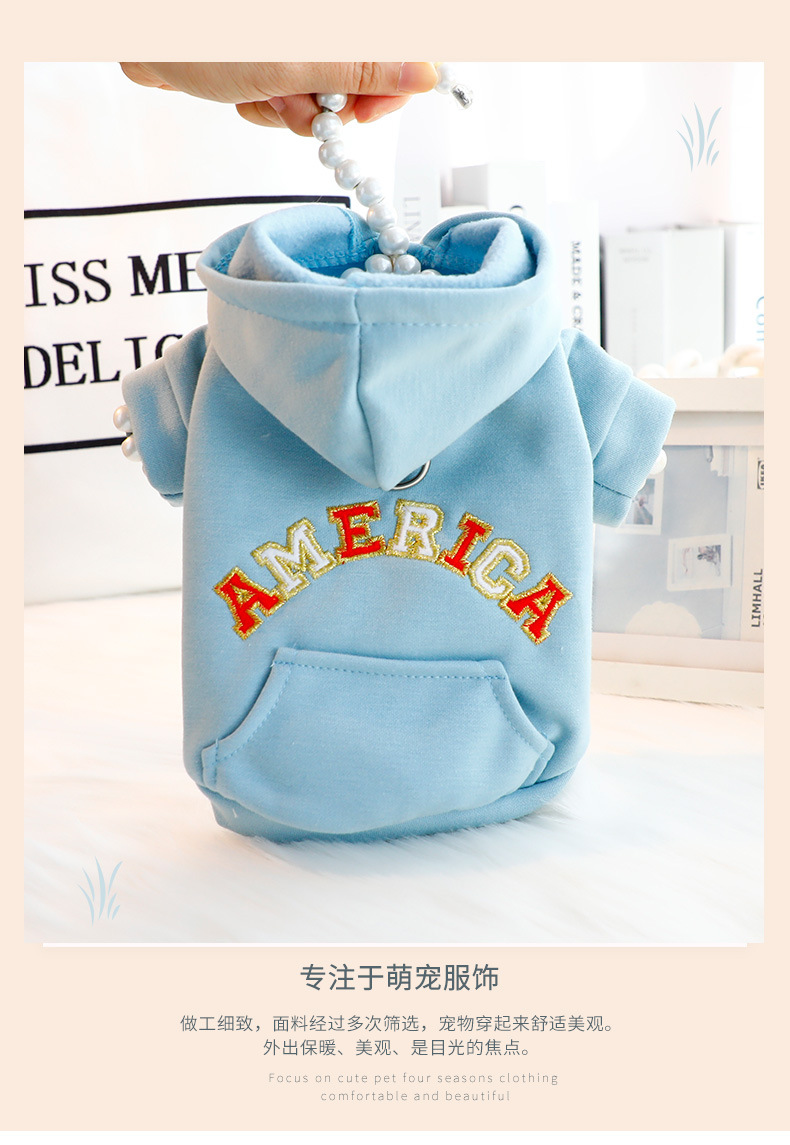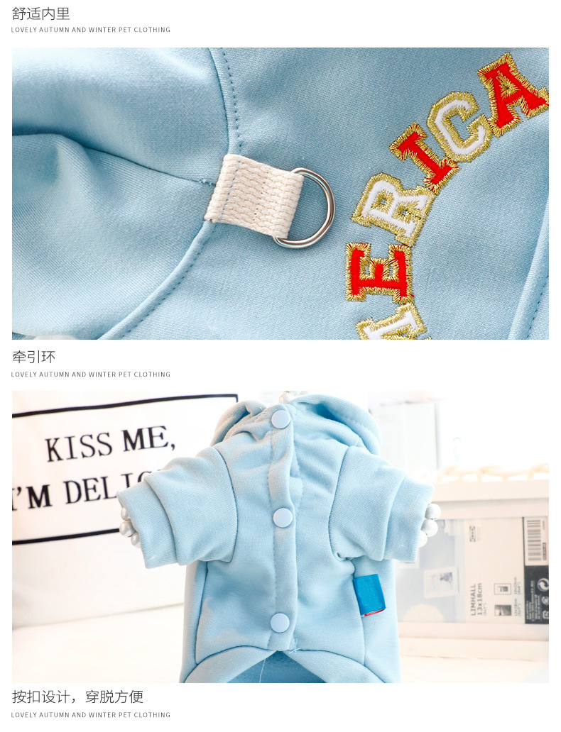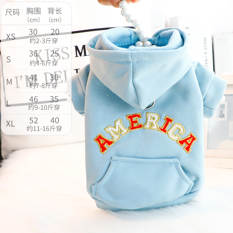 개 옷 봄과 가을 고양이 간단한 파란색 자수 견인 모자 스웨트셔츠 작은 개 테디 애완 동물 6558