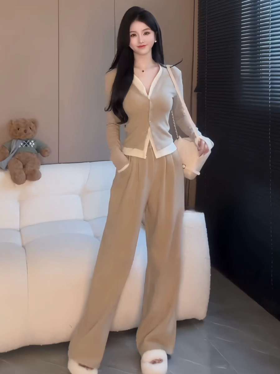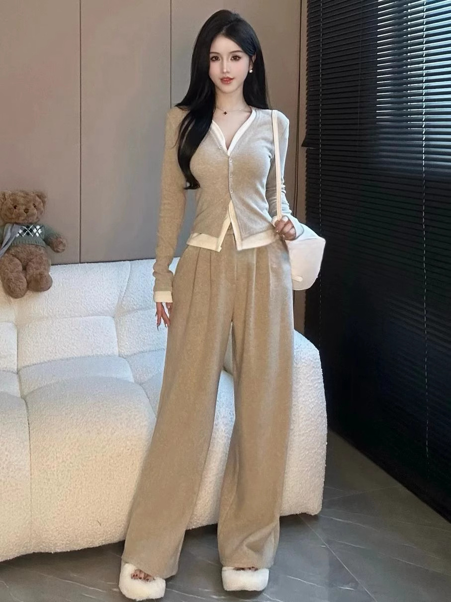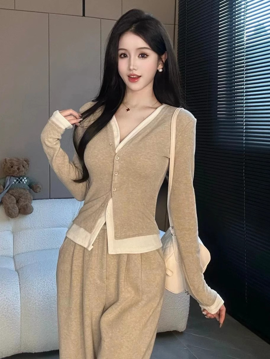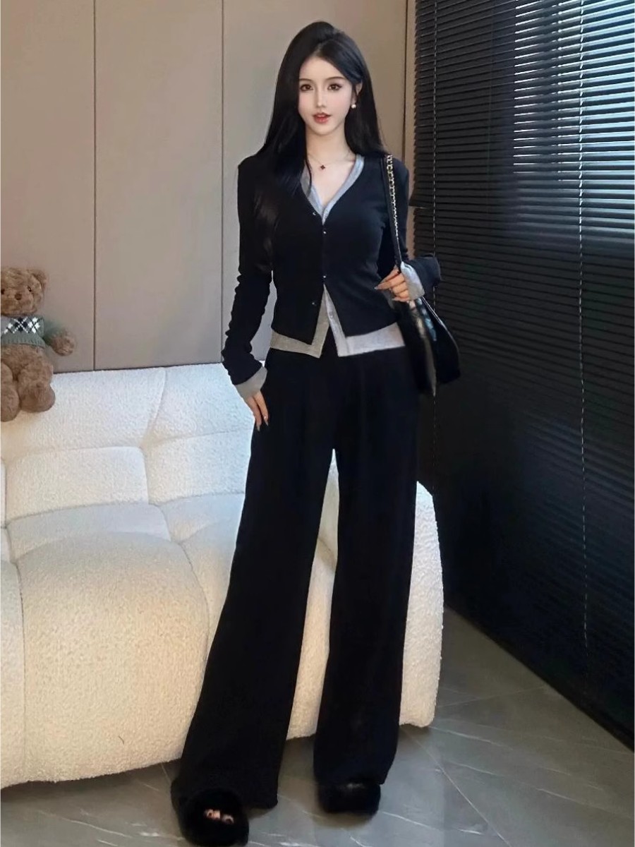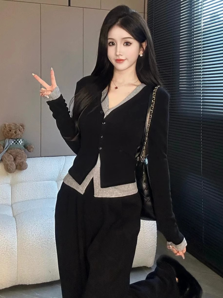2024 봄과 가을 새로운 레저 스포츠 세트 여성 패션 서양식 디자인 센스 페이크 투피스 스플라이스 카디건 투피스 세트스토어 가기