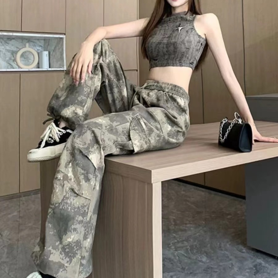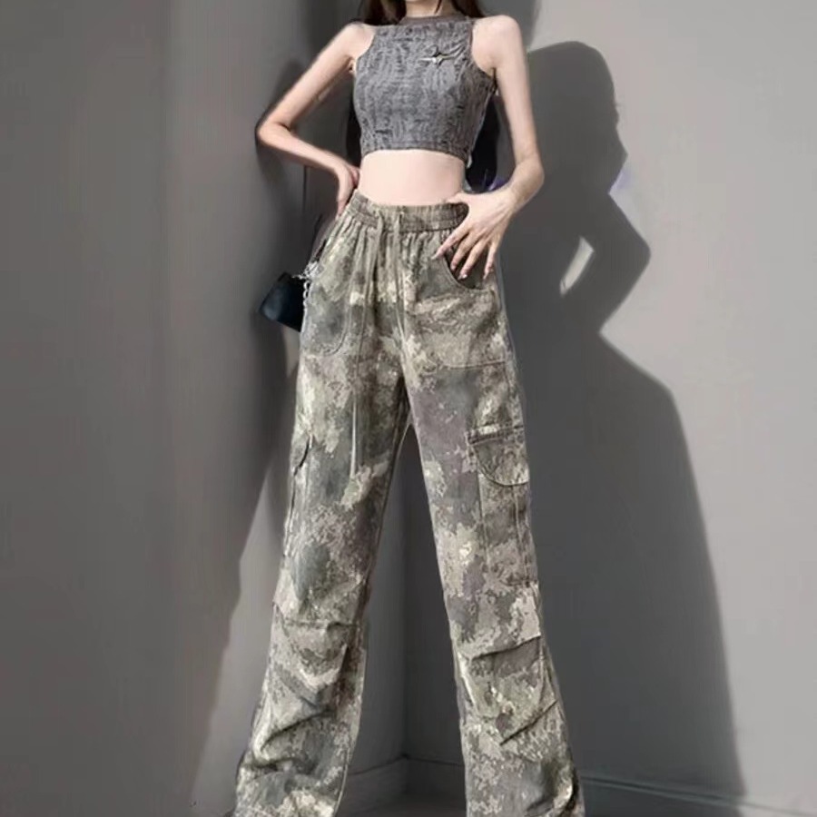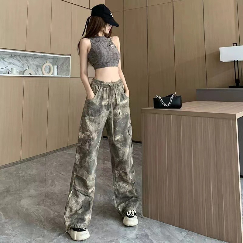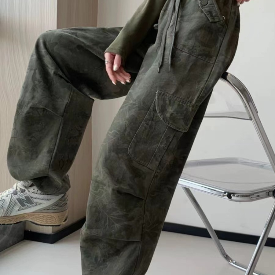 미국 복고풍 위장 바위 바지 여성의 봄과 가을 높은 허리 Daggy 넓은 다리 바지 느슨한 다리 바지 캐주얼 등산 스포츠 바지