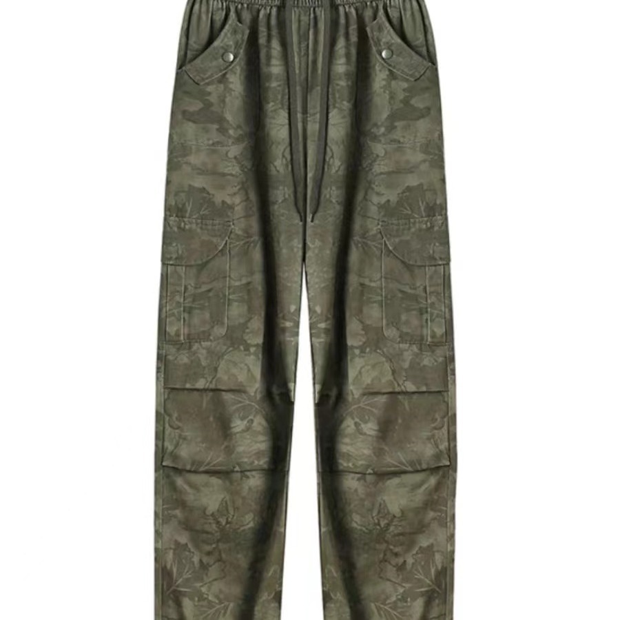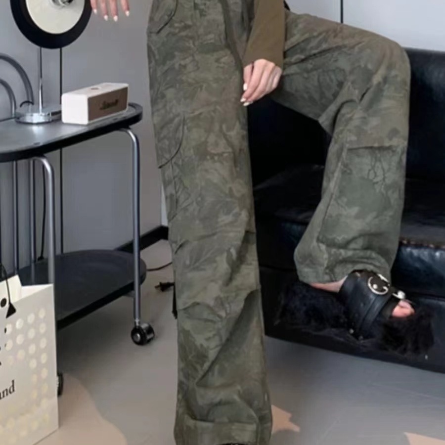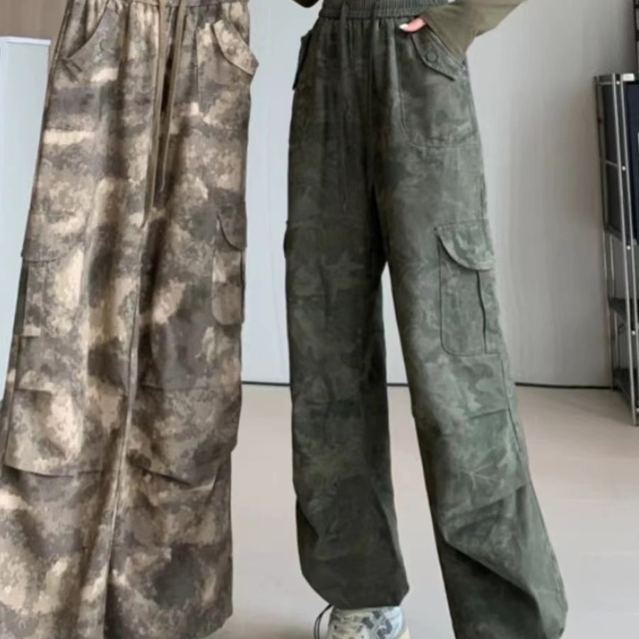 미국 복고풍 위장 바위 바지 여성의 봄과 가을 높은 허리 Daggy 넓은 다리 바지 느슨한 다리 바지 캐주얼 등산 스포츠 바지스토어 가기
