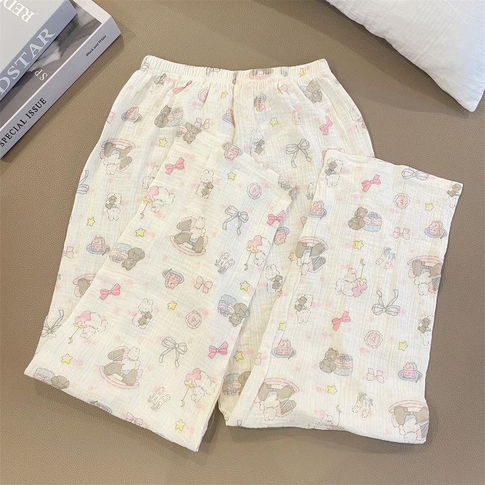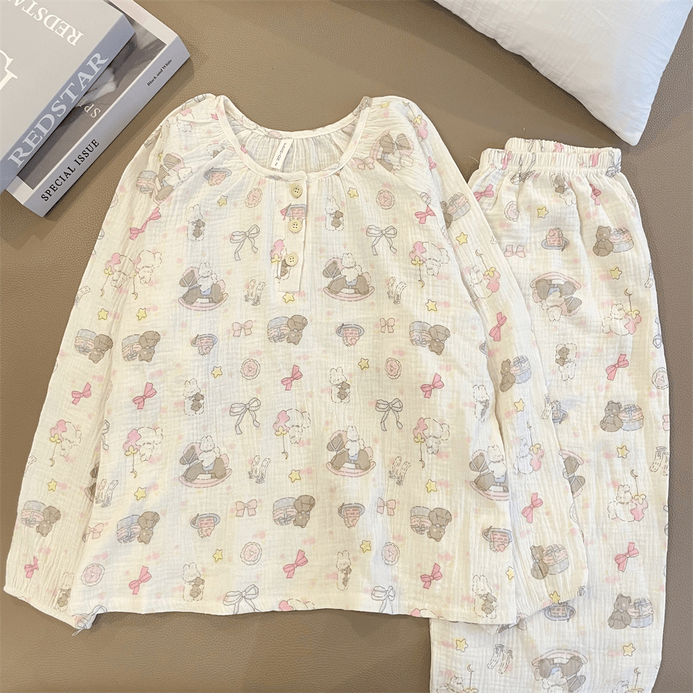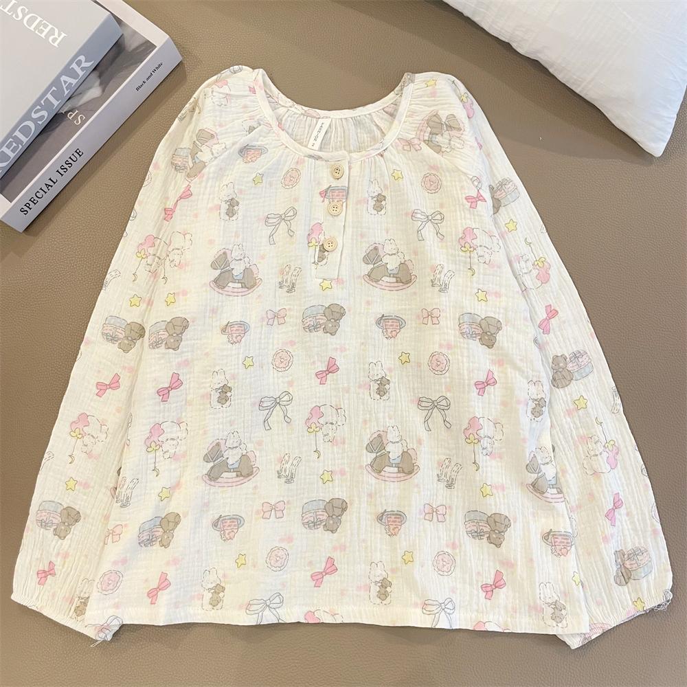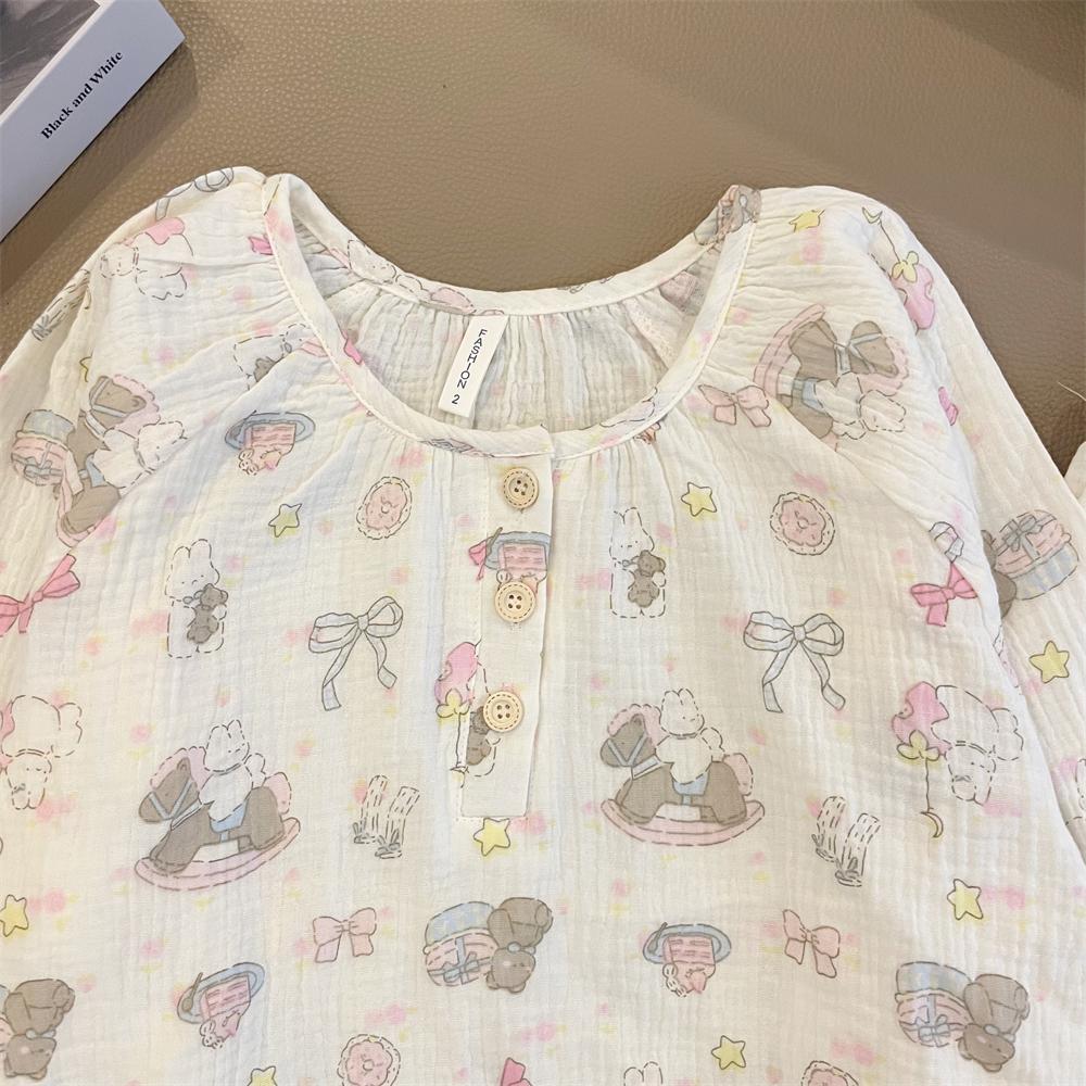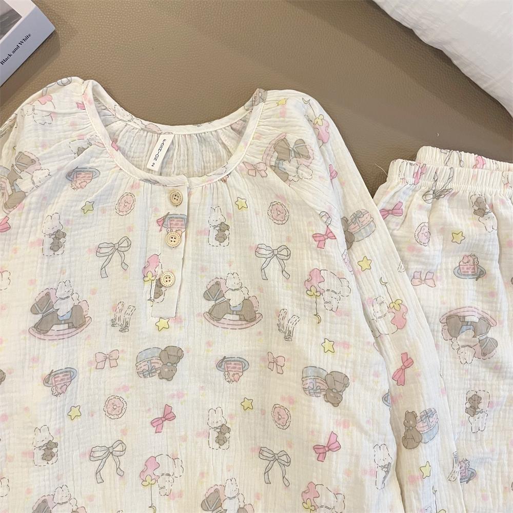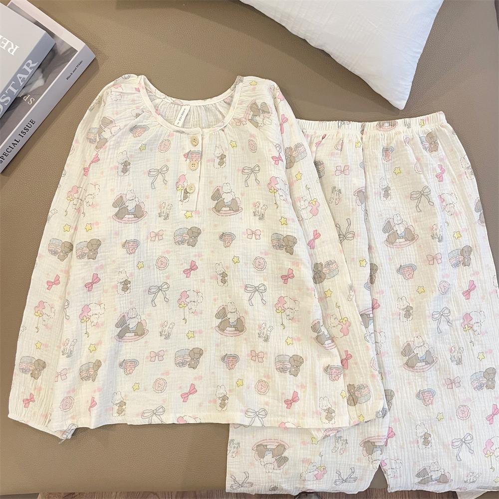 더블 레이어 퓨어 코튼 거즈 파자마 여성의 봄과 가을 새로운 긴 소매 일본 스타일 달콤한 귀여운 소녀의 여름 토끼 홈 옷