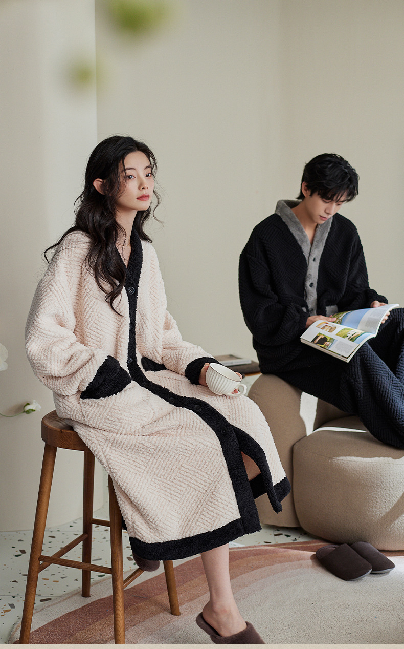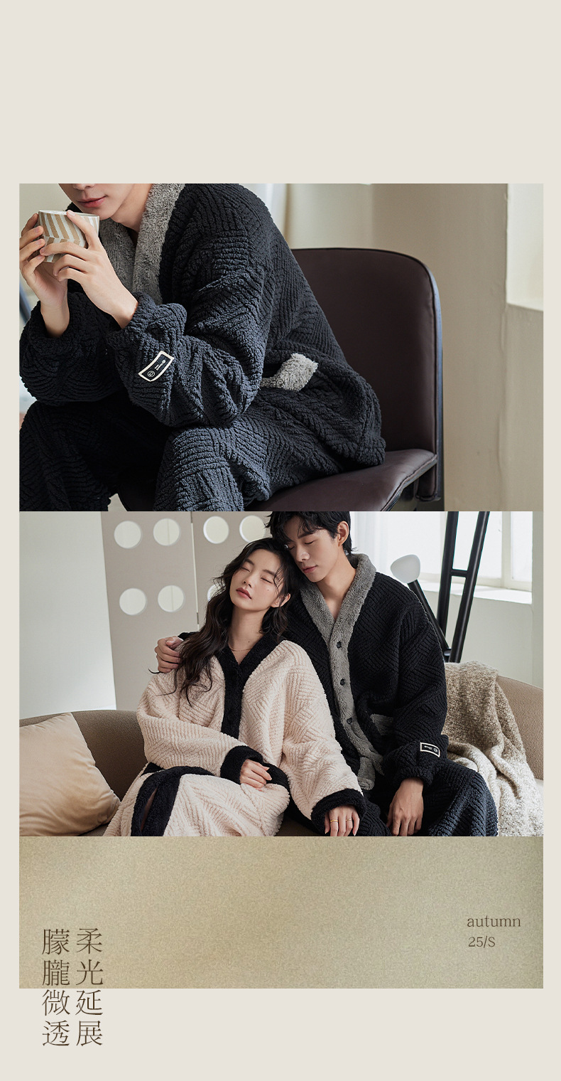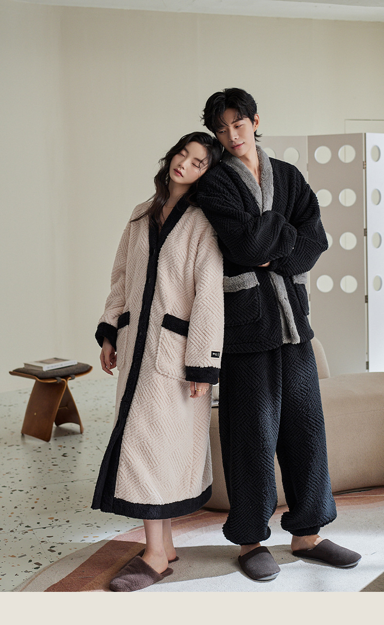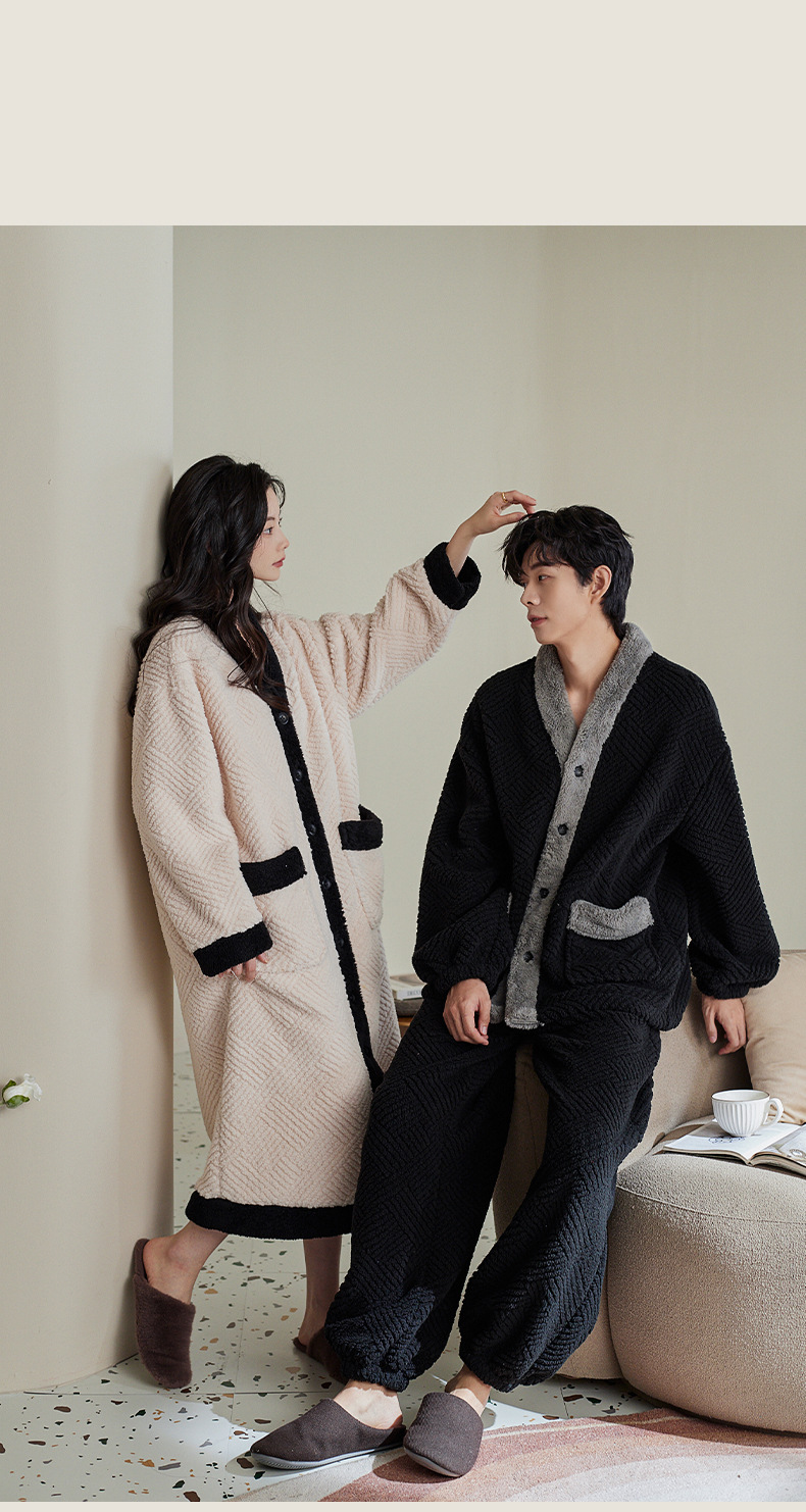 커플 잠옷 가을과 겨울 산호 양털 기모 두꺼운 긴 잠옷 여성의 아침 가운 플란넬 남자 홈 옷 세트
