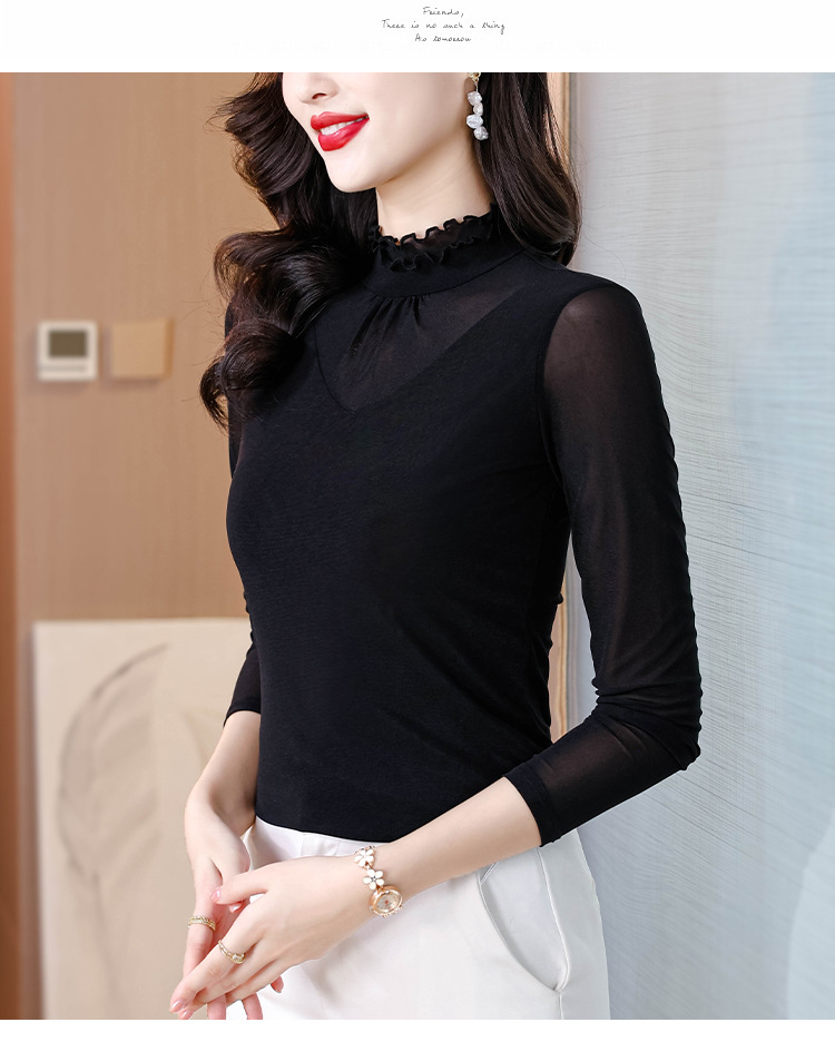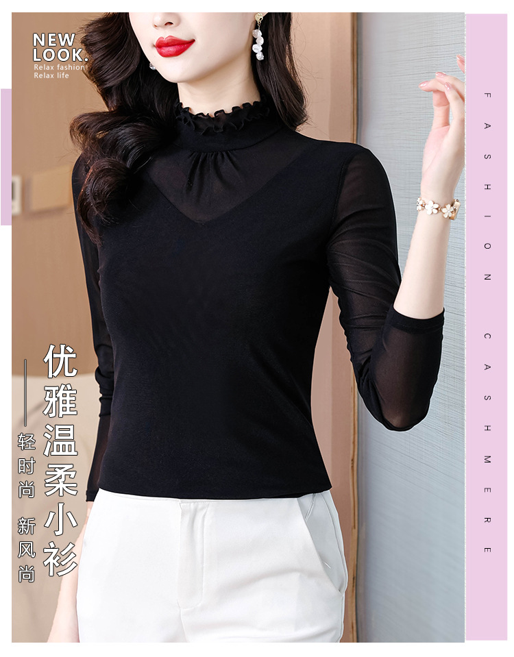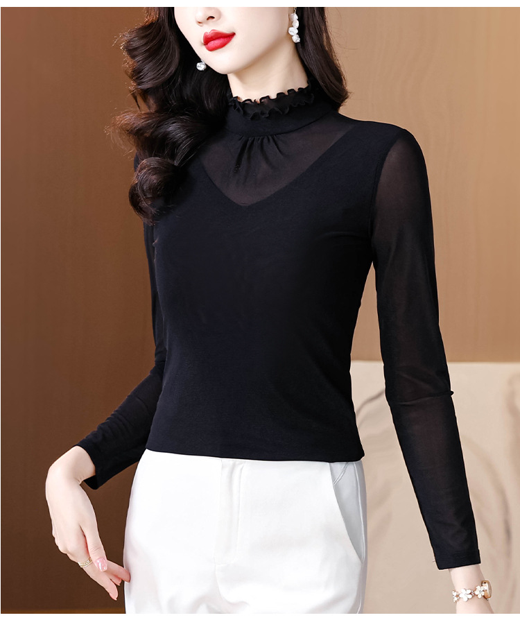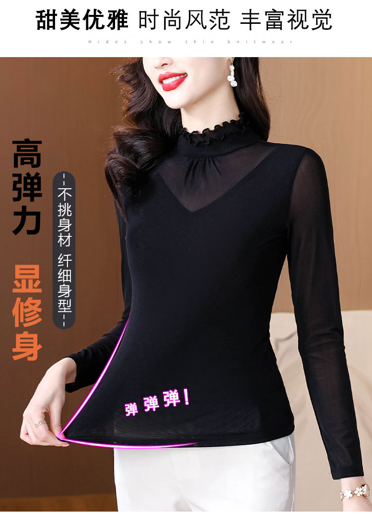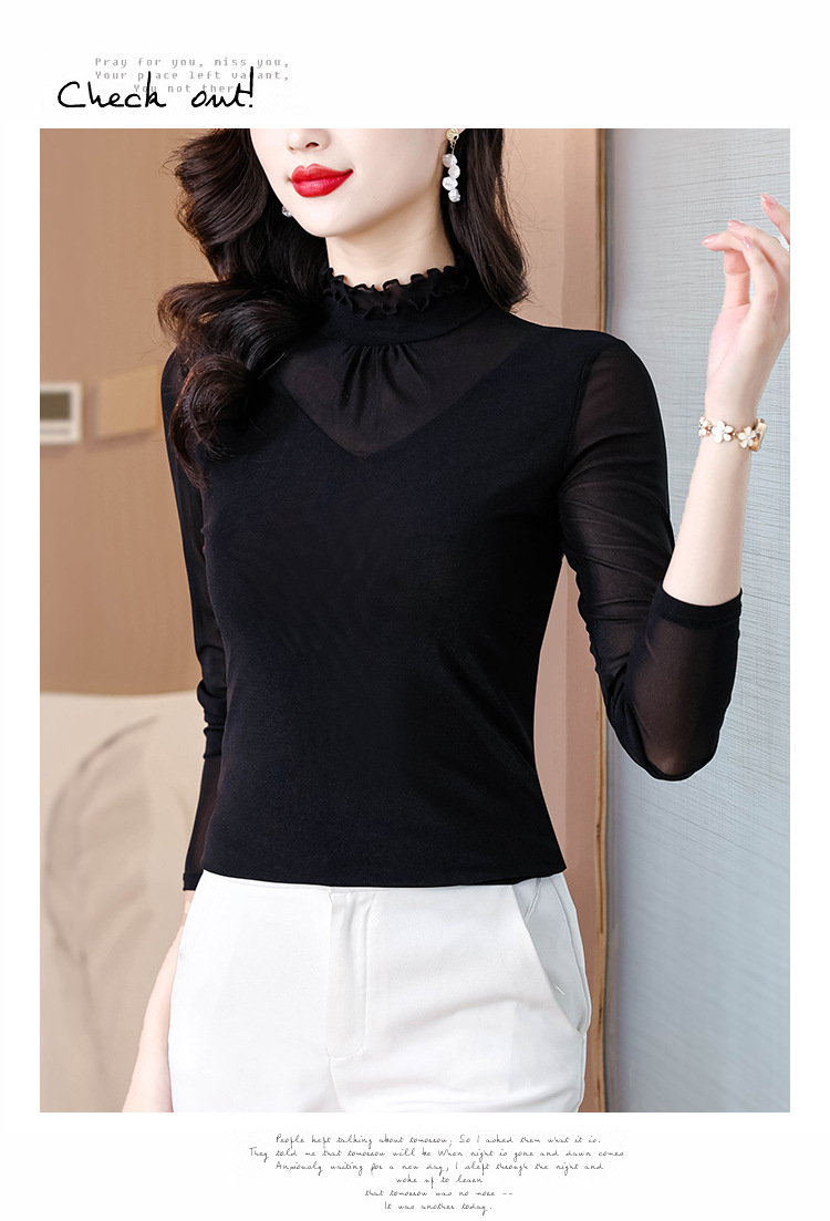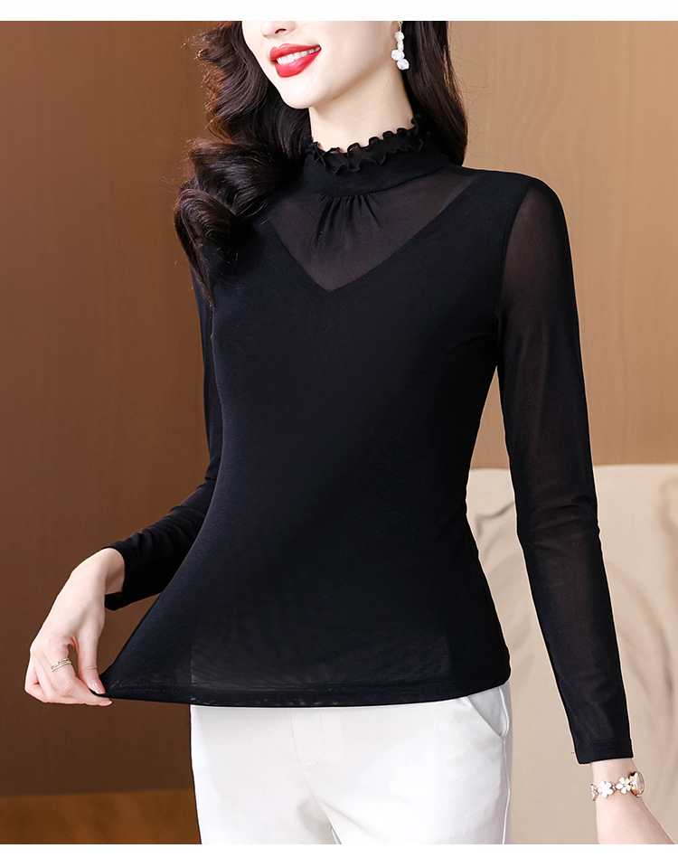2024 가을과 겨울 새로운 레이스 메쉬 러플 슬림 하이 칼라베이스 셔츠 슬림 슬림 티셔츠 헤어 세대
