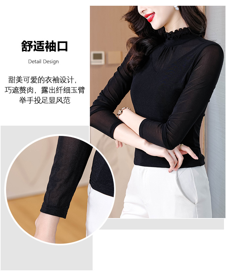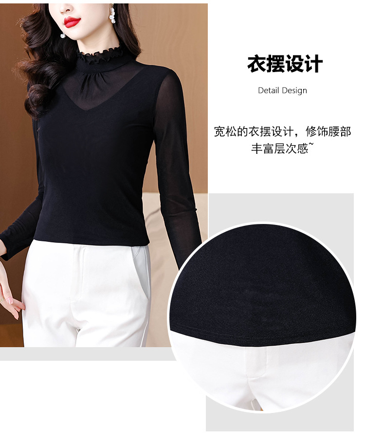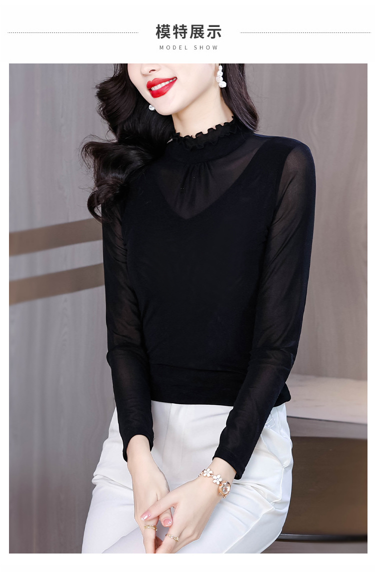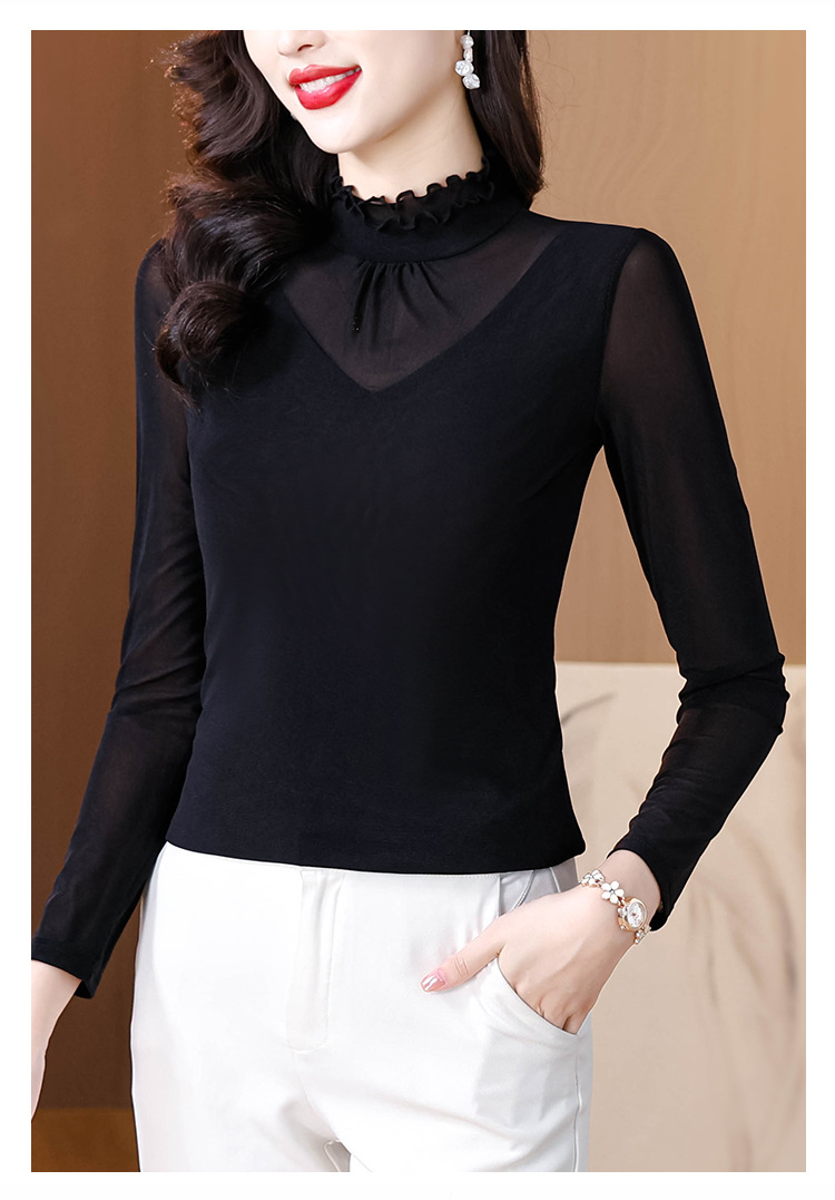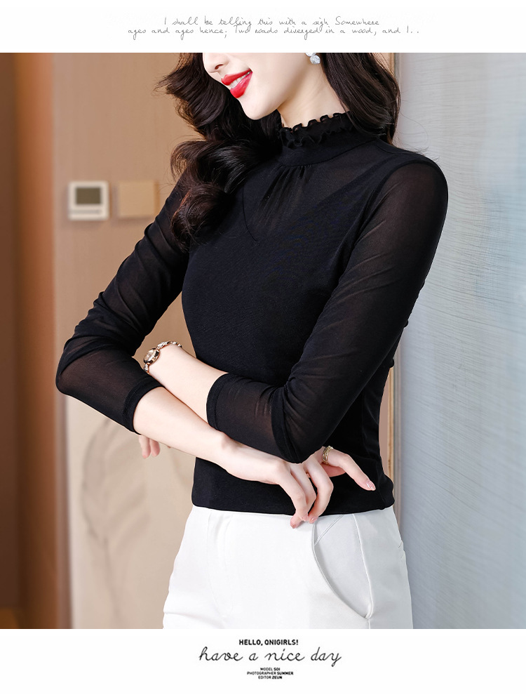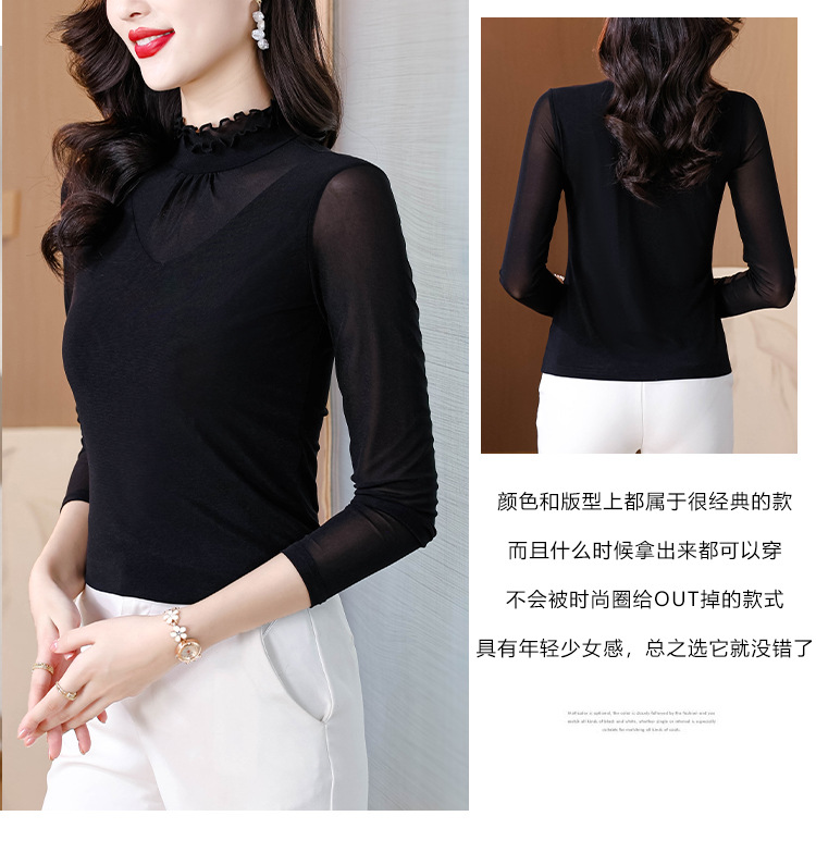 2024 가을과 겨울 새로운 레이스 메쉬 러플 슬림 하이 칼라베이스 셔츠 슬림 슬림 티셔츠 헤어 세대