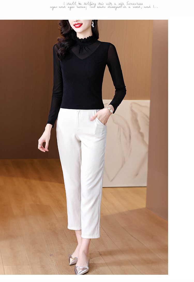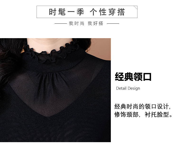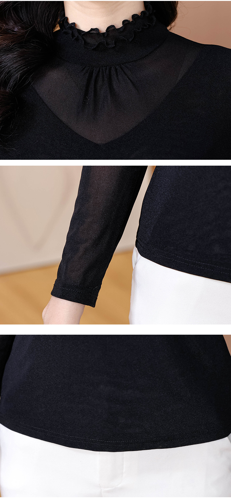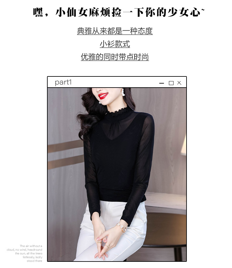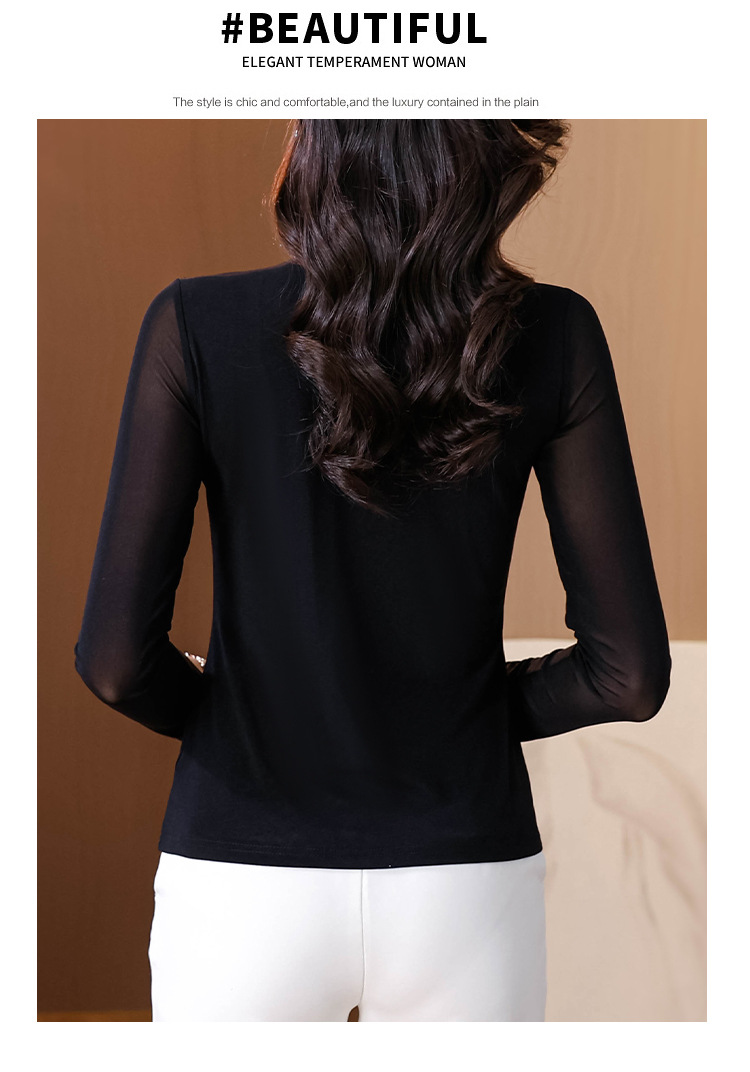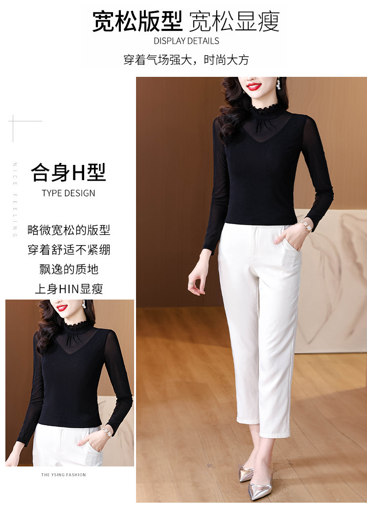 2024 가을과 겨울 새로운 레이스 메쉬 러플 슬림 하이 칼라베이스 셔츠 슬림 슬림 티셔츠 헤어 세대