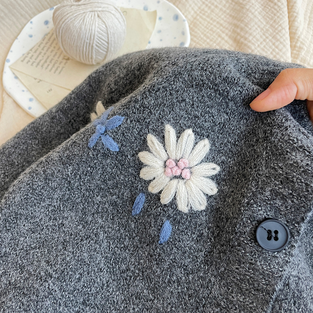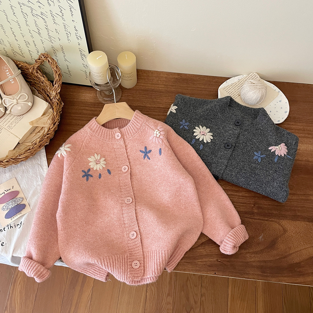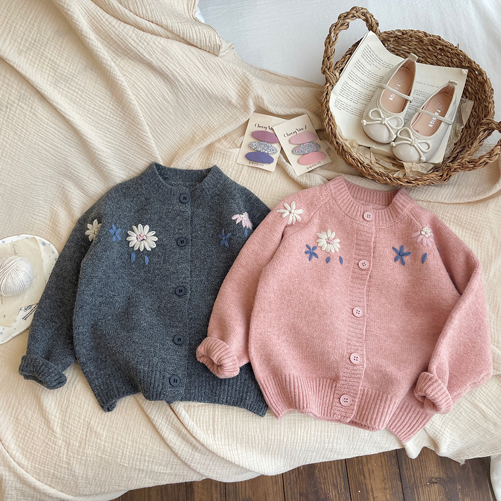 한국 아동복 2025 가을 신상 솔리드 컬러 스웨터 컬러풀한 크로셰 한국식 아우터 가디건 자수 스웨터 재킷스토어 가기