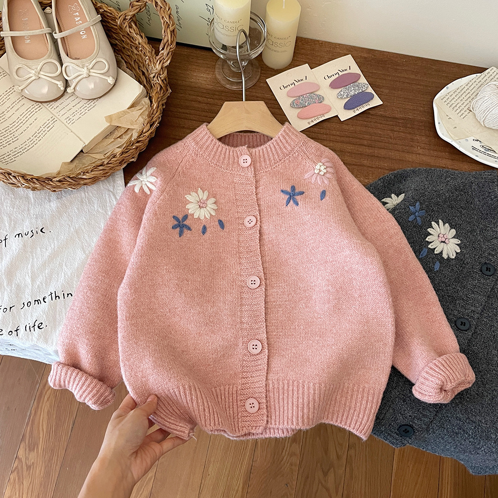 한국 아동복 2025 가을 신상 솔리드 컬러 스웨터 컬러풀한 크로셰 한국식 아우터 가디건 자수 스웨터 재킷