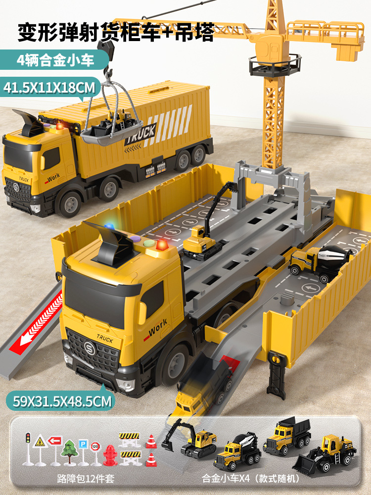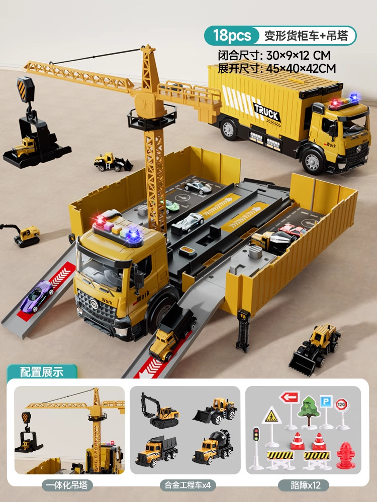 • [대형 트럭 + 행잉 타워] 엔지니어링 차량 4대 + 도로 표지판 12개 "선물 상자"
