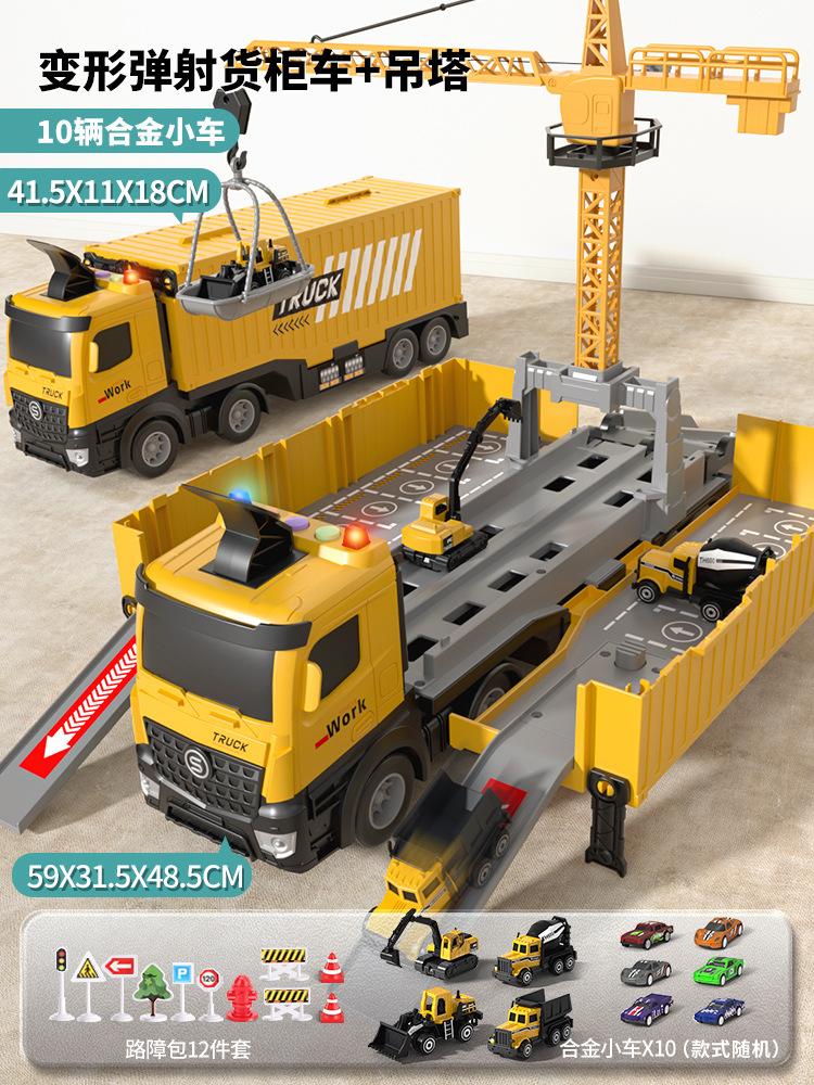 • "[대형 트럭 + 트랙 + 행잉 타워] 차량 10대 + 도로 표지판 12개 ""선물 상자""."