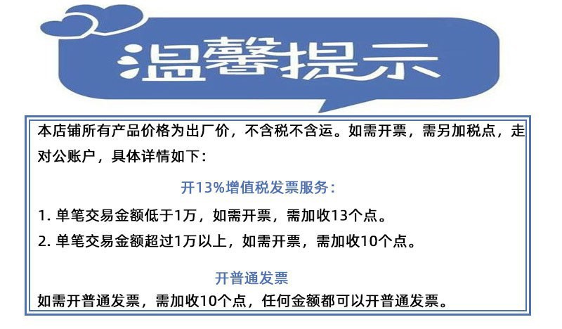 客户可在该店铺查看产品详细信息和参考价格,确认产品后再联系我们工作人员为您报价。如果是客户自己的款式,能提供实物样品以便我们核算更为准确的价格,因为看图报价只是估算大概价格,价格还得以样品为准。一般报价不含税,如需税票,普税加3个点,增值税加10个点。
