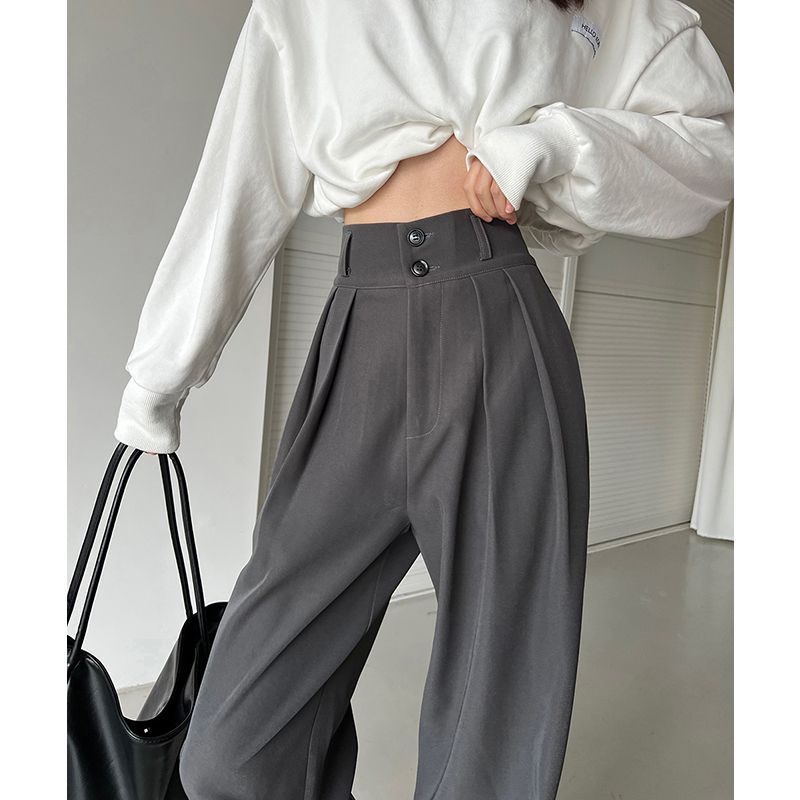 봄과 가을 회색 넓은 다리 바지 여성용 배 모양의 바지 높은 허리 데프 캐주얼 루즈 토핑 바지 Zhilanzhi