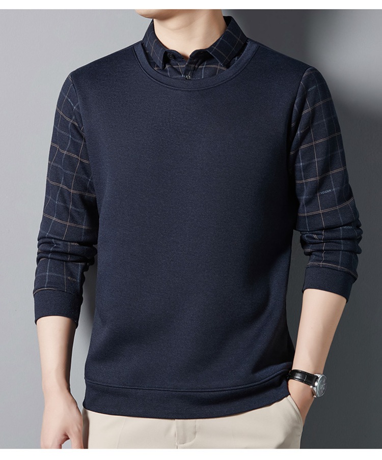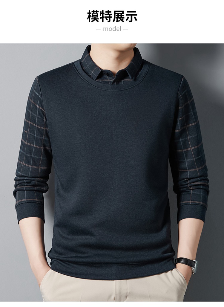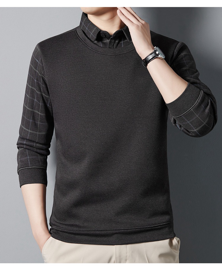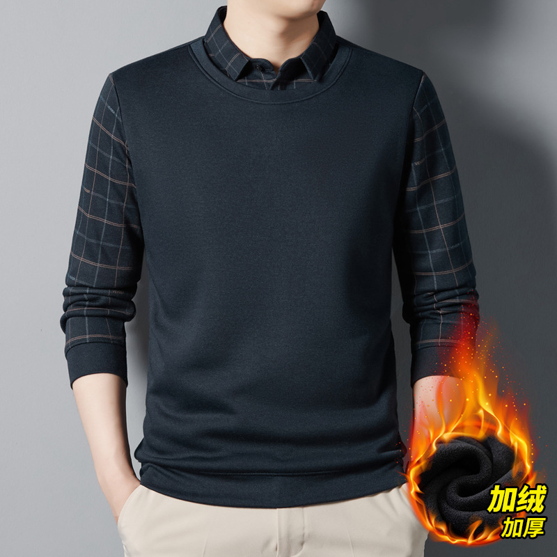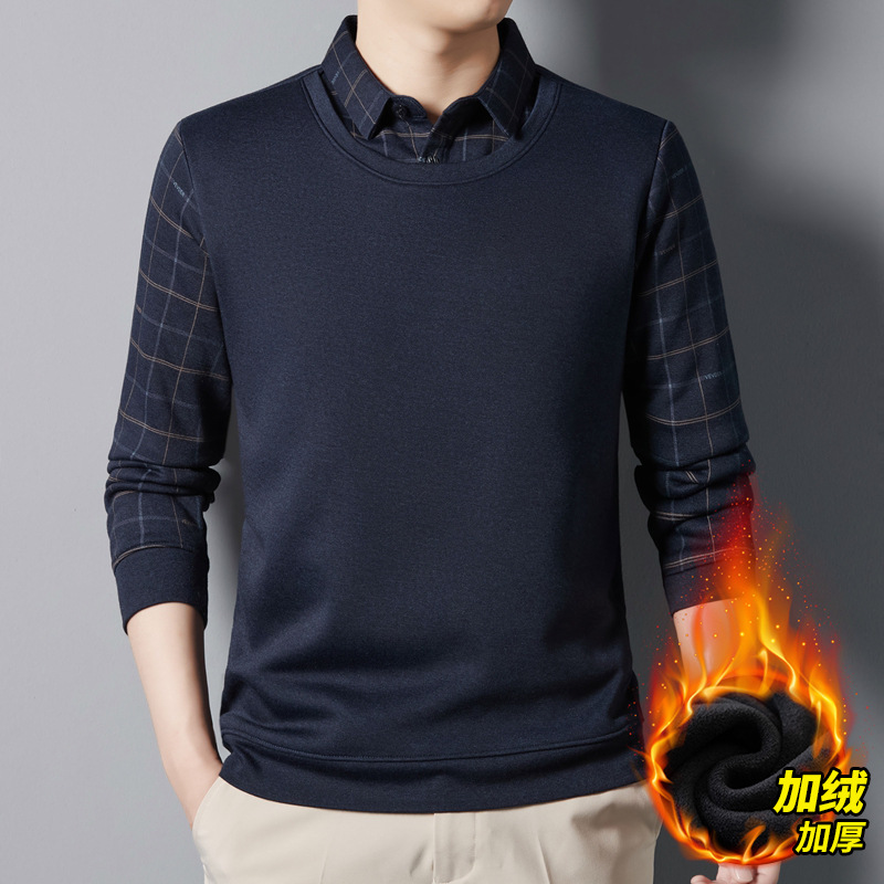 가을과 겨울 기모 두꺼운 가짜 투피스 스웨터 패션 셔츠 칼라 따뜻한 남성베이스 셔츠 체크 무늬 스티칭 폴로 셔츠
