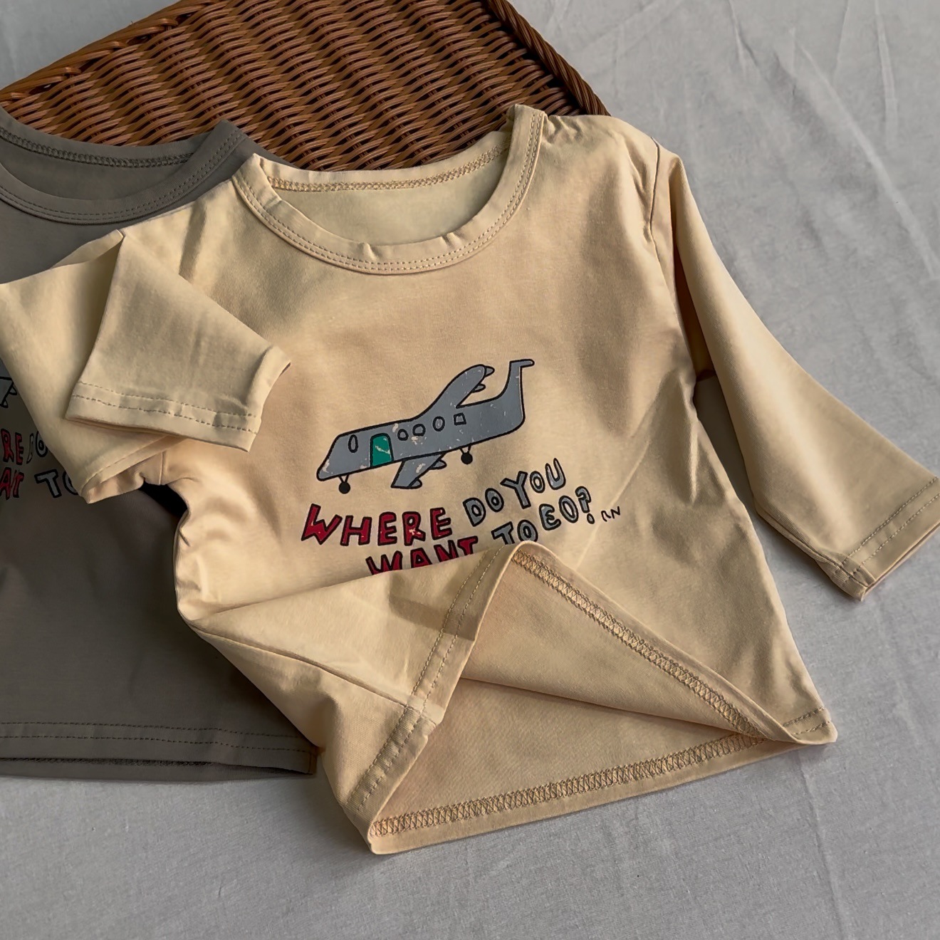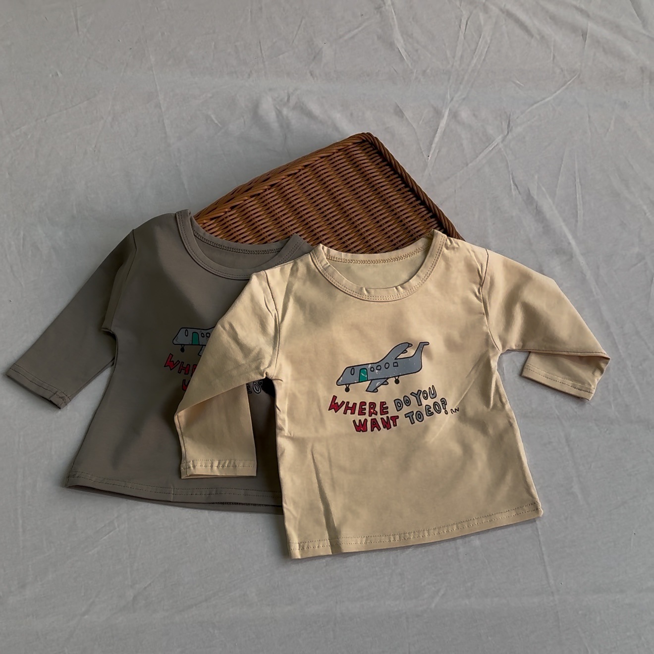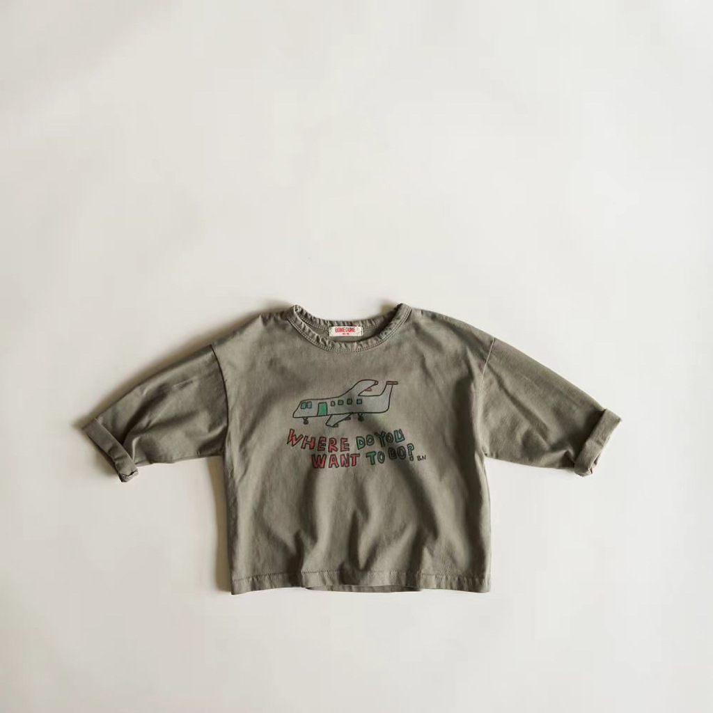 소년 소녀를위한 새로운 느슨한 한국식 탑 봄과 가을 긴팔 티셔츠 항공기 패턴 인쇄스토어 가기