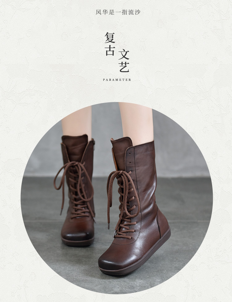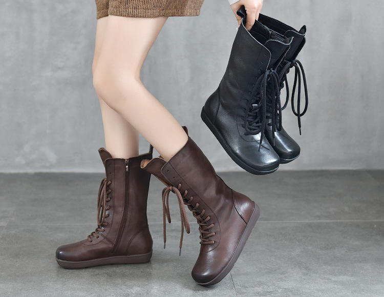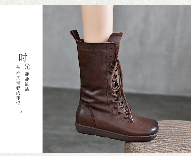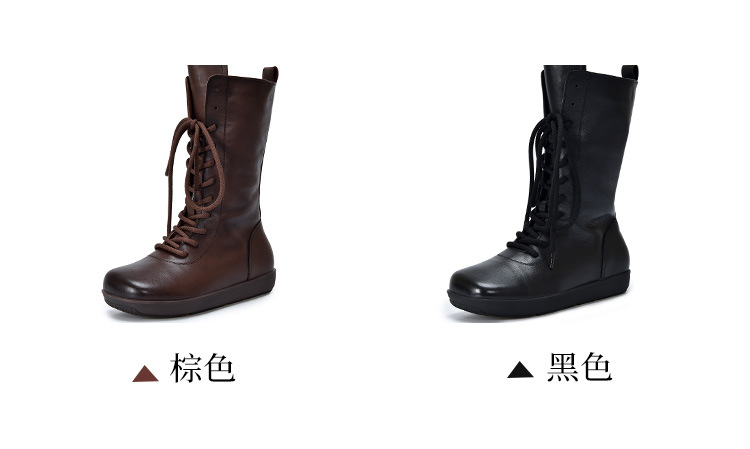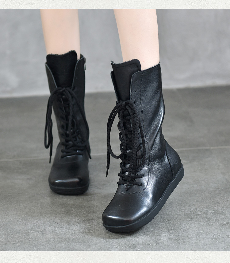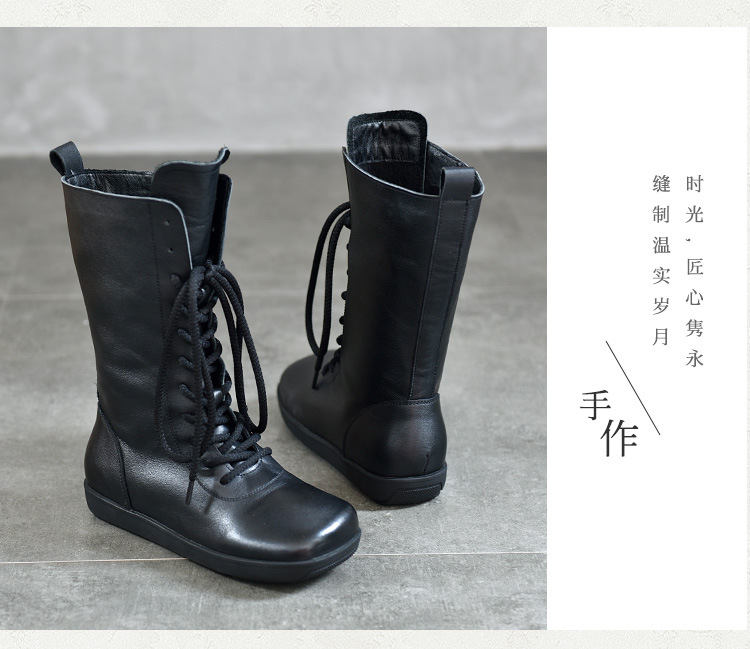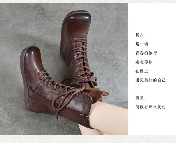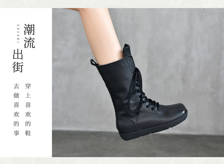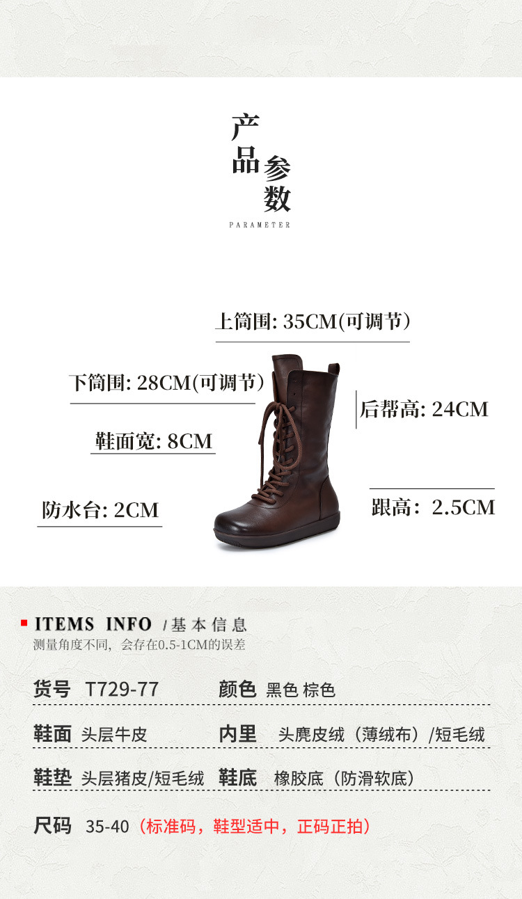【특가 185】천연 소가죽 중간 길이 부츠 여성용 가죽 부츠 사각코 마틴 부츠 플러스 벨벳 코튼 부츠