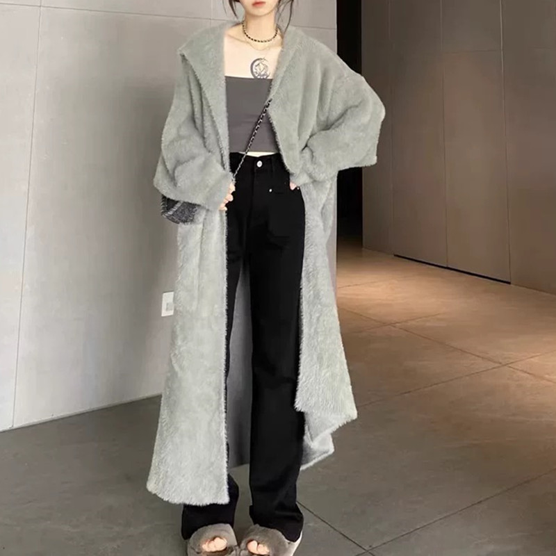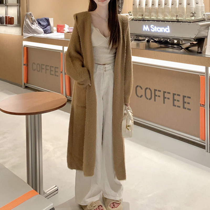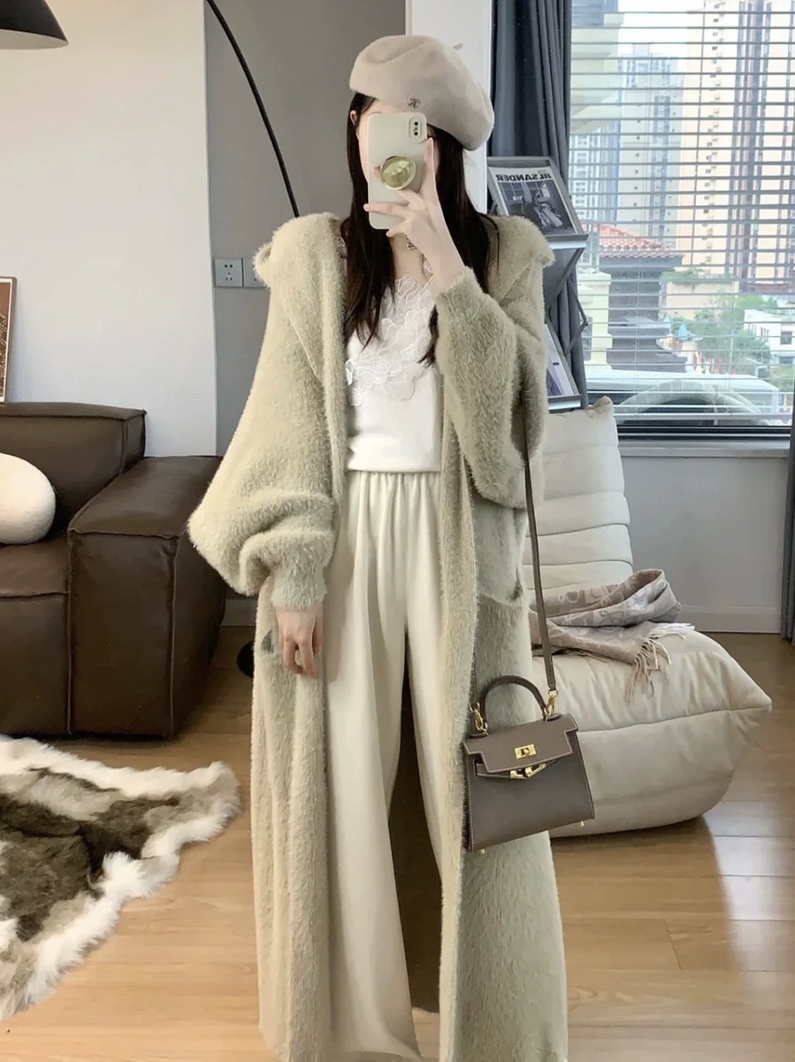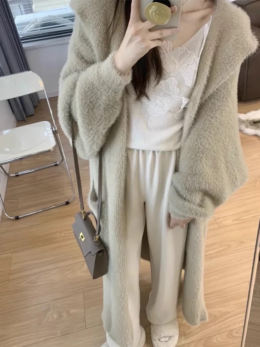 게으른 스타일 흰색 긴 스웨터 코트 여성의 가을과 겨울 모방 밍크 벨벳 느슨한 후드 오버 무릎 니트 카디건
