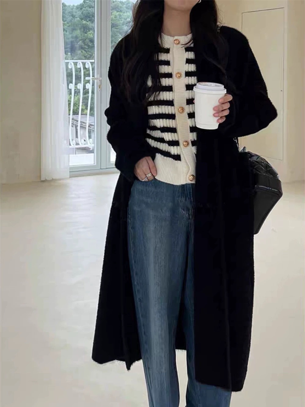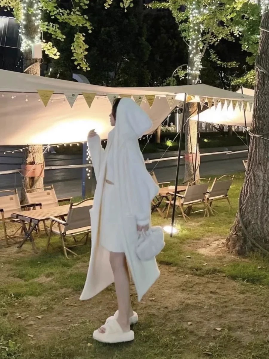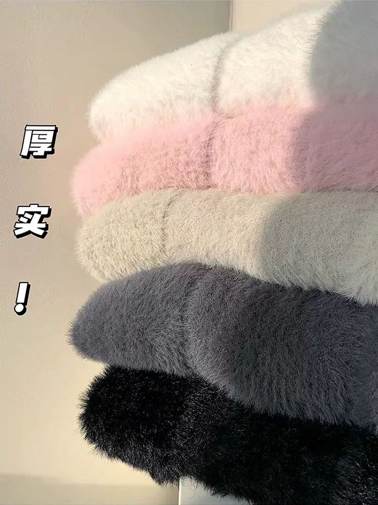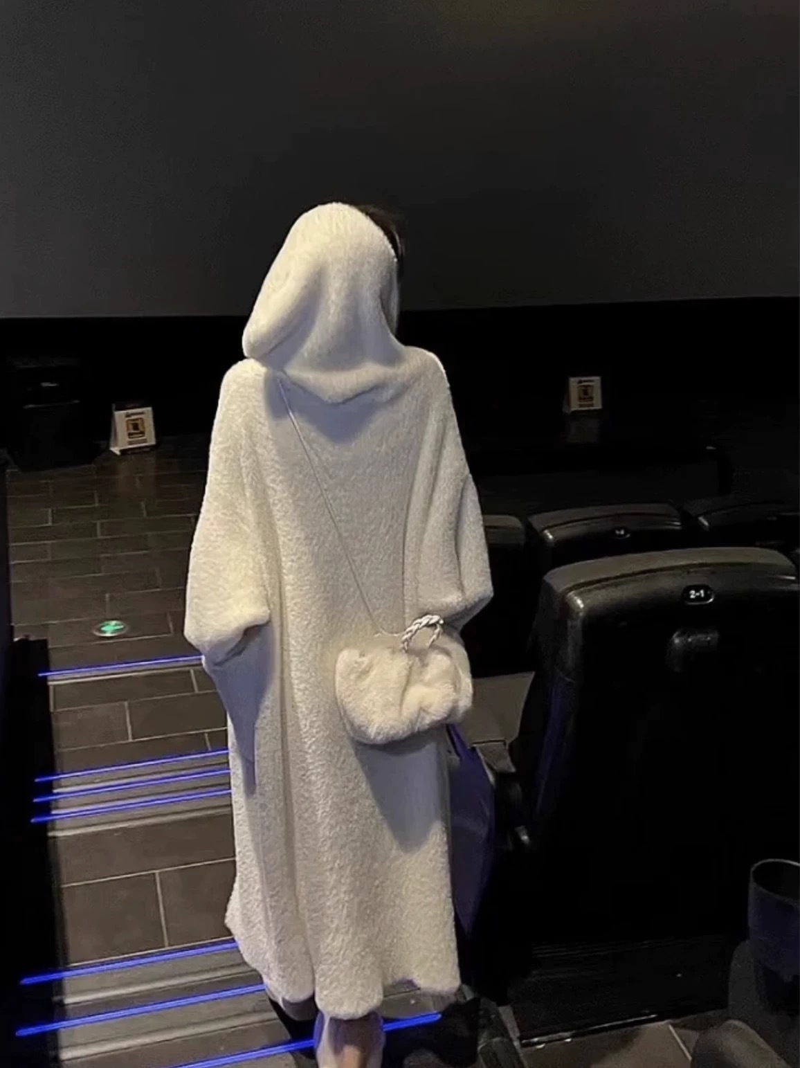 게으른 스타일 흰색 긴 스웨터 코트 여성의 가을과 겨울 모방 밍크 벨벳 느슨한 후드 오버 무릎 니트 카디건