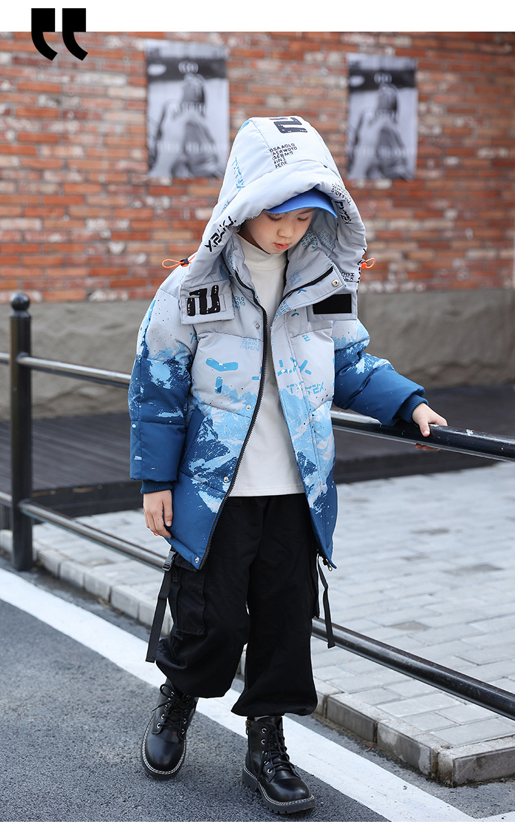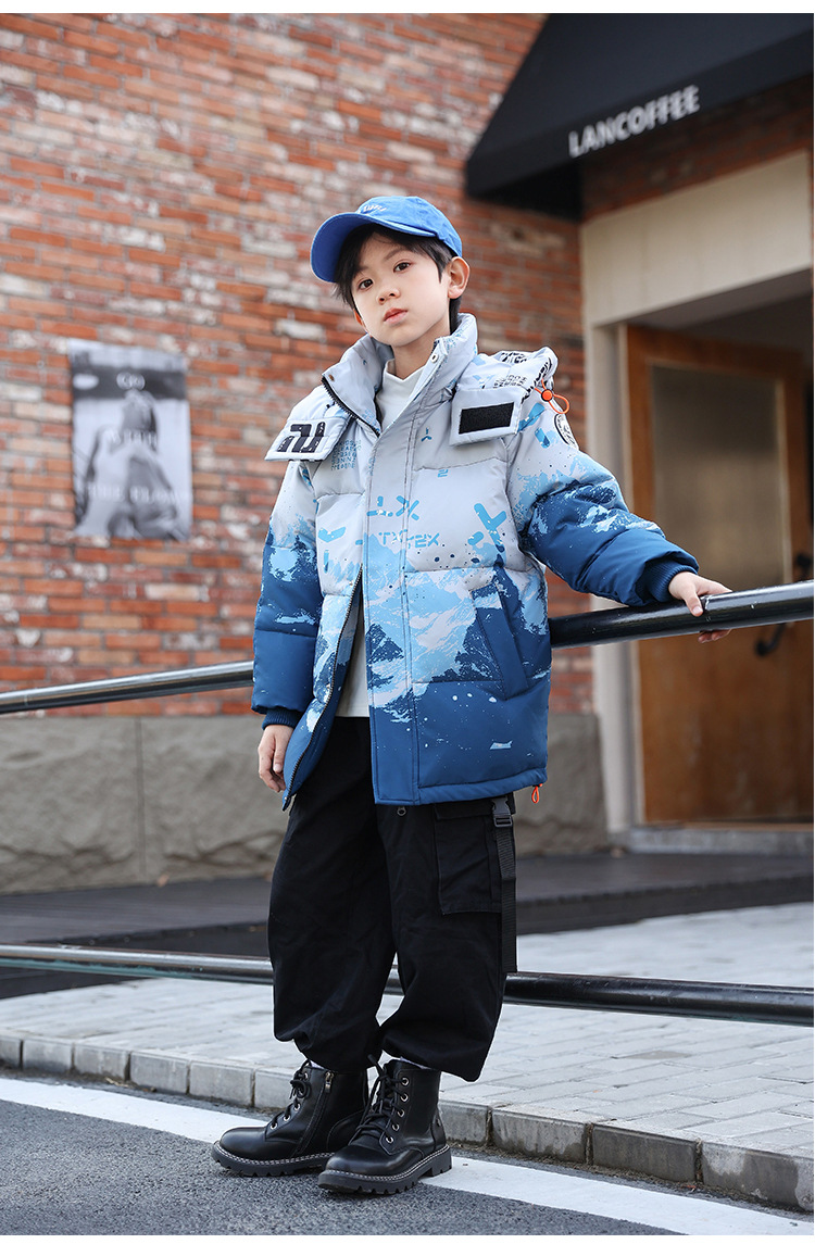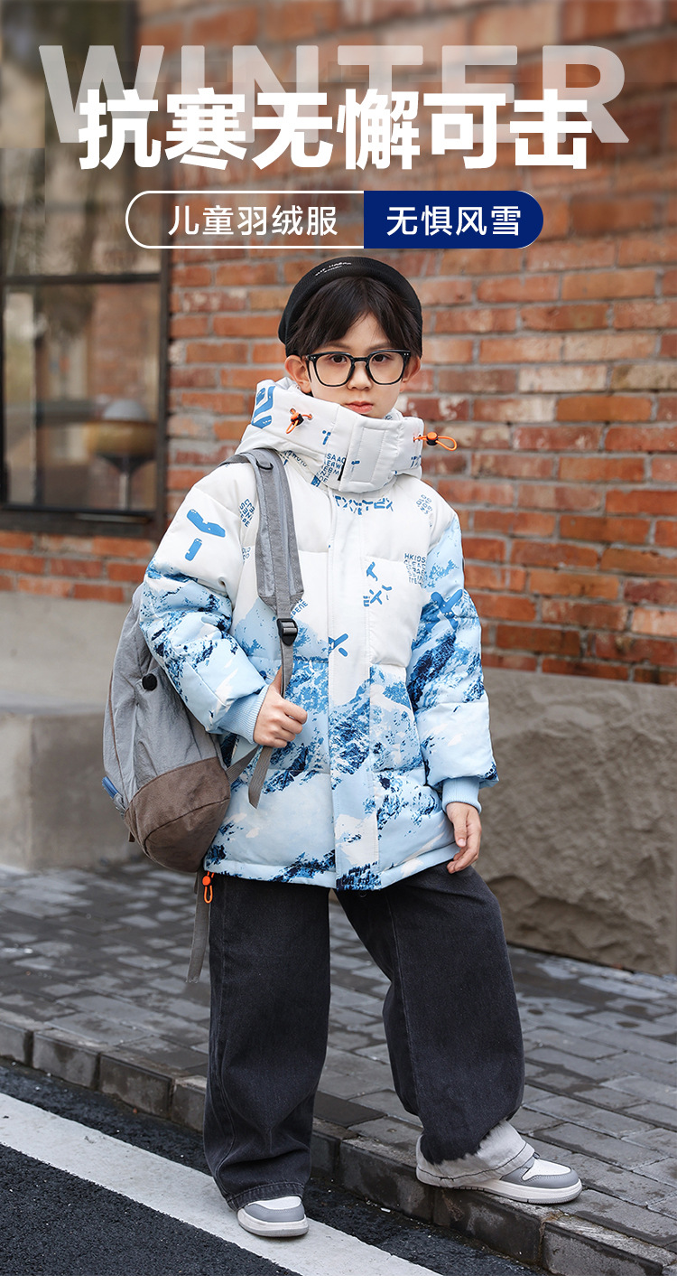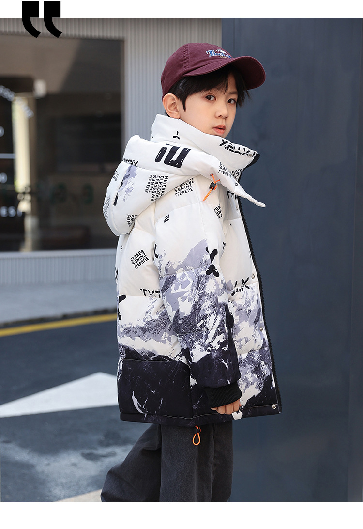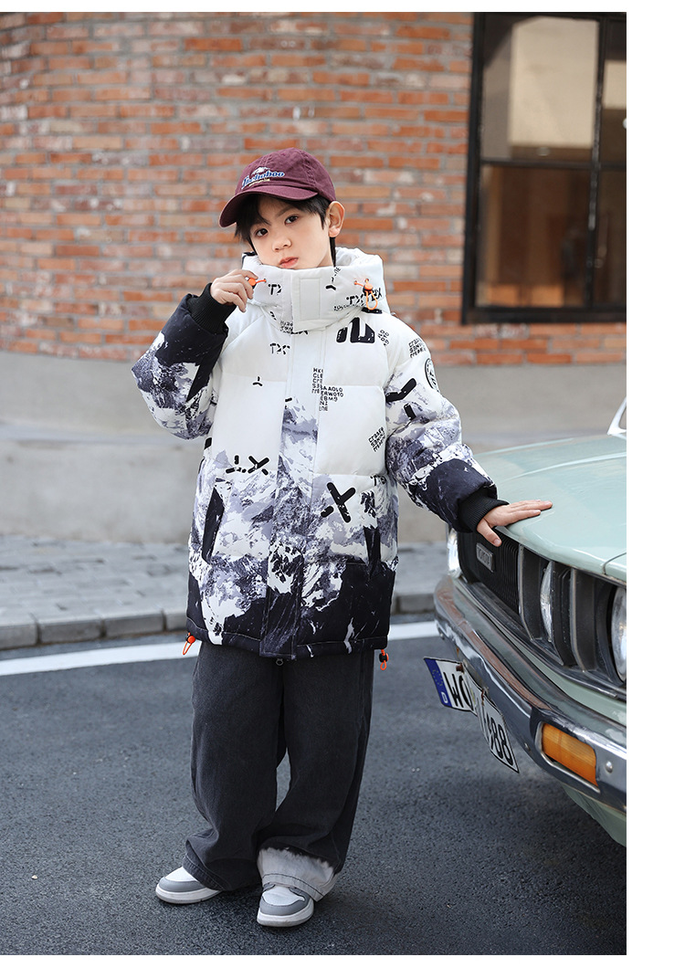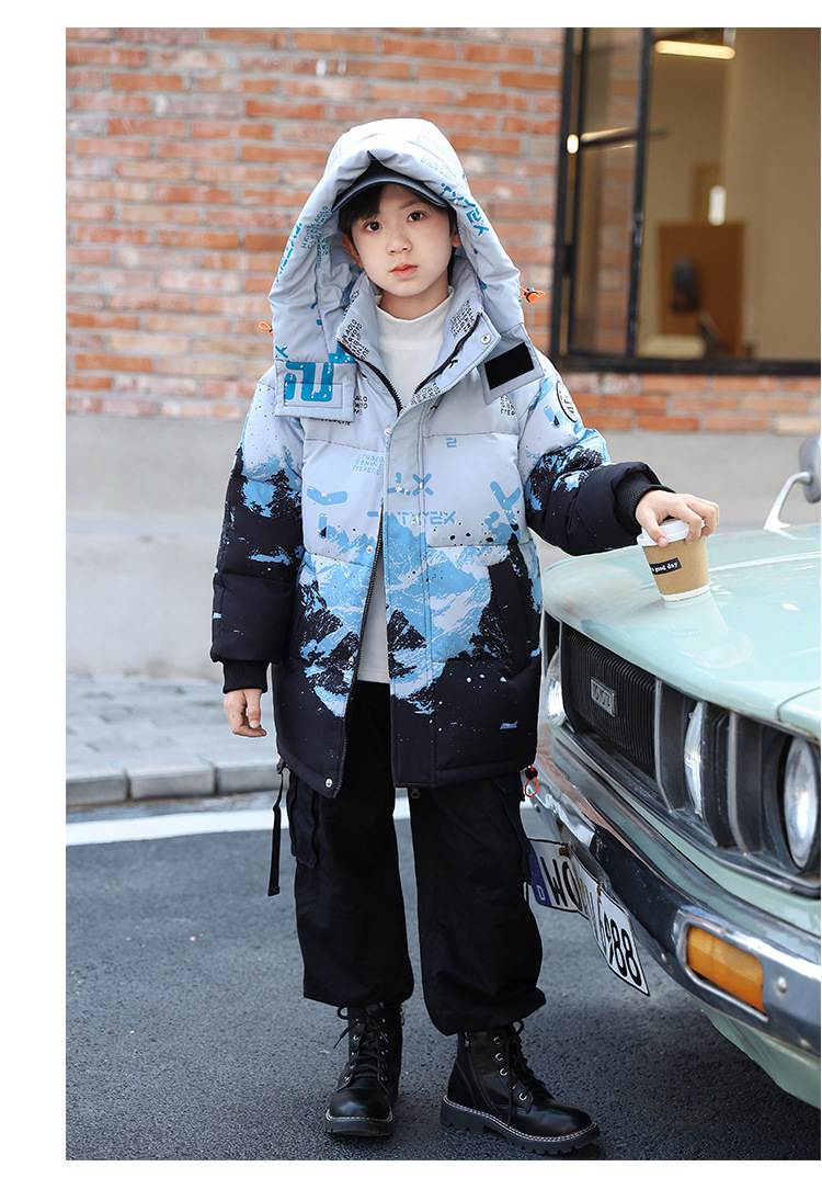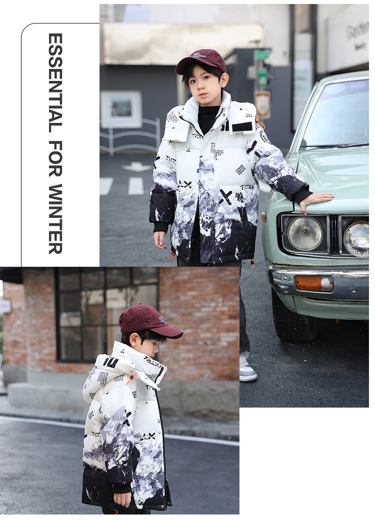 어린이 착용 소년 다운 재킷 2023 년 중반 겨울 착용 새로운 스타일 중대형 어린이 흰색 오리 두꺼운 따뜻한 재킷 트렌디스토어 가기