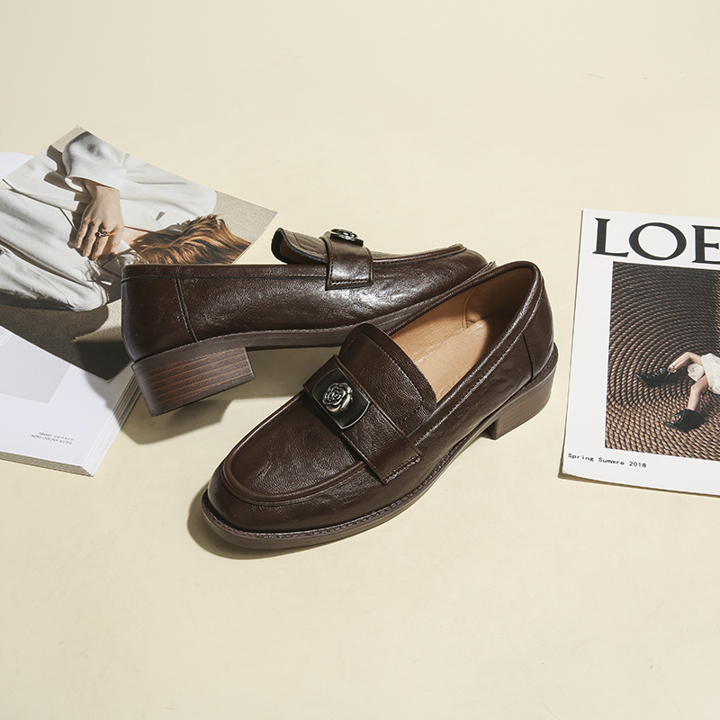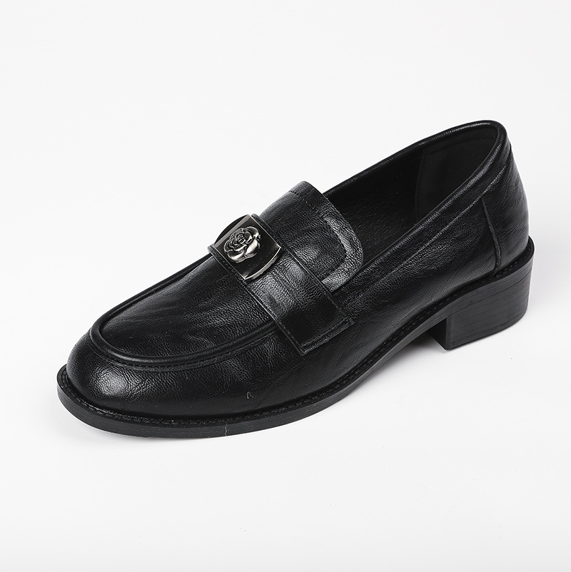 새로운 두꺼운 밑창 로퍼 여성 정품 가죽 신발 싱글 레이어 신발 여성용 두꺼운 슬립 온 신발 금속 버클 동백