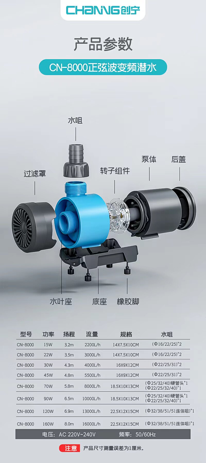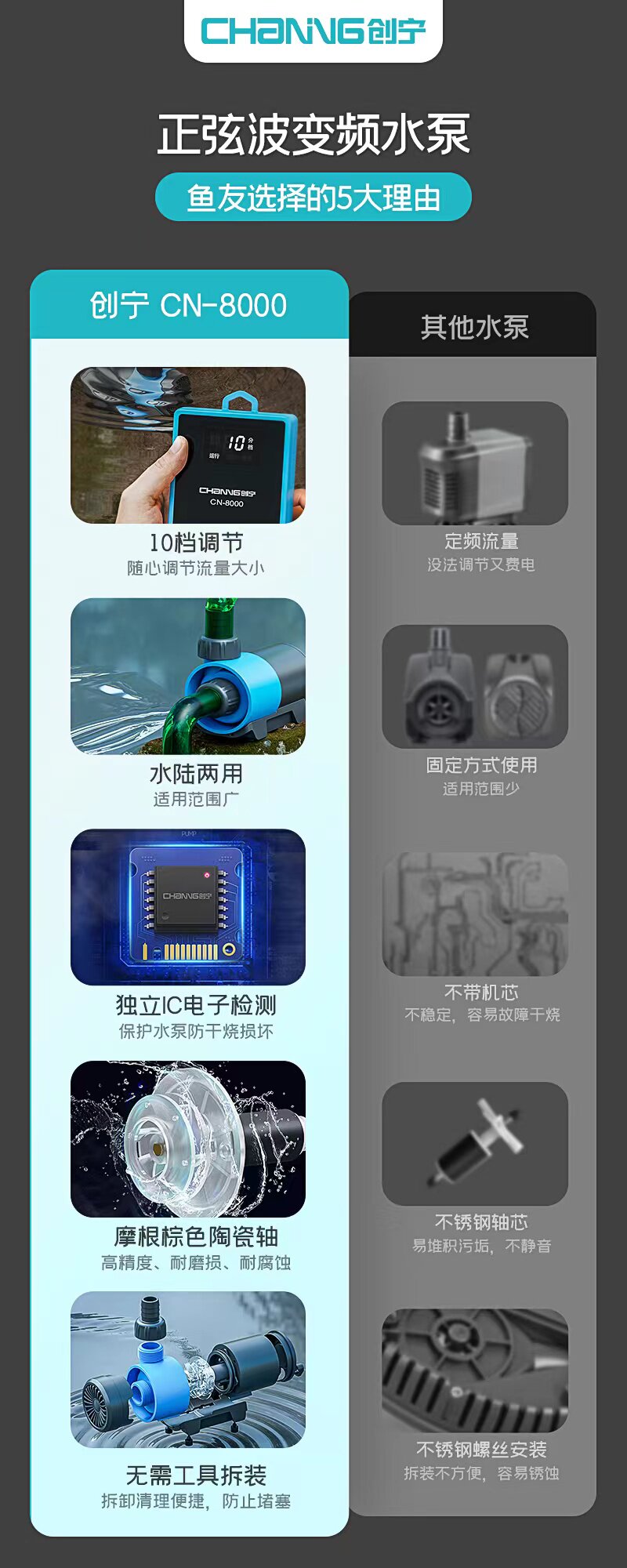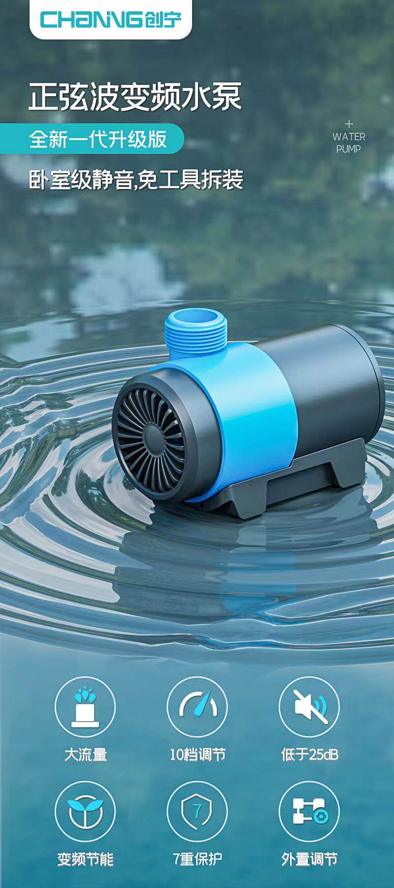 Chuangning 가변 주파수 워터 펌프 매우 조용한 어항 펌핑 어풀 잠수정 펌프 수륙 양용 여과 순환 해수 소형 펌프