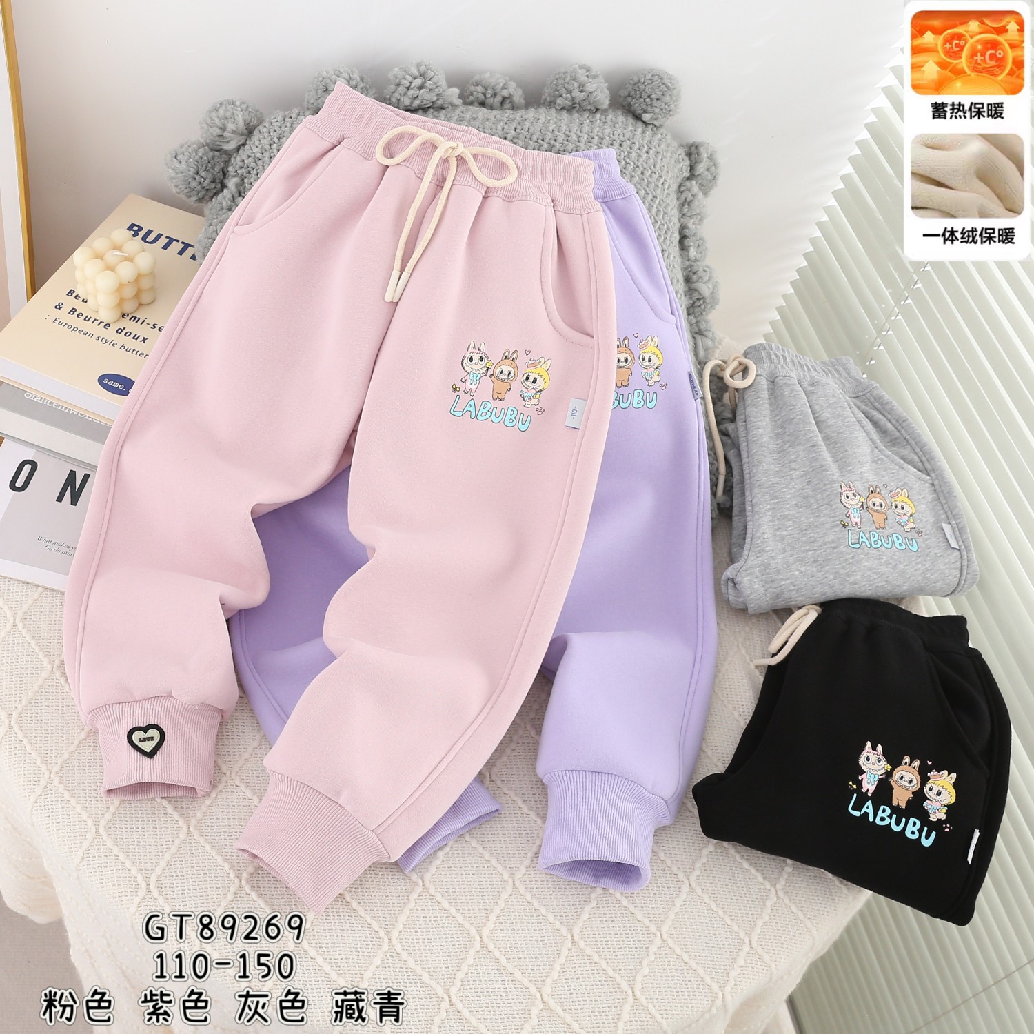 2024 소년 소녀를위한 겨울 어린이 기모 스포츠 바지 한국식 편지와 아오 그레인 양털 캐주얼 바지 스웨트 팬츠