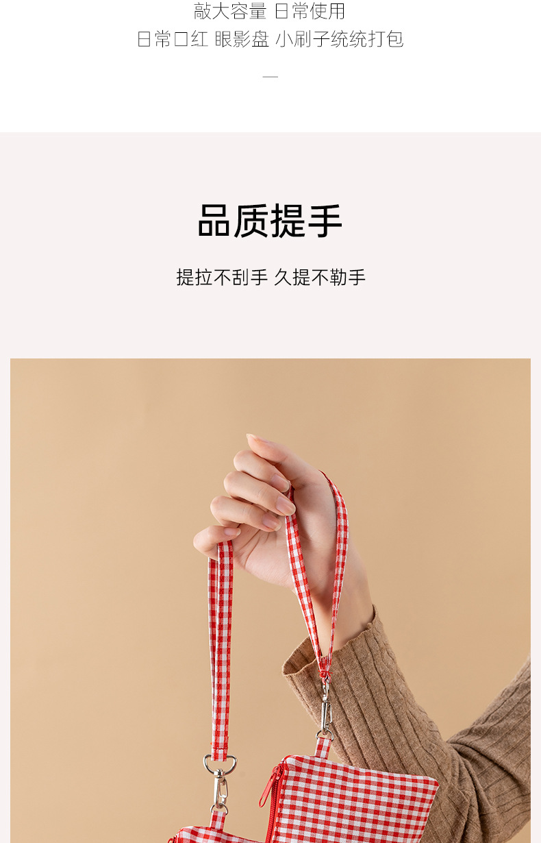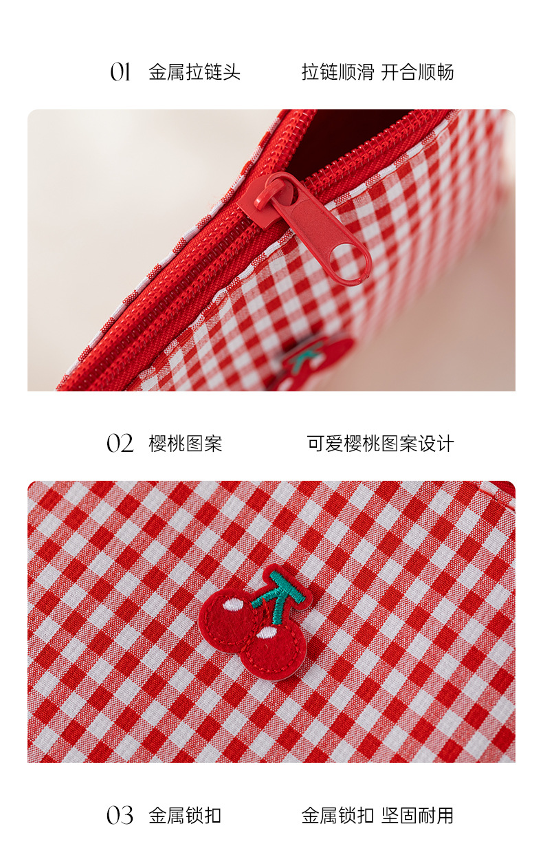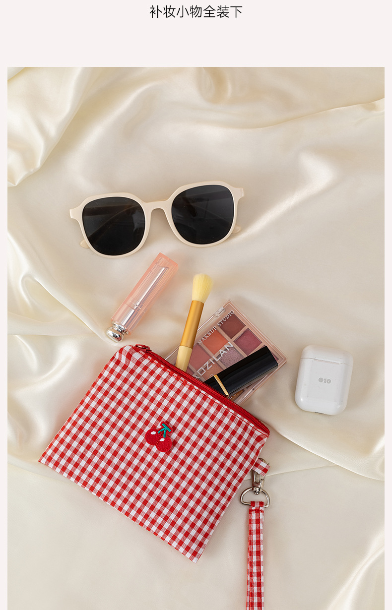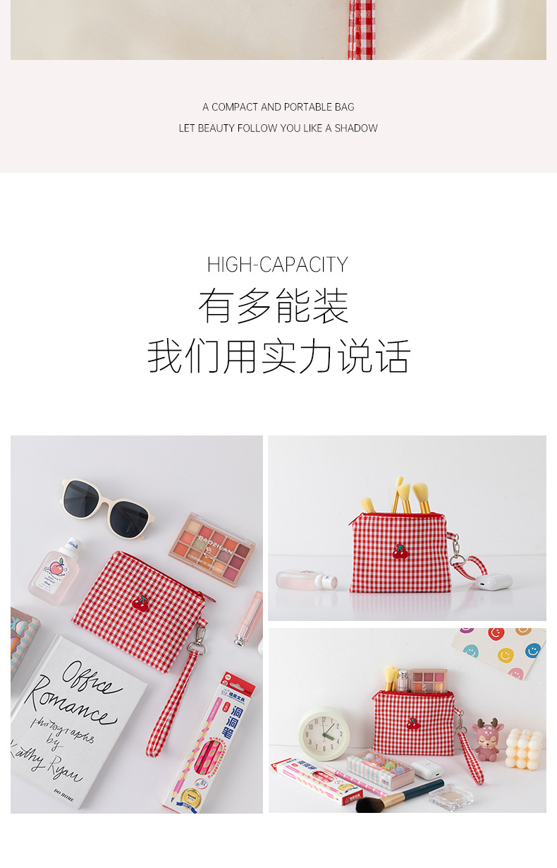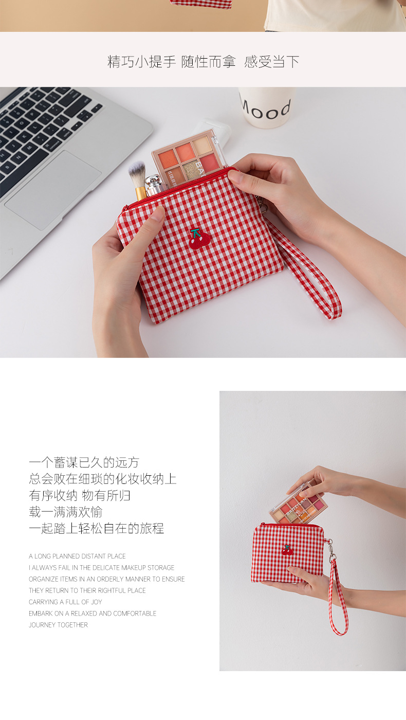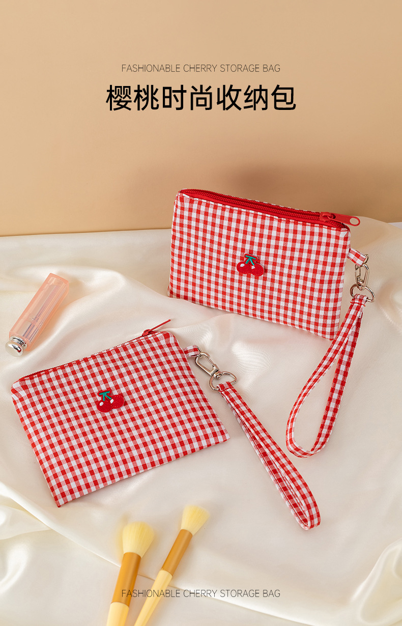 자수 체리 귀여운 화장품 가방 휴대용 빨간 격자 무늬 대용량 화장품 손 립스틱 보관 가방