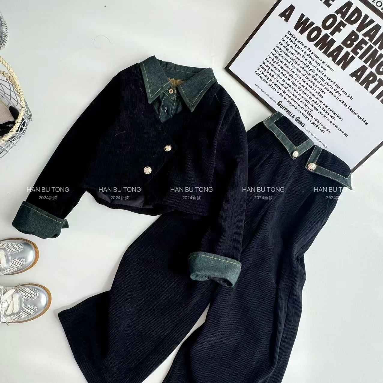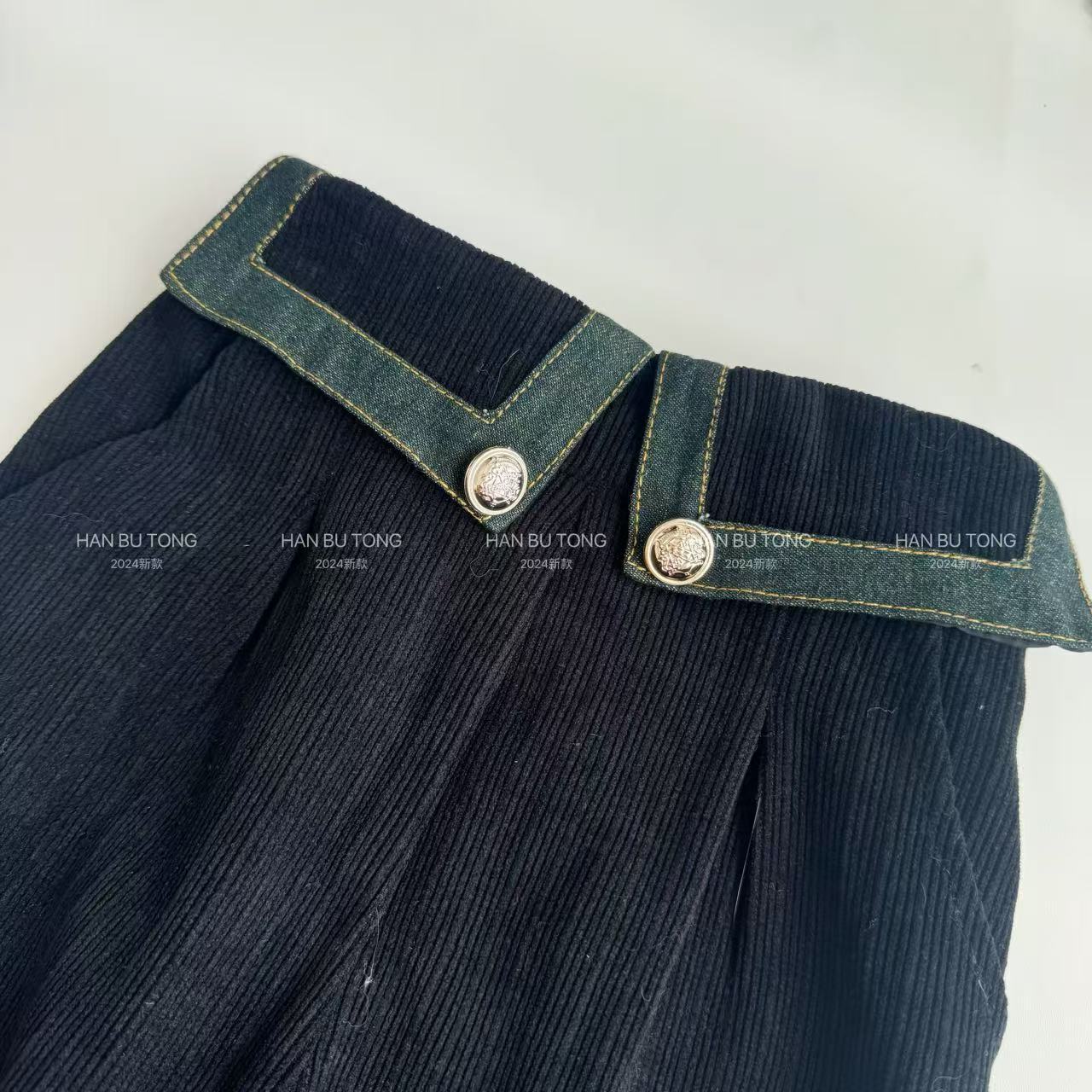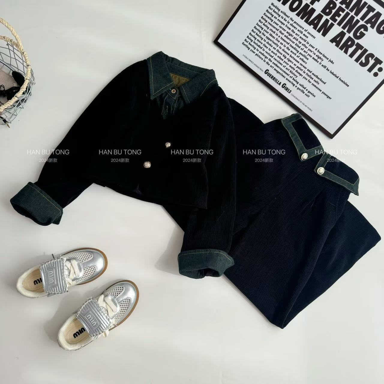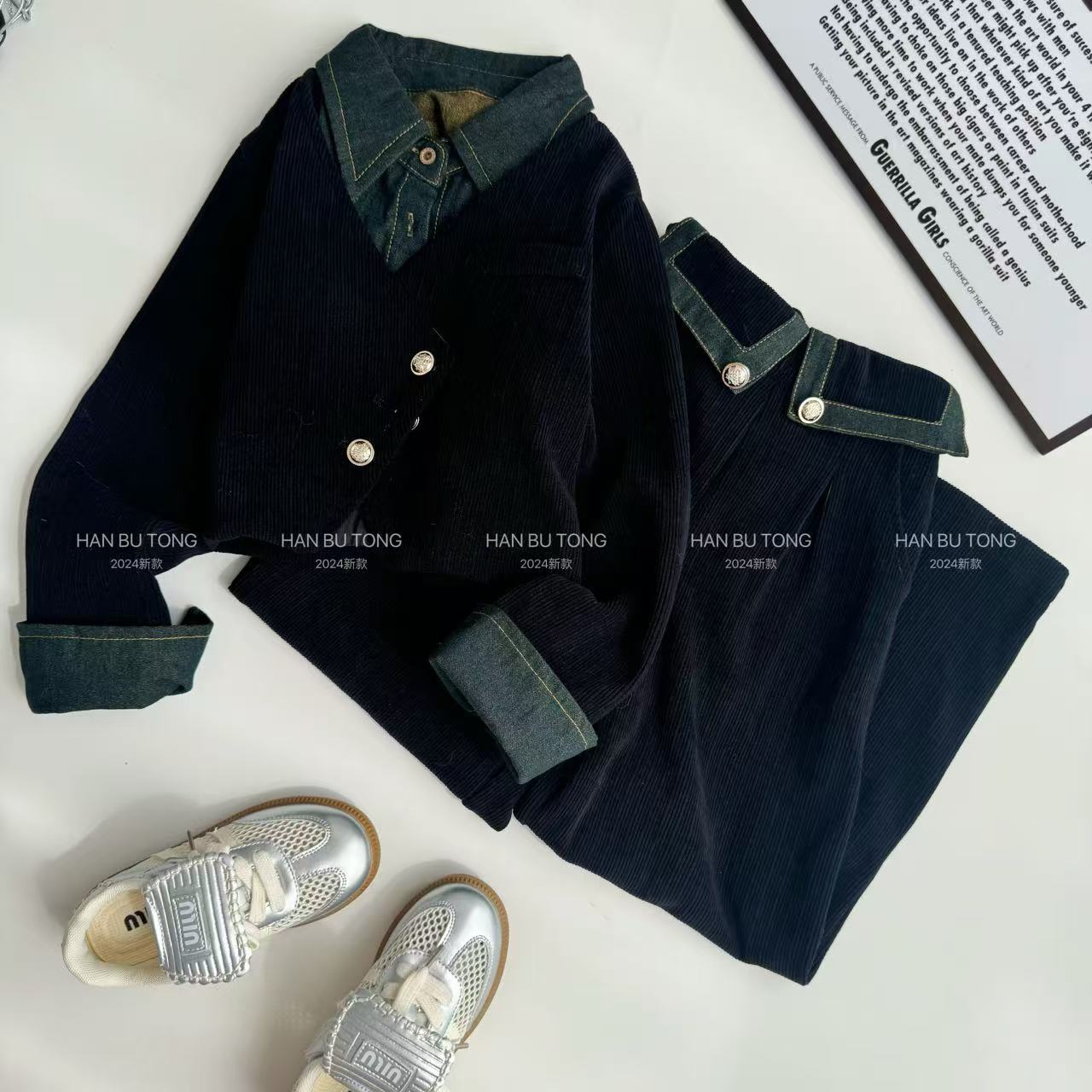 여자 2024 가짜 투피스 탑 코듀로이 하이 웨이스트 바지 다리 바지 투피스 세트 틈새 레트로 프랑스 하이 엔드 센스