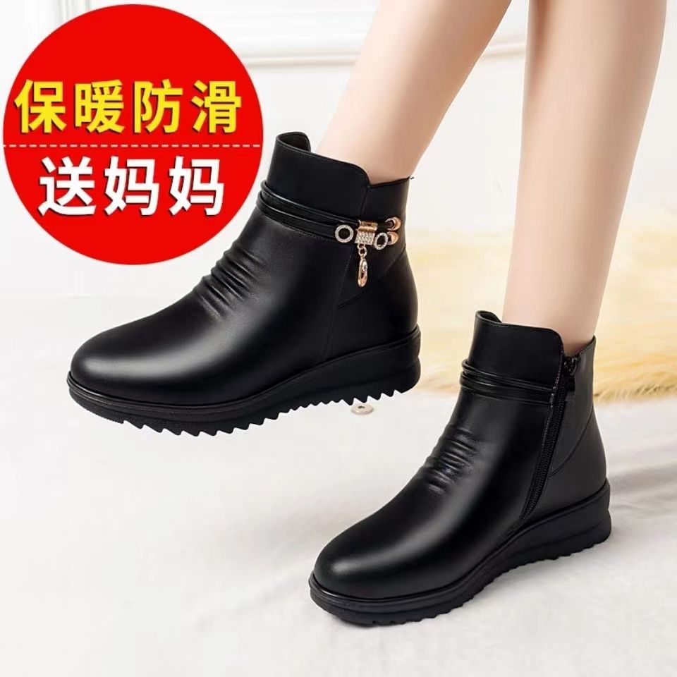내부 높이 쐐기 여성용 가죽 부츠 두꺼운 밑창 편안한 기모 엄마 신발 2024 겨울 짧은 튜브 올 매치 코튼 신발 방수스토어 가기