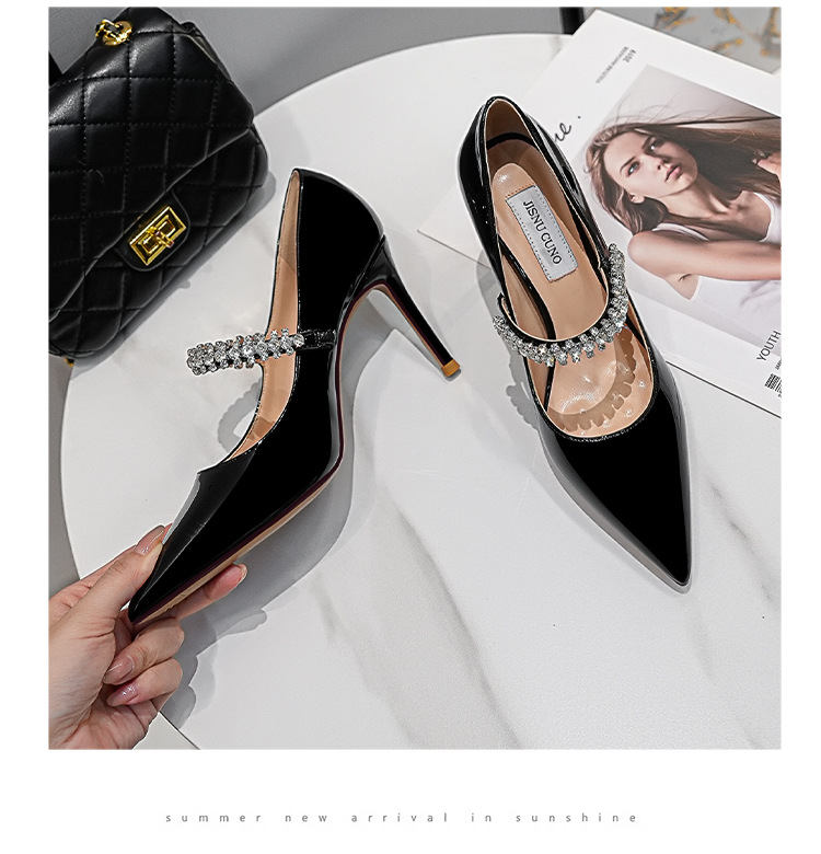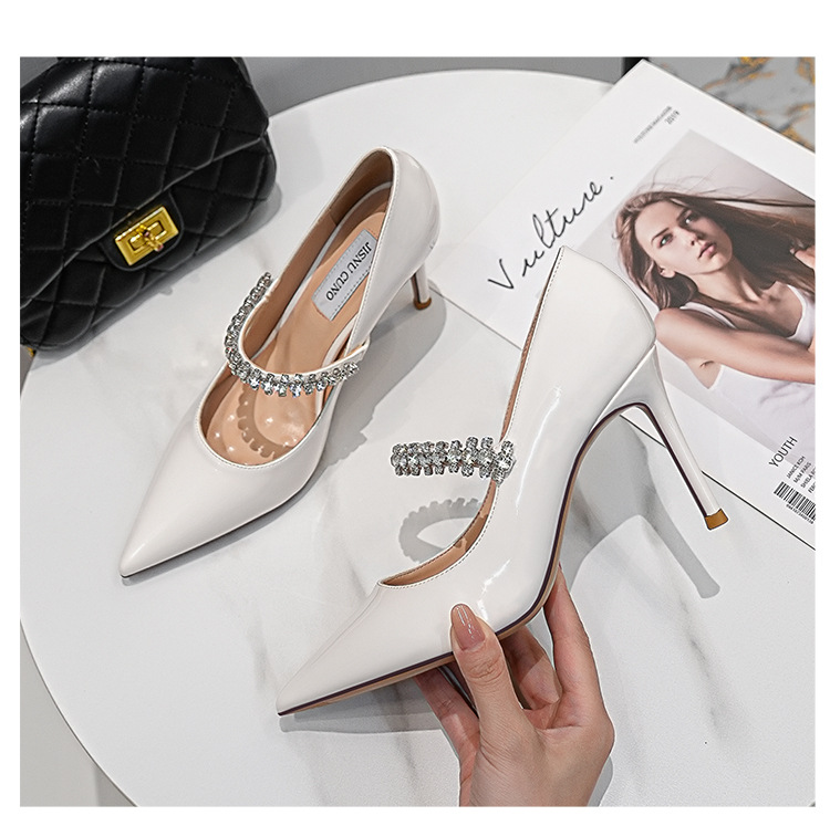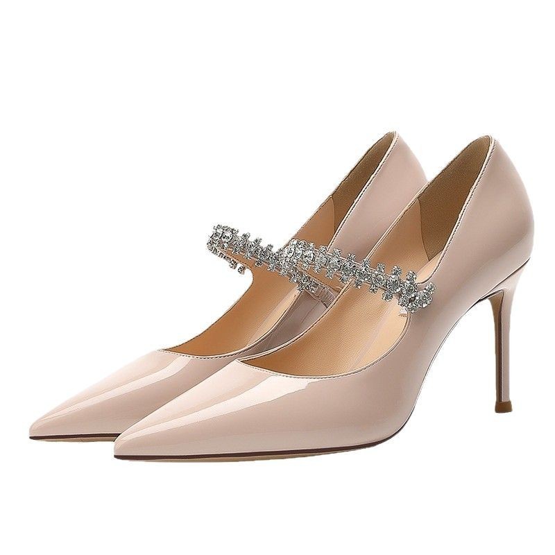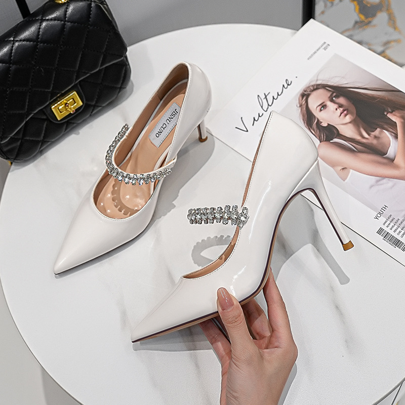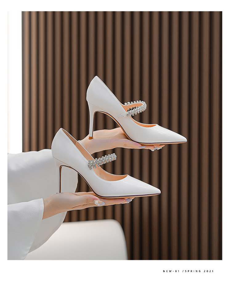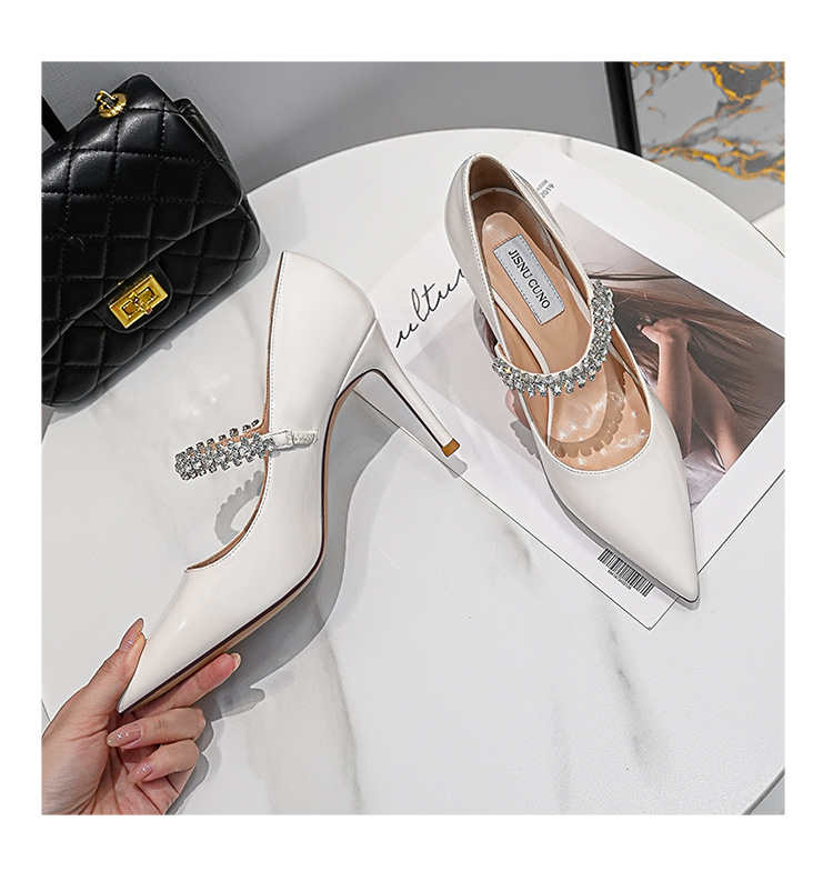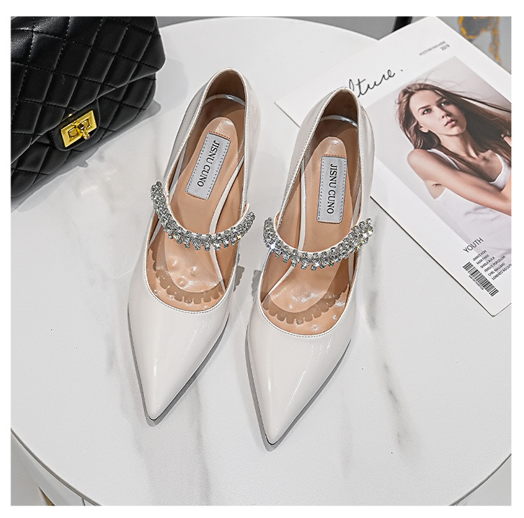 2025년 가을 신상 프랑스 라인스톤 포인티드 토 화이트 메리제인 하이힐, 여성용 슬림 힐, 우아한 페이턴트 가죽 슈즈스토어 가기