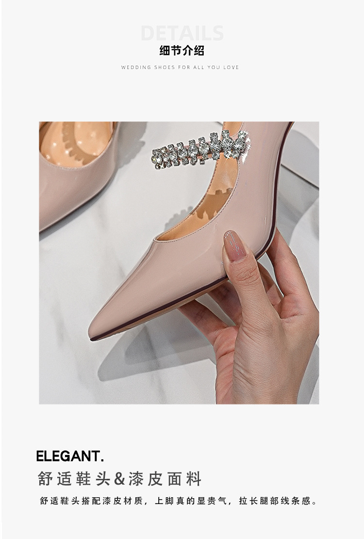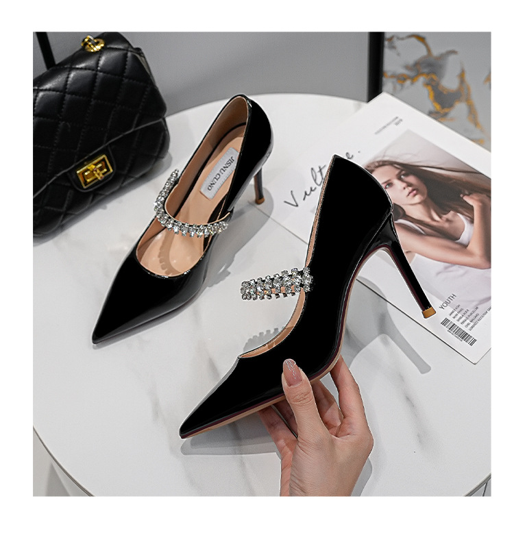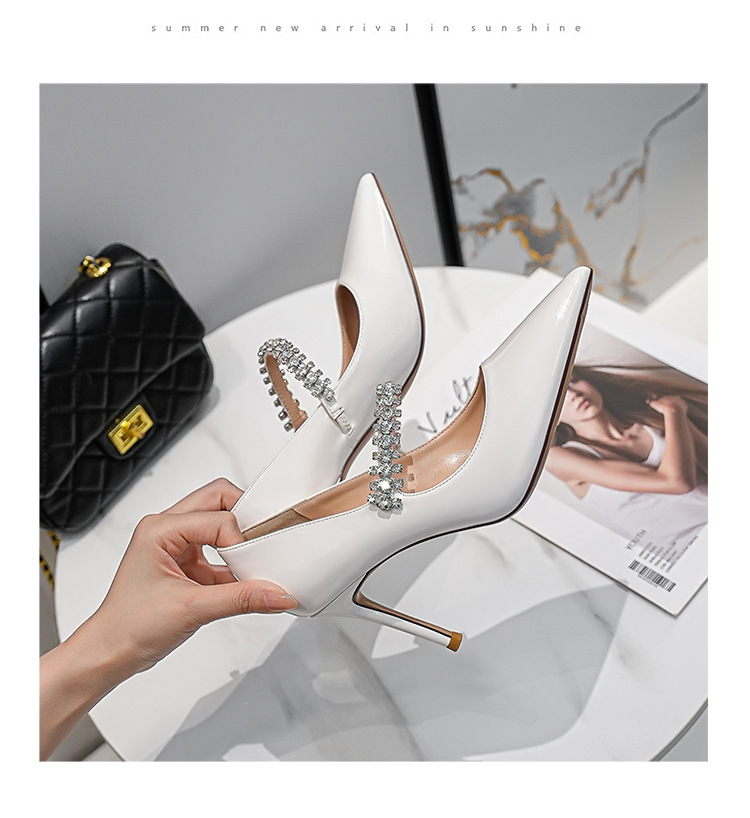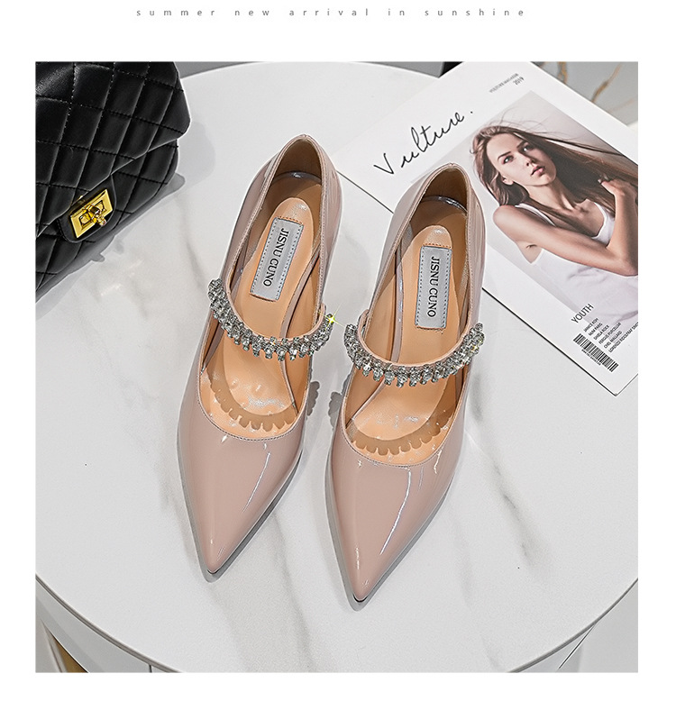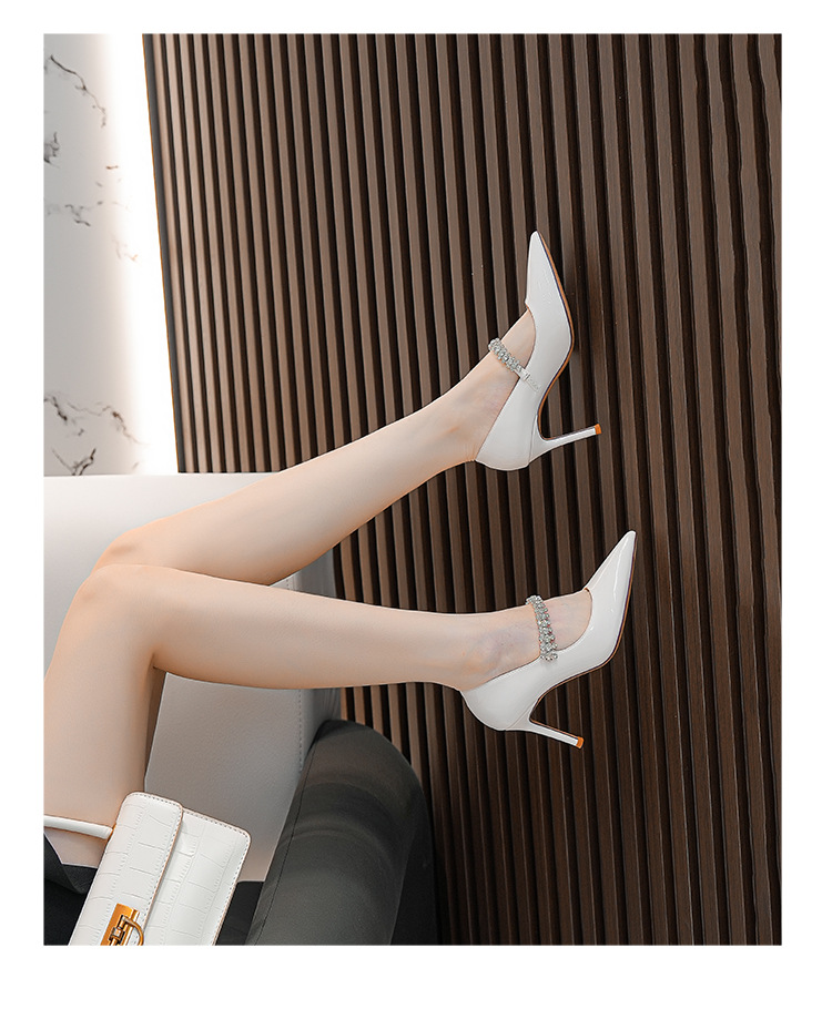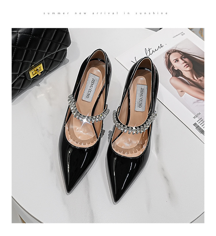 2025년 가을 신상 프랑스 라인스톤 포인티드 토 화이트 메리제인 하이힐, 여성용 슬림 힐, 우아한 페이턴트 가죽 슈즈스토어 가기