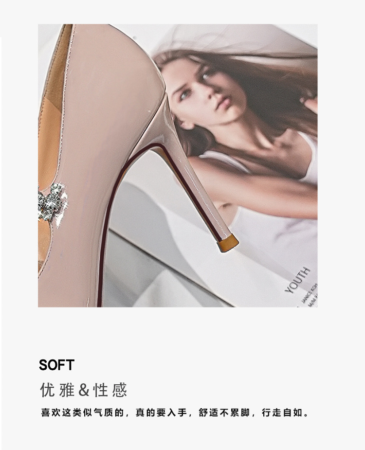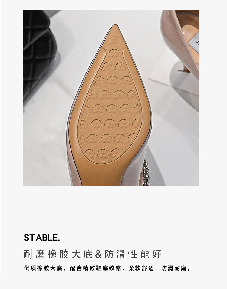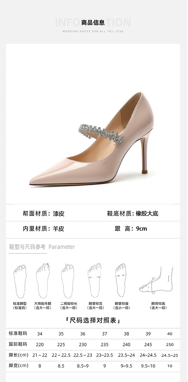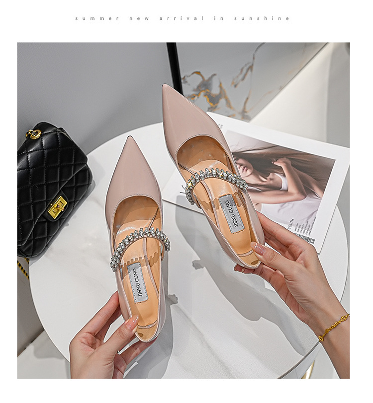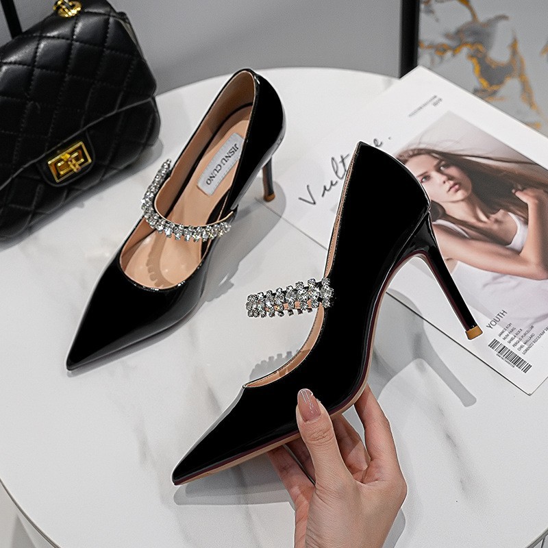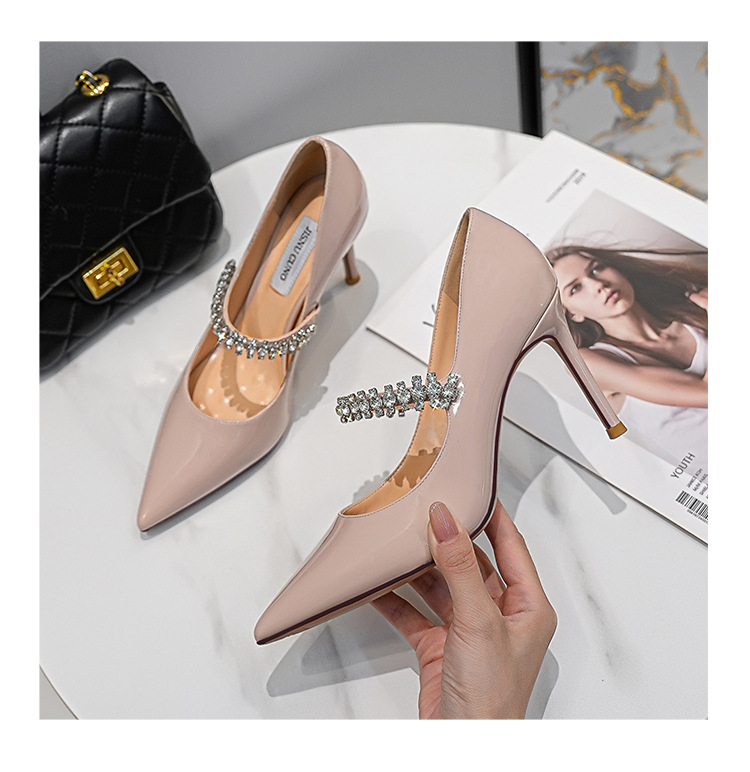 2025년 가을 신상 프랑스 라인스톤 포인티드 토 화이트 메리제인 하이힐, 여성용 슬림 힐, 우아한 페이턴트 가죽 슈즈스토어 가기