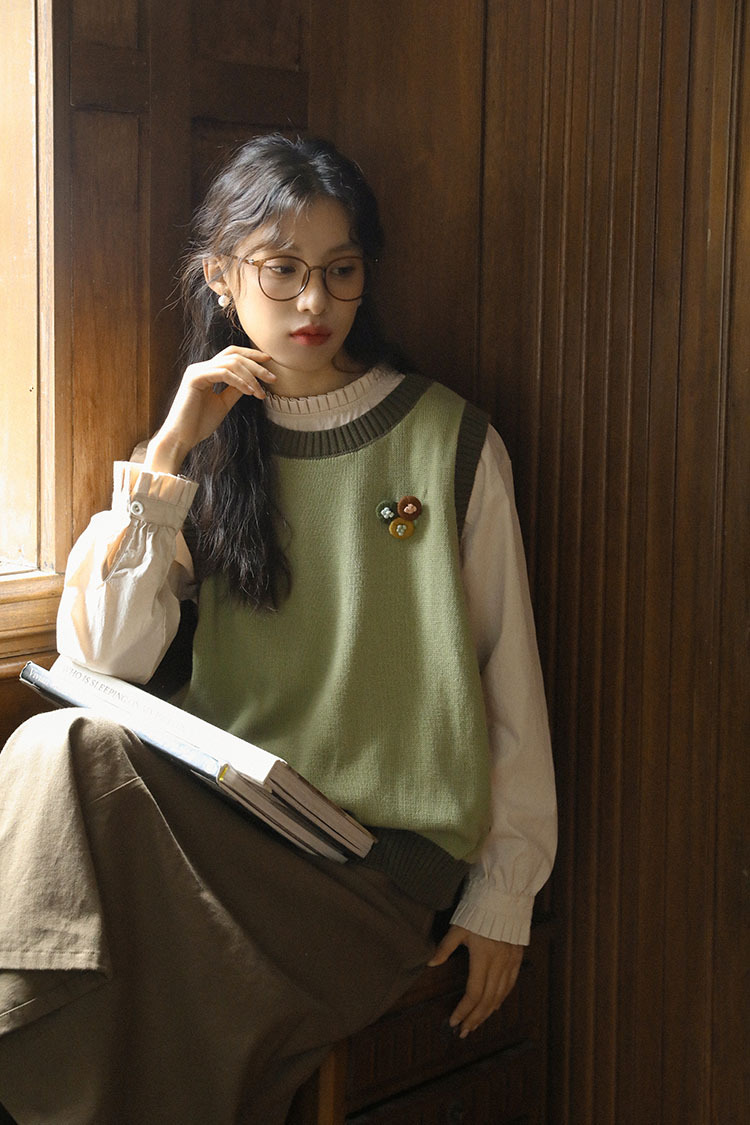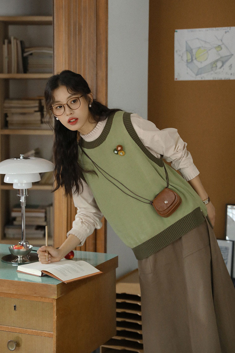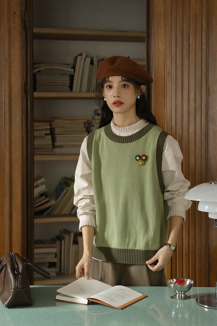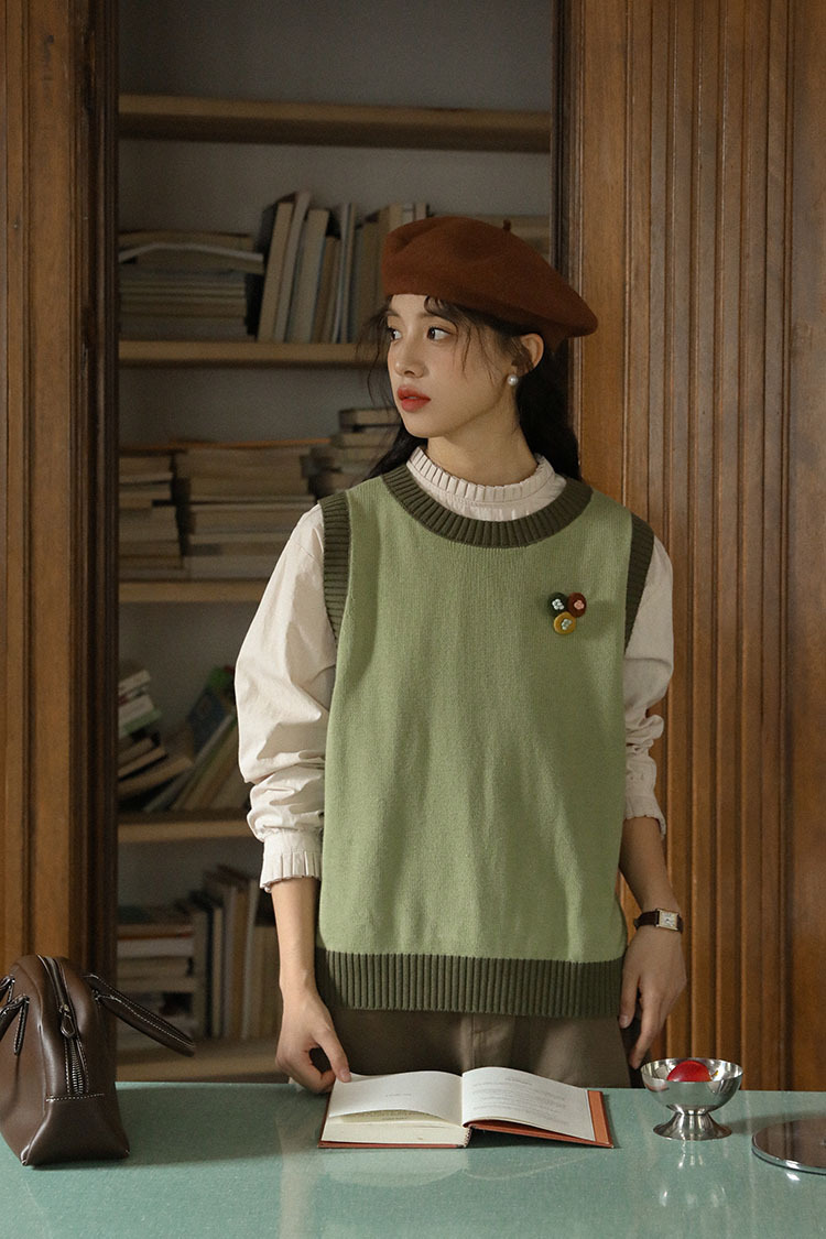 2025 가을 겨울 일본 문학적 복고풍 녹색 레이어드 대비색 여성용 조끼, 상큼한 스타일의 조끼스토어 가기