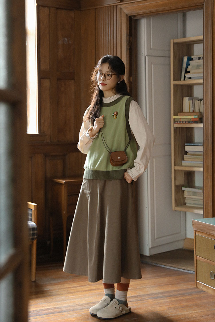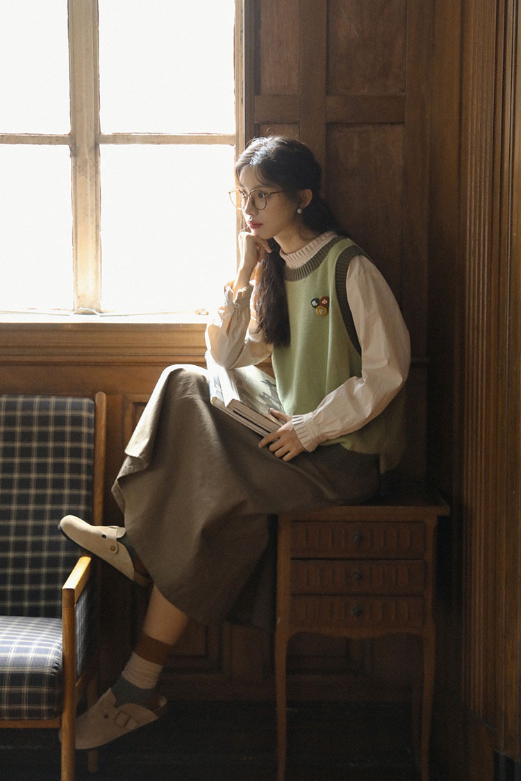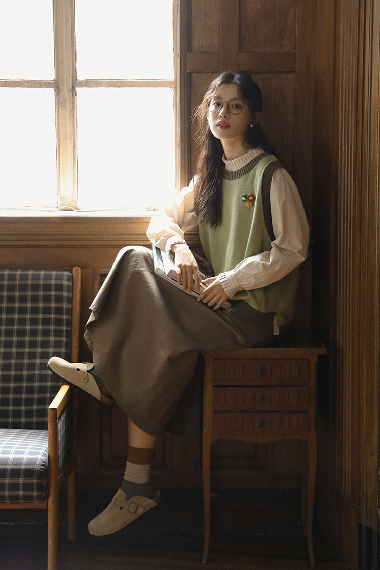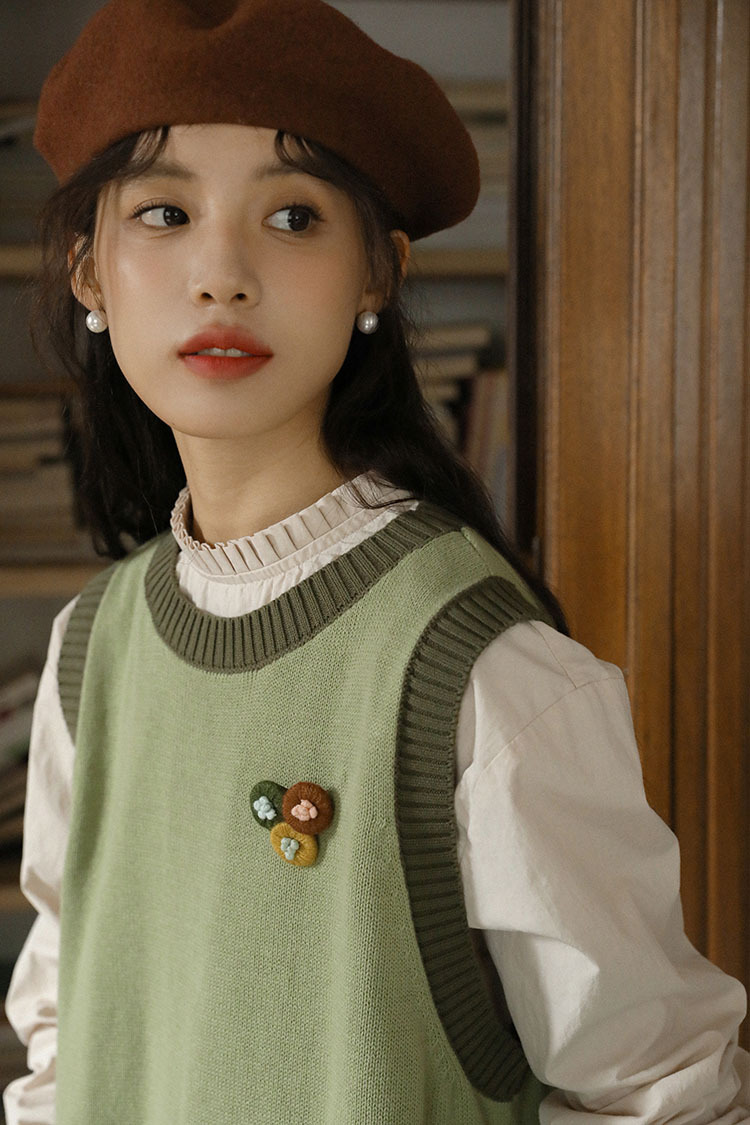 2025 가을 겨울 일본 문학적 복고풍 녹색 레이어드 대비색 여성용 조끼, 상큼한 스타일의 조끼스토어 가기
