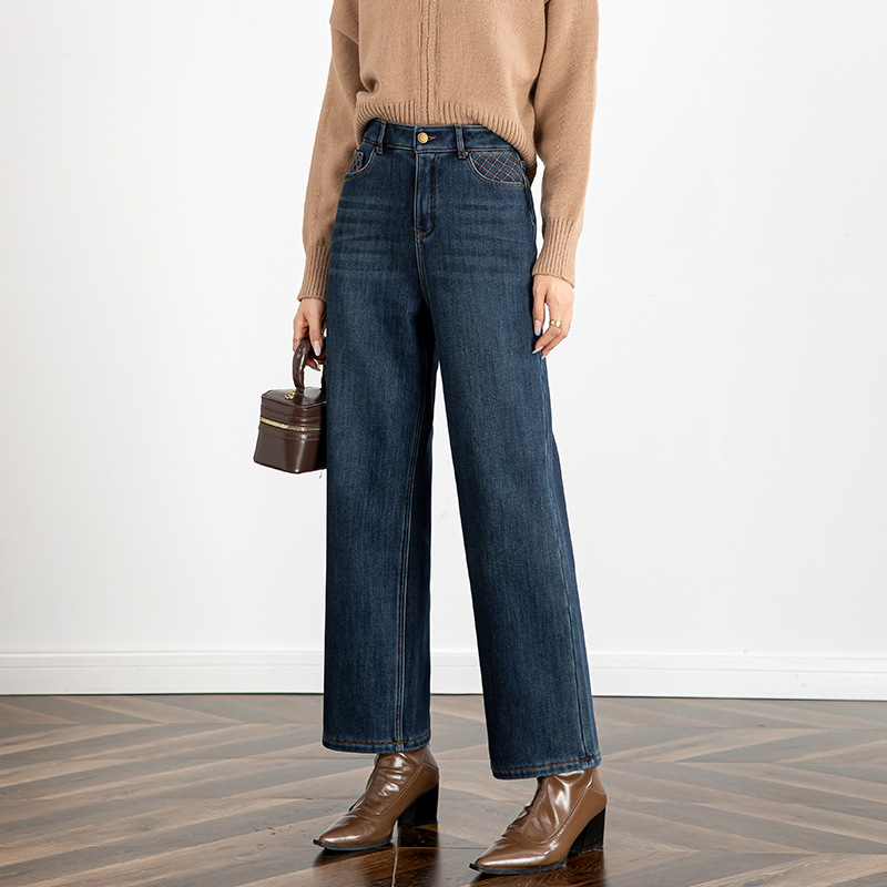 여성용 자수 청바지 2025 겨울 신작 따뜻한 복합 벨벳 와이드 레그 하이 웨이스트 슬림 스트레이트 9 점 바지 8050