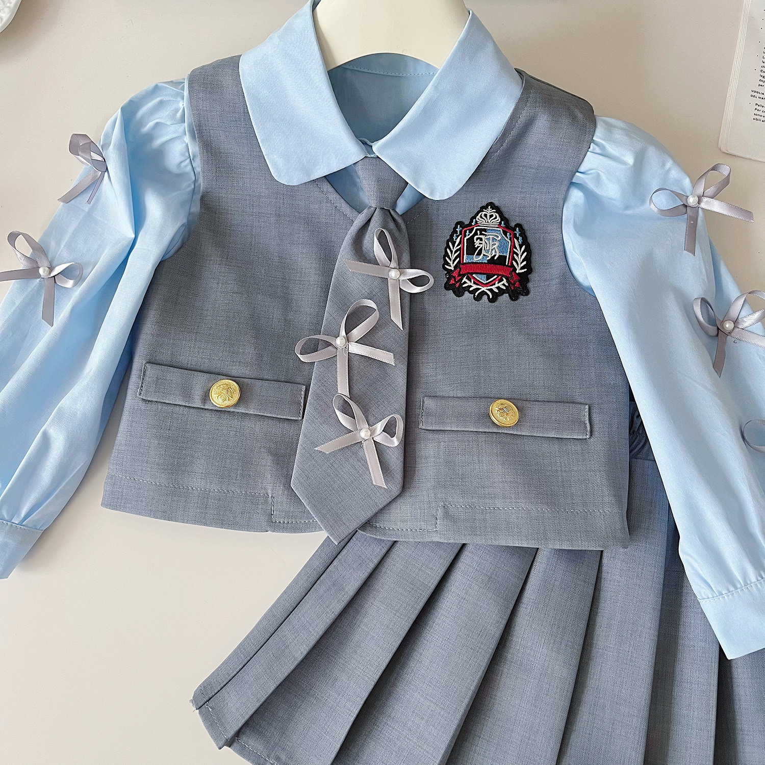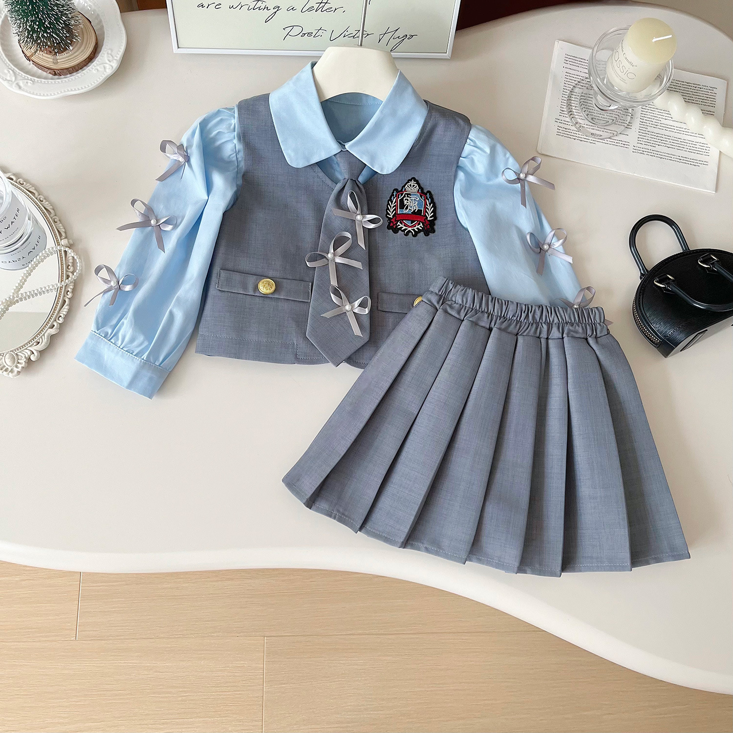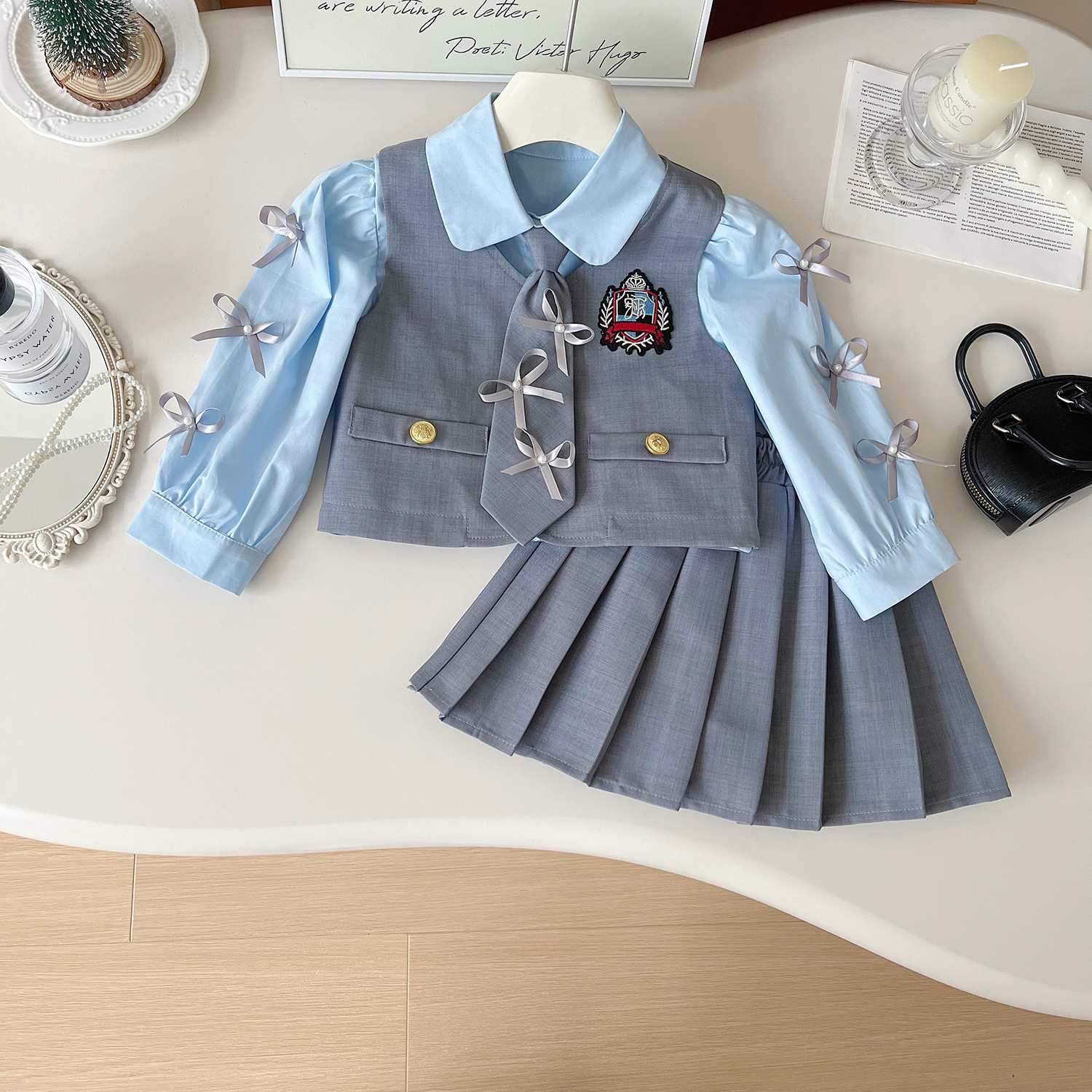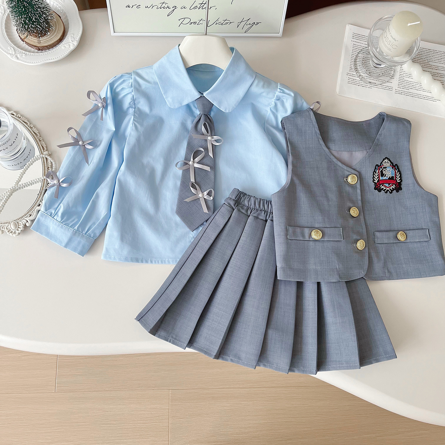 여아용 컬리지 스타일 셔츠 세트 2025 봄 가을 신상 아동 가을 상의 조끼 플리츠 스커트 3종 세트