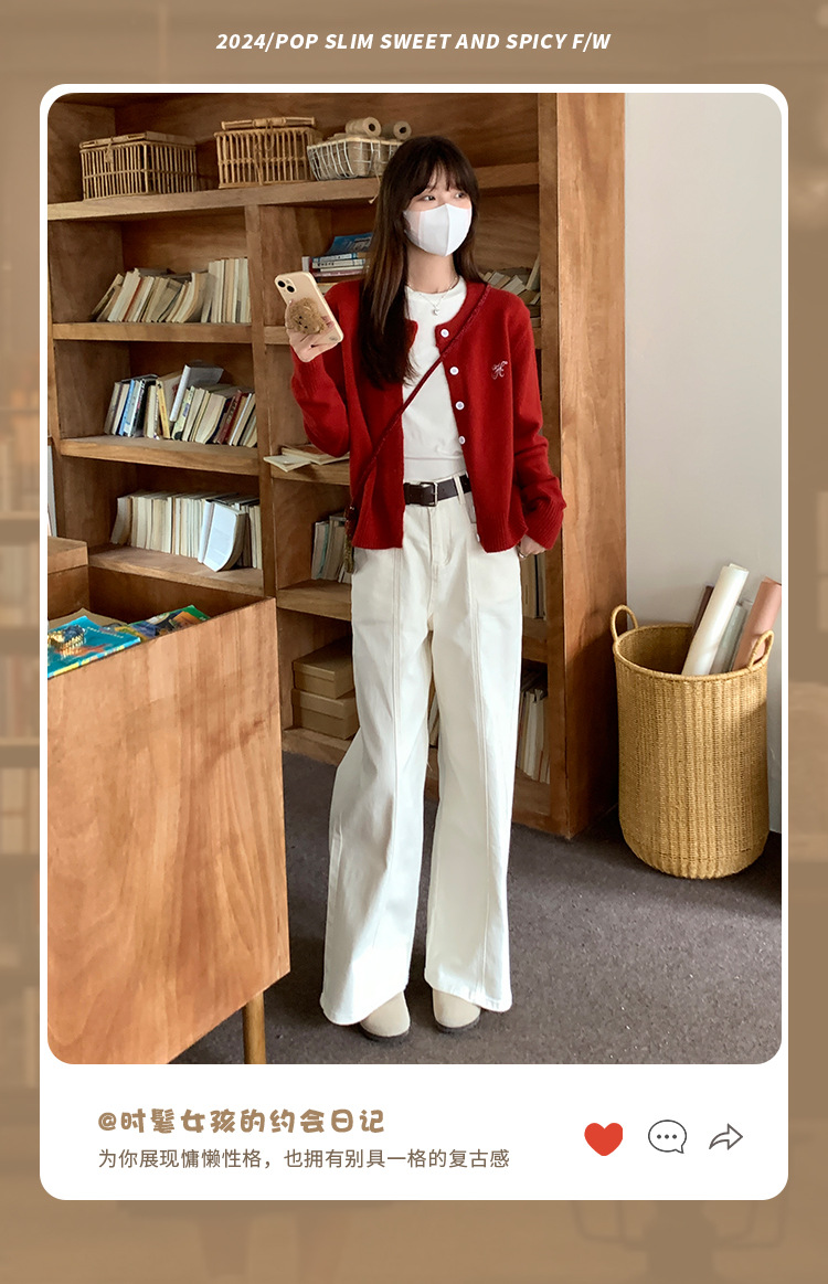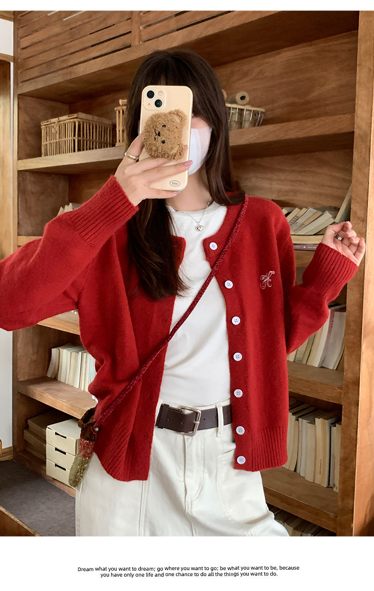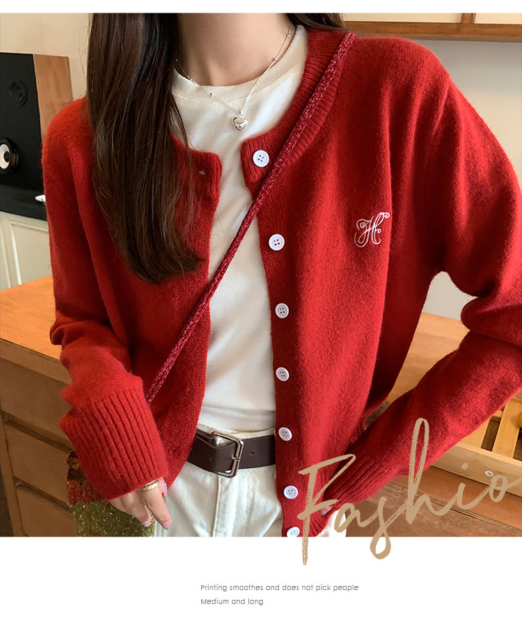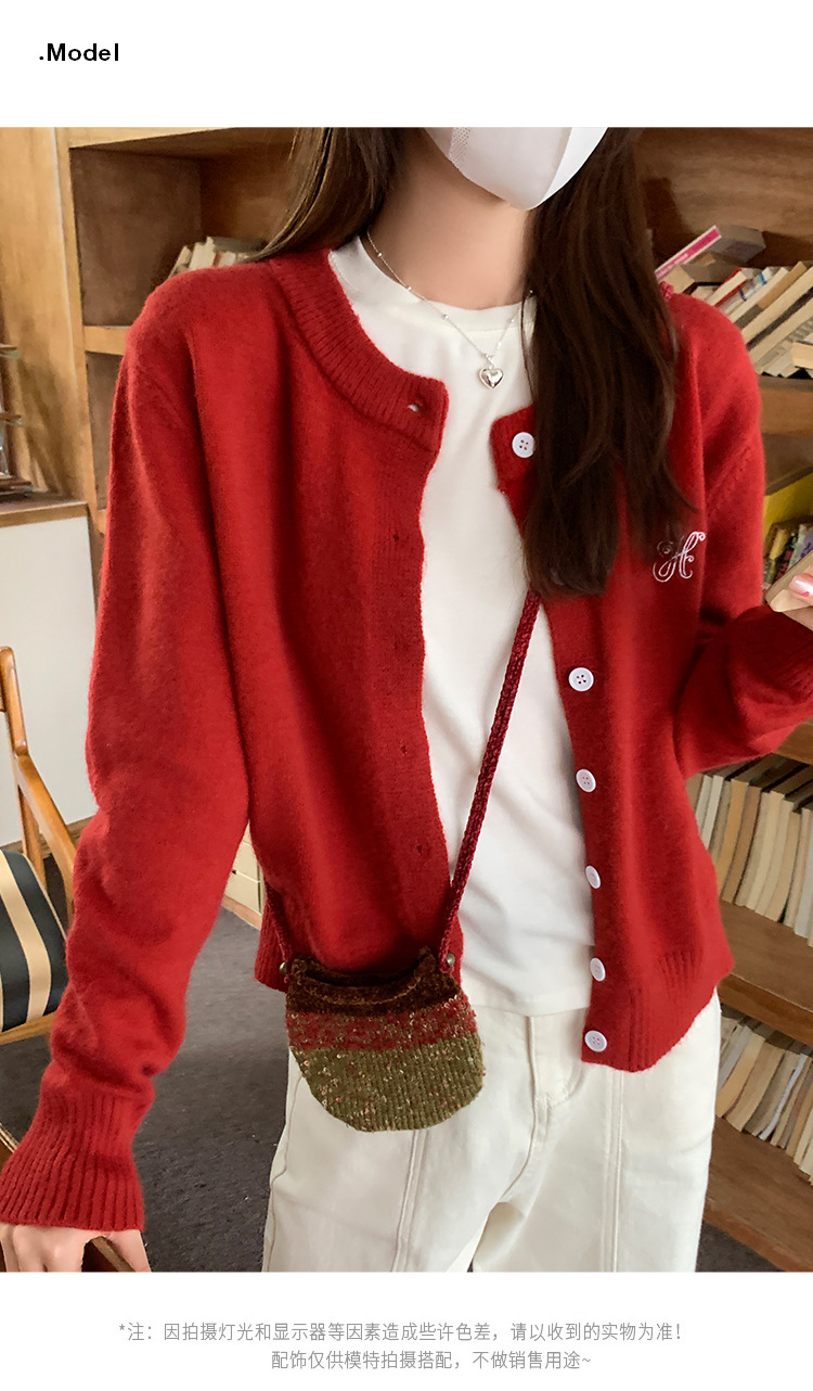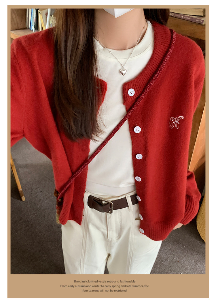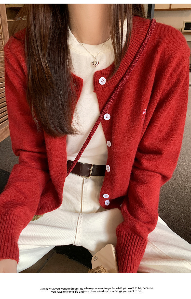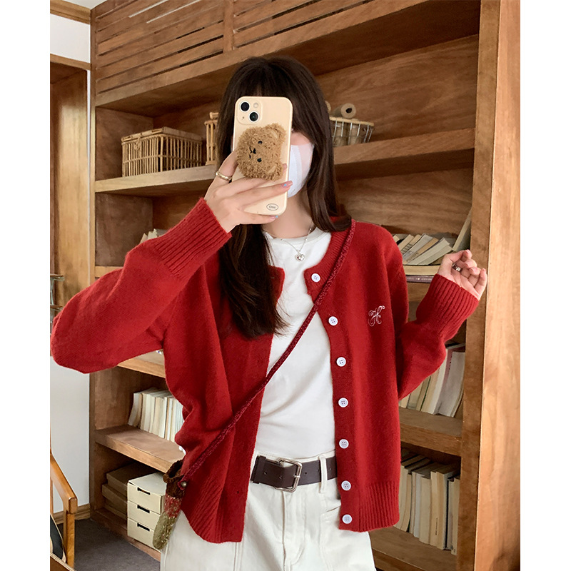 레드 라운드넥 긴팔 니트 가디건 여성용 2026 가을 자수 앙코라 레드 슬림핏 슬리밍 탑스토어 가기