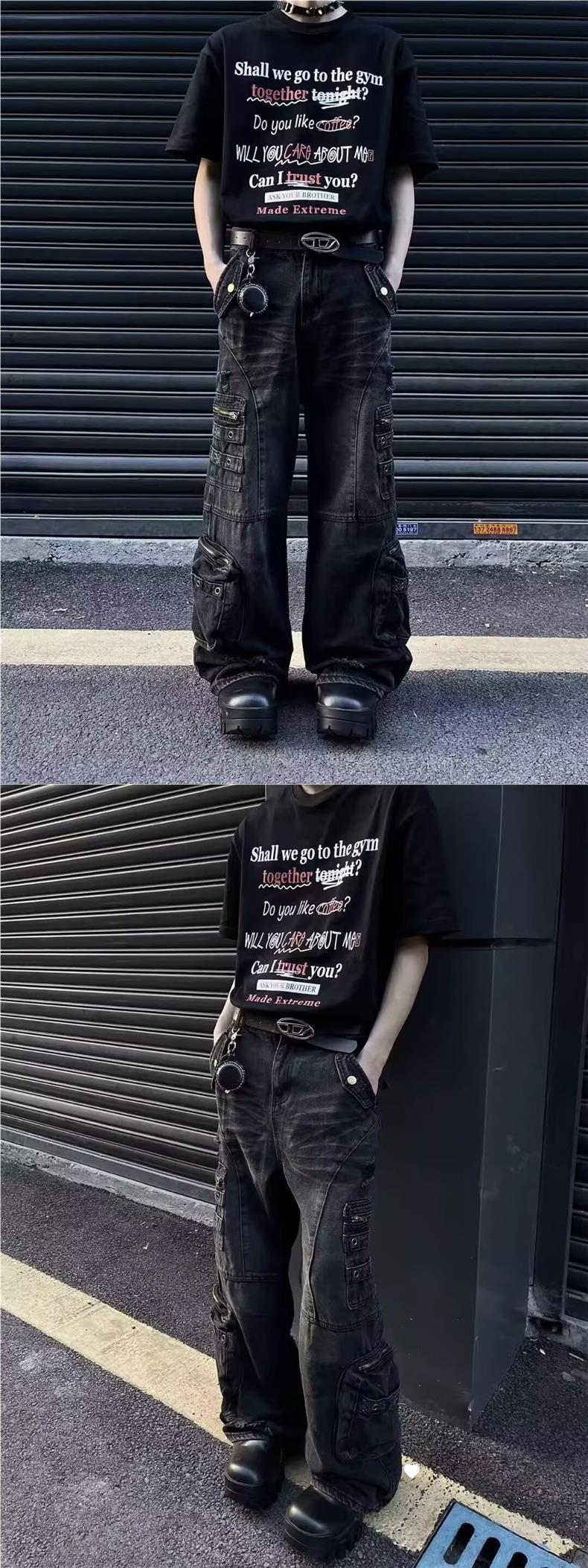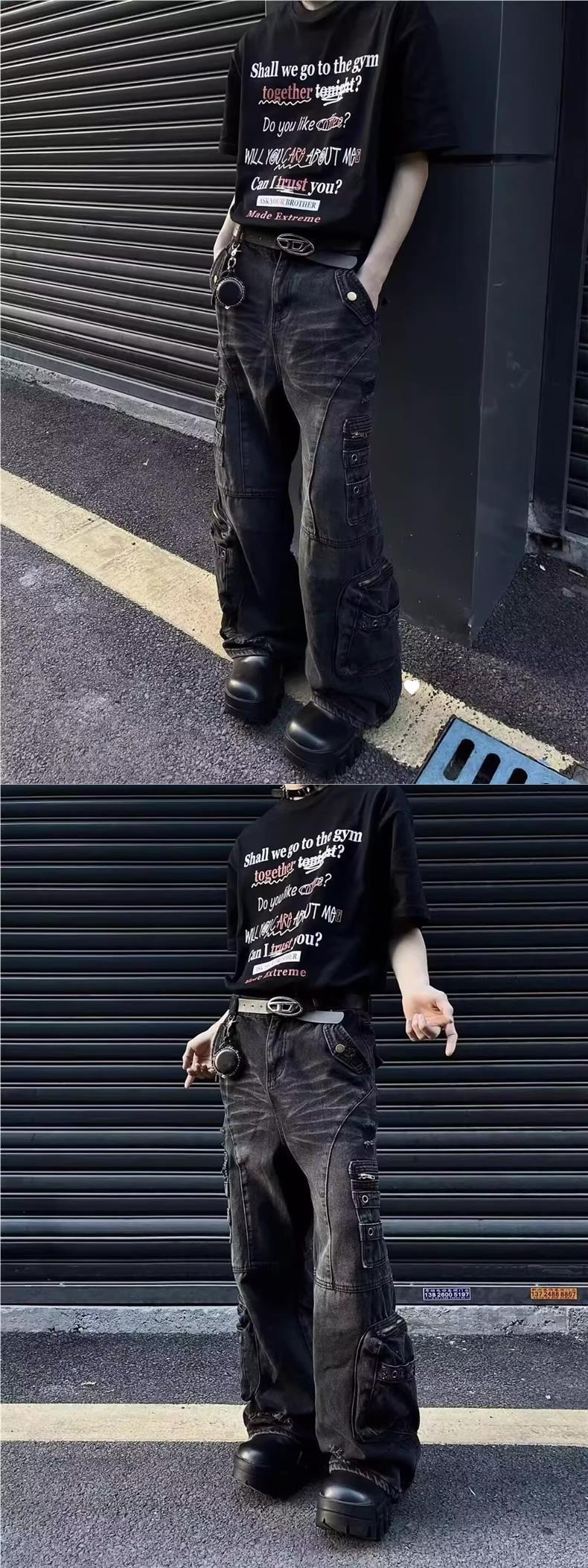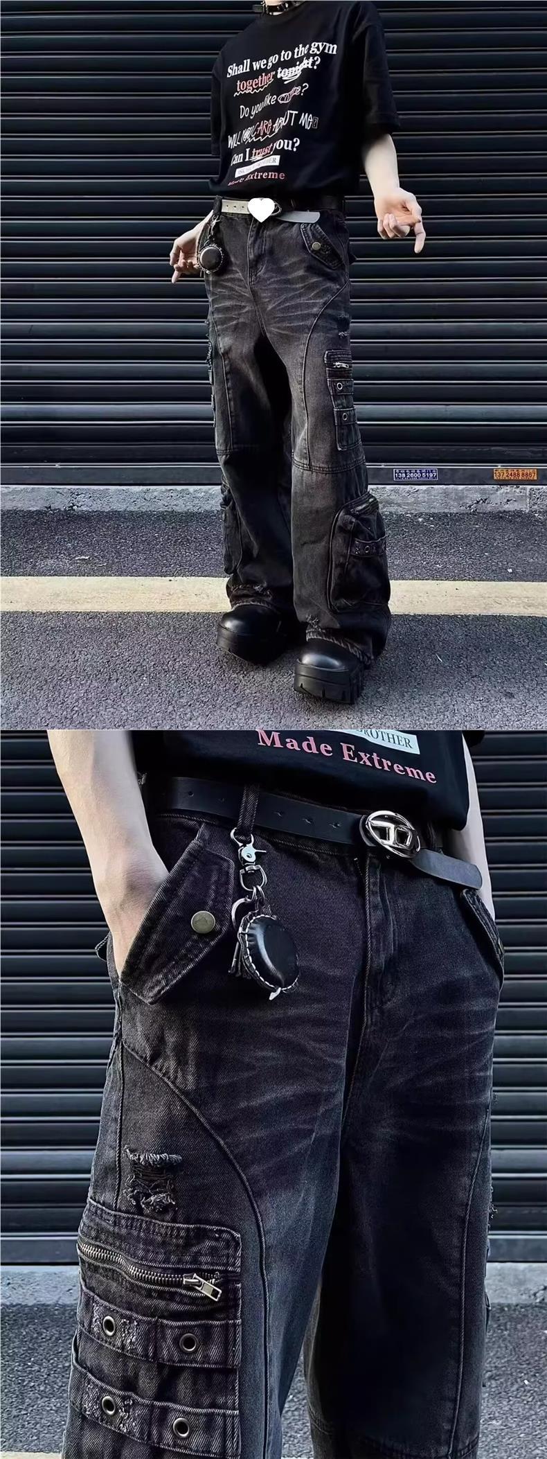 남성과 여성을위한 아메리칸 스타일 하이 스트리트 청바지 레트로 스트리트 오래 된 지퍼 대형 포켓 느슨한 스트레이트 툴링 바지