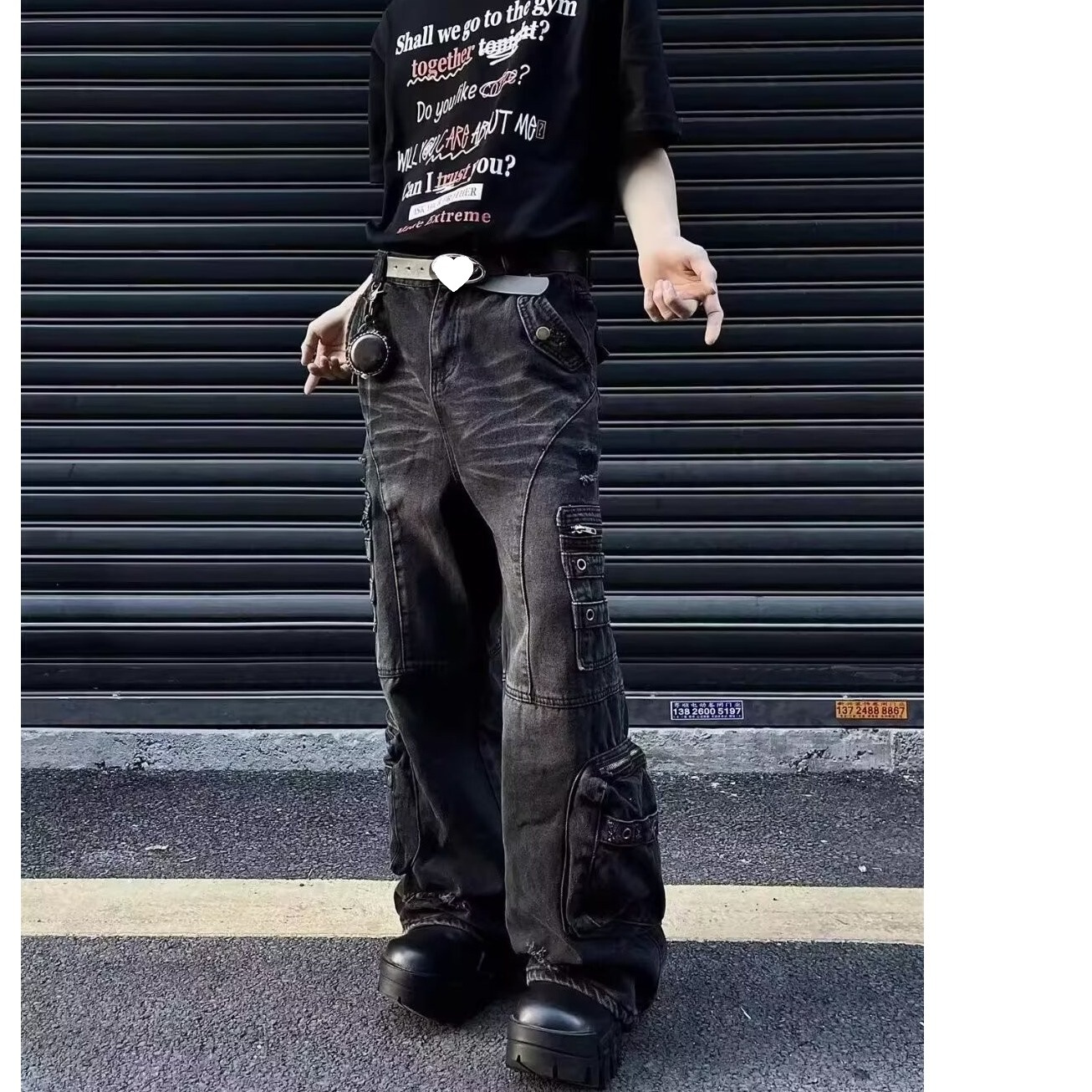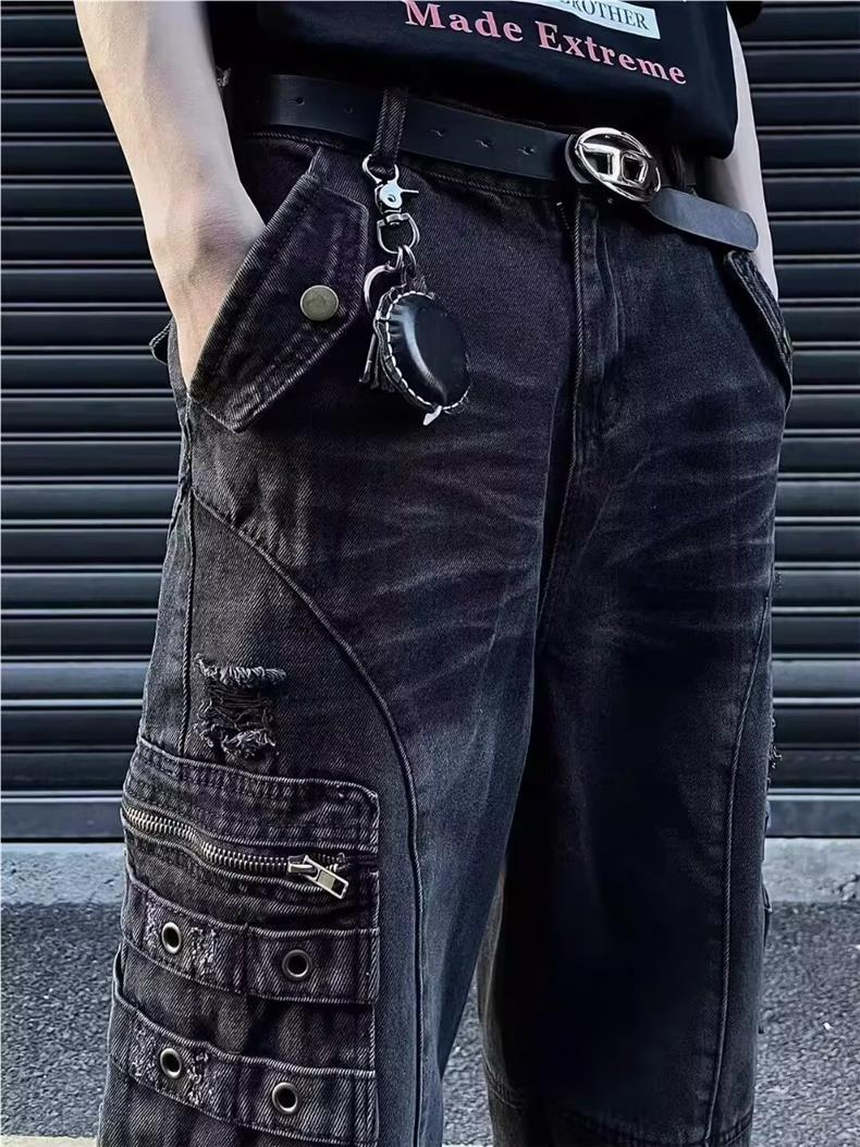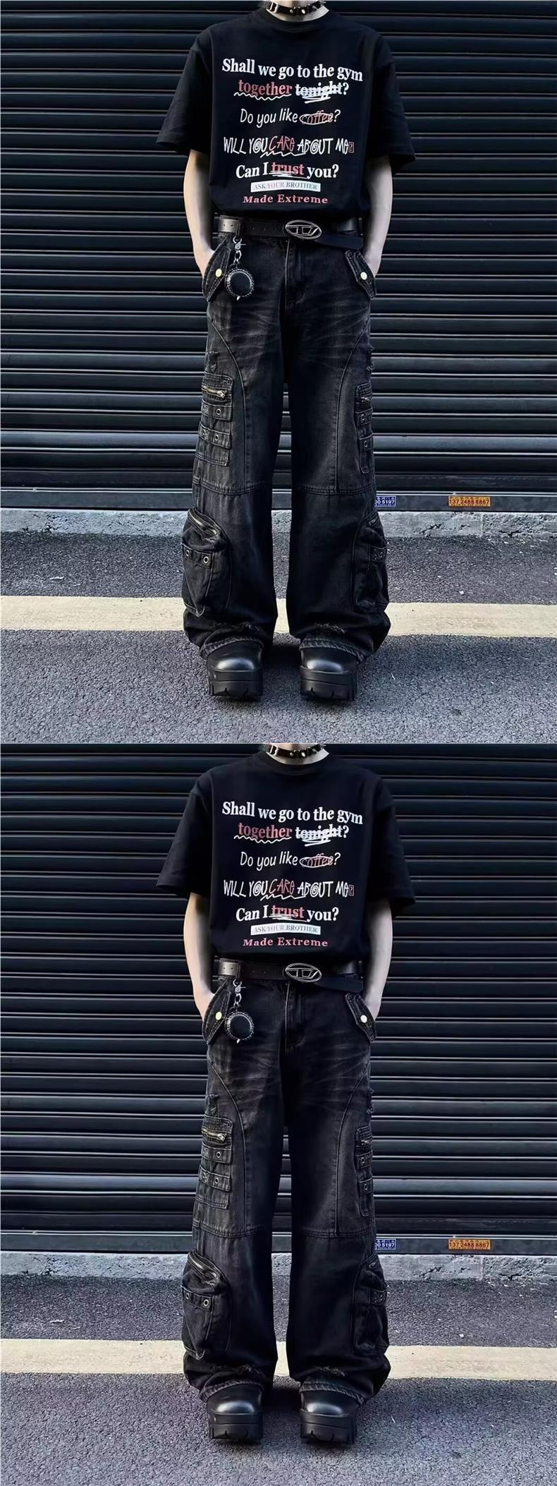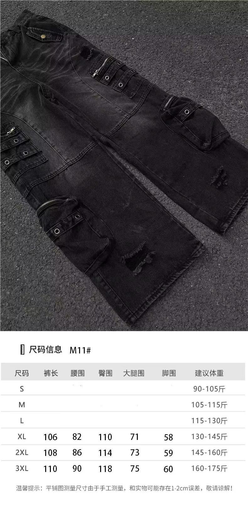 남성과 여성을위한 아메리칸 스타일 하이 스트리트 청바지 레트로 스트리트 오래 된 지퍼 대형 포켓 느슨한 스트레이트 툴링 바지