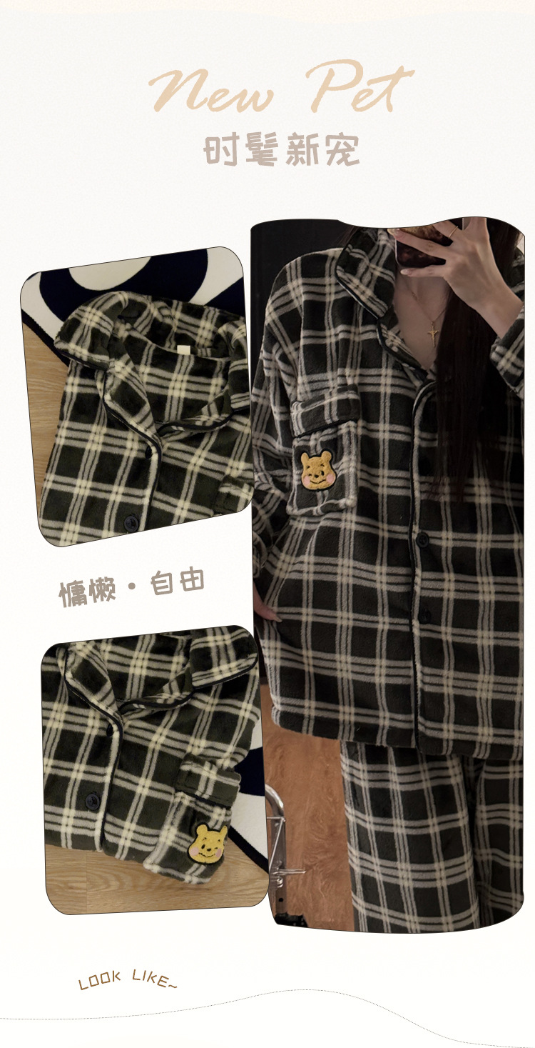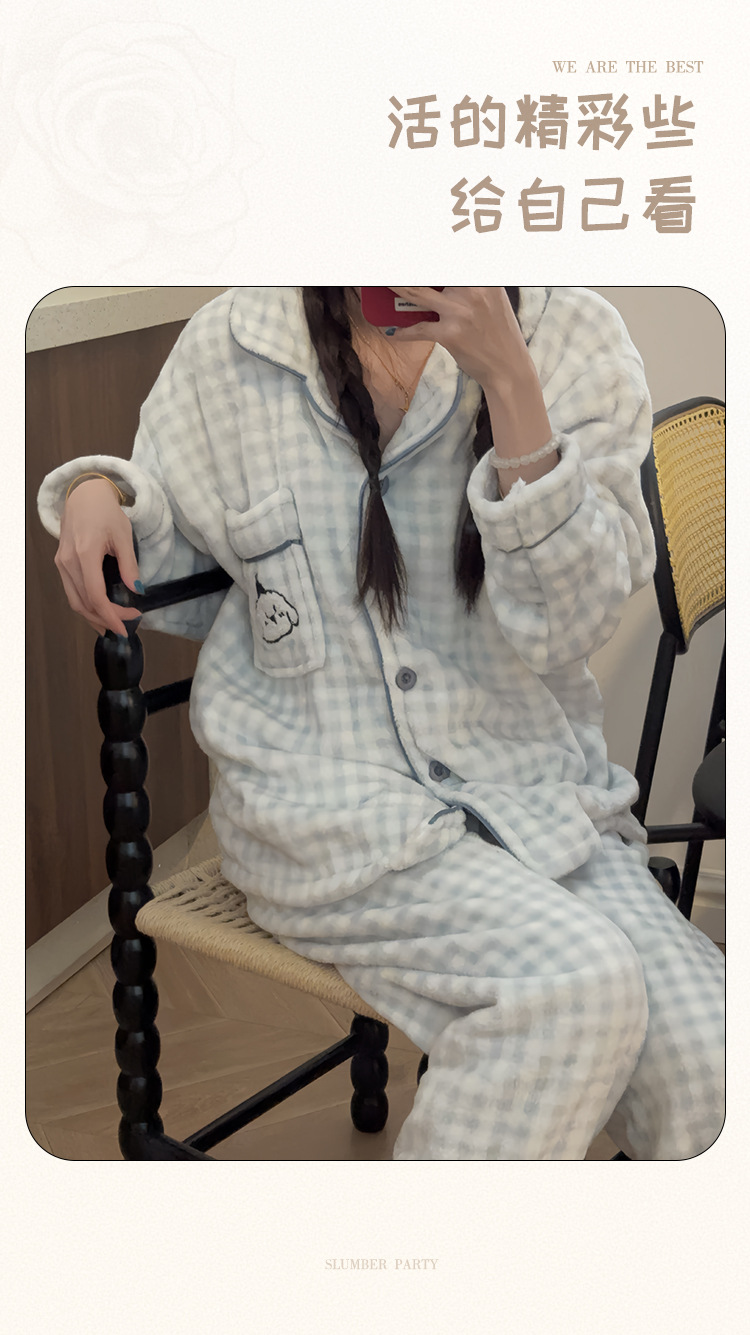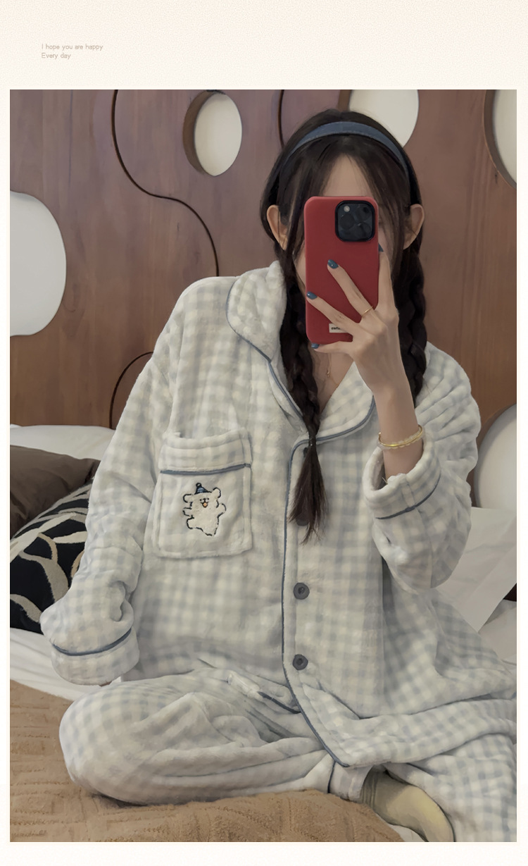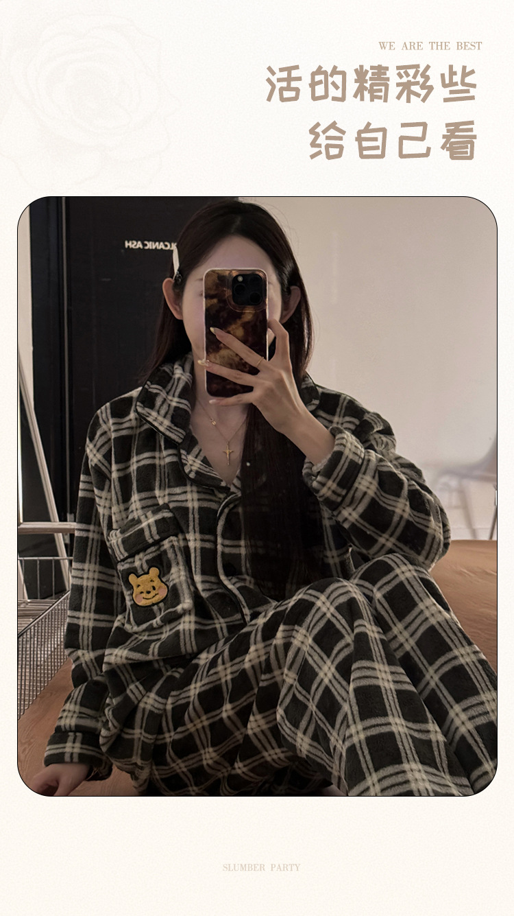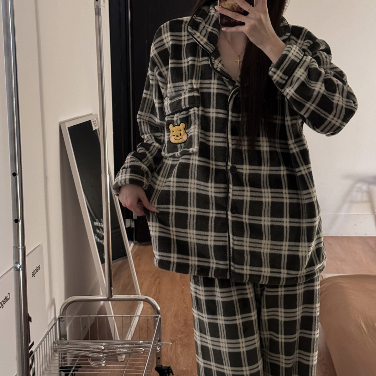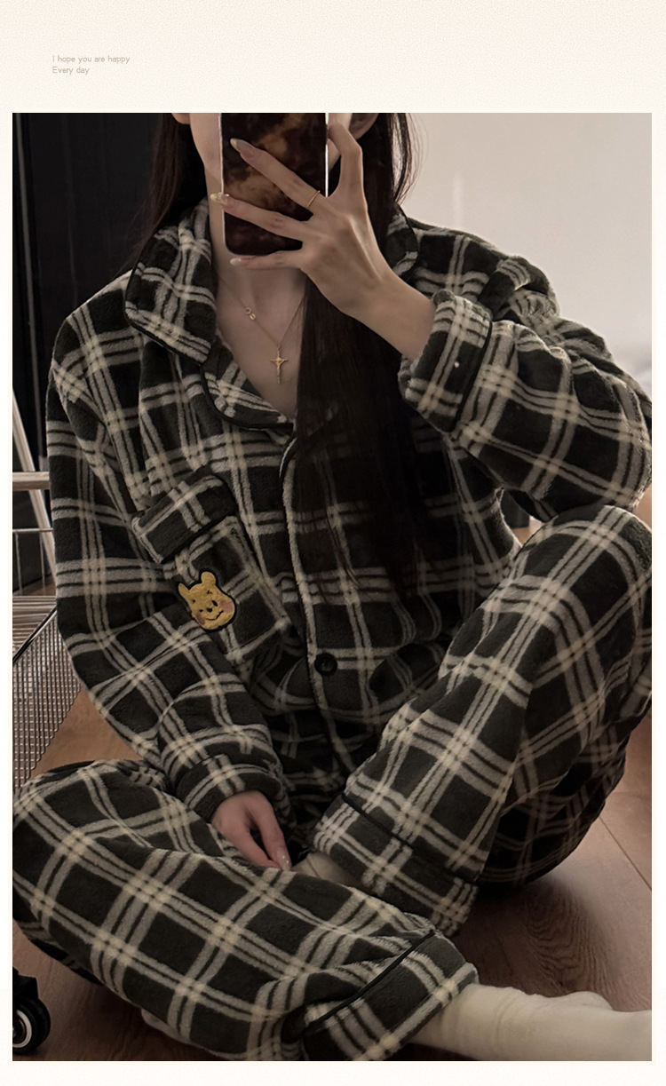 Ins 일본식 격자 무늬 잠옷 여성의 가을과 겨울 플란넬 두꺼운 따뜻한 만화 의상 투피스 세트스토어 가기