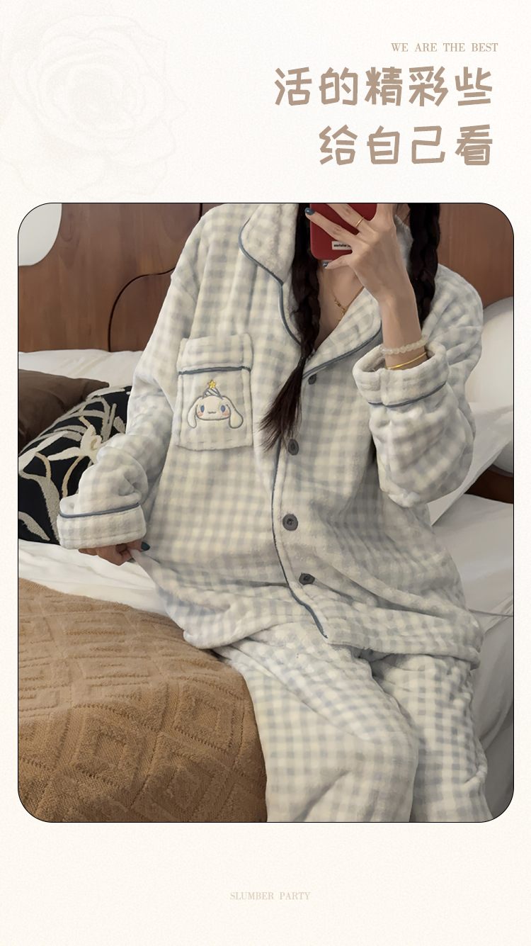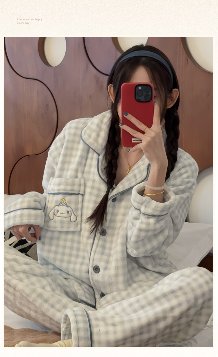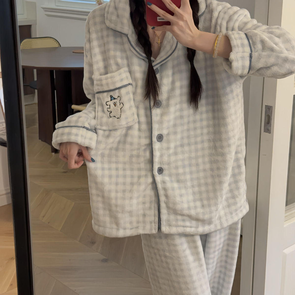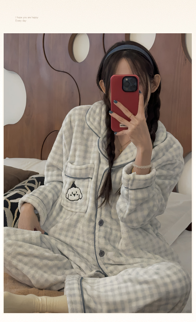 Ins 일본식 격자 무늬 잠옷 여성의 가을과 겨울 플란넬 두꺼운 따뜻한 만화 의상 투피스 세트