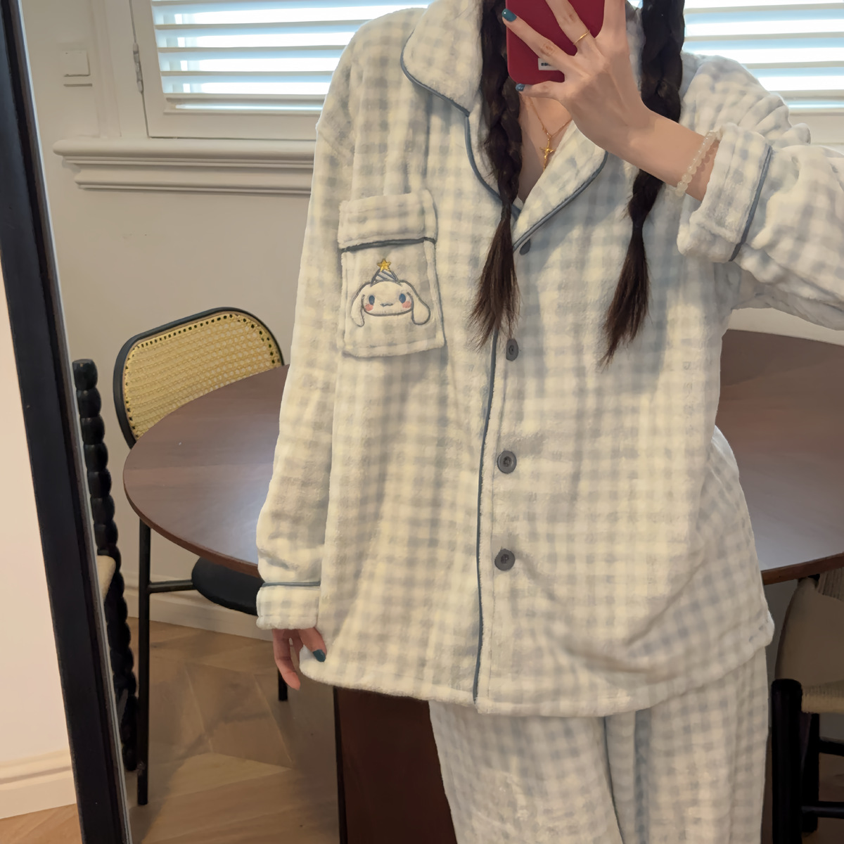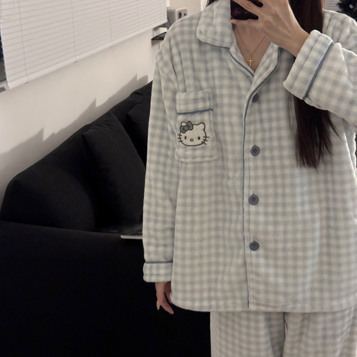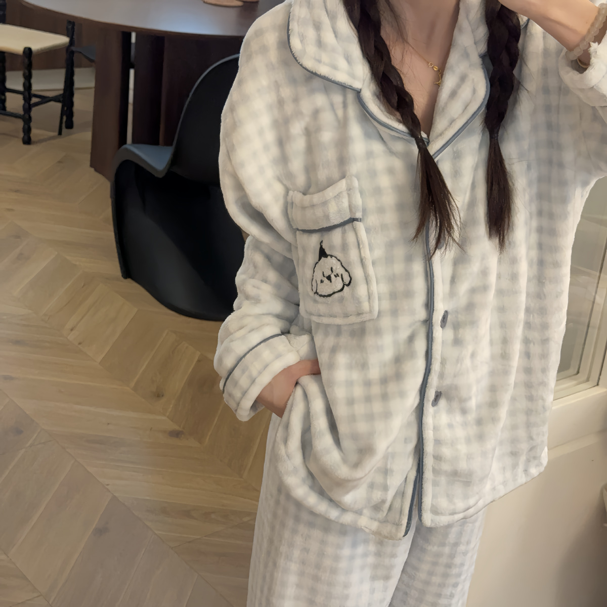 Ins 일본식 격자 무늬 잠옷 여성의 가을과 겨울 플란넬 두꺼운 따뜻한 만화 의상 투피스 세트