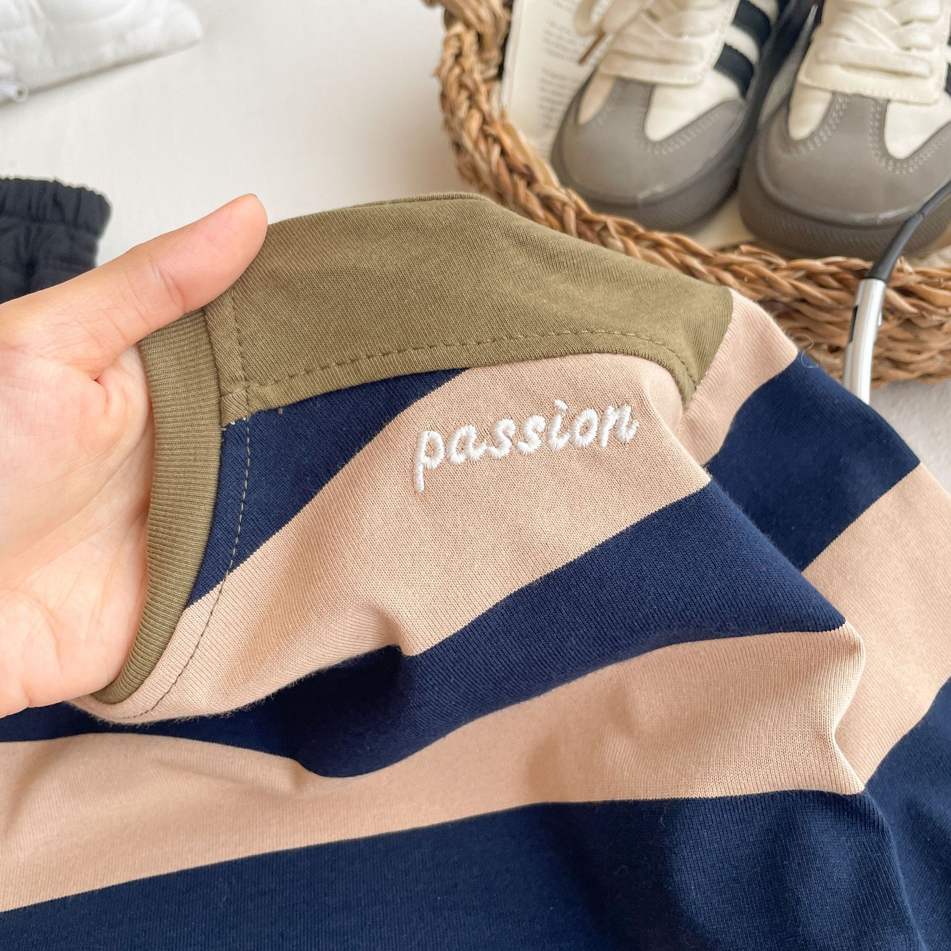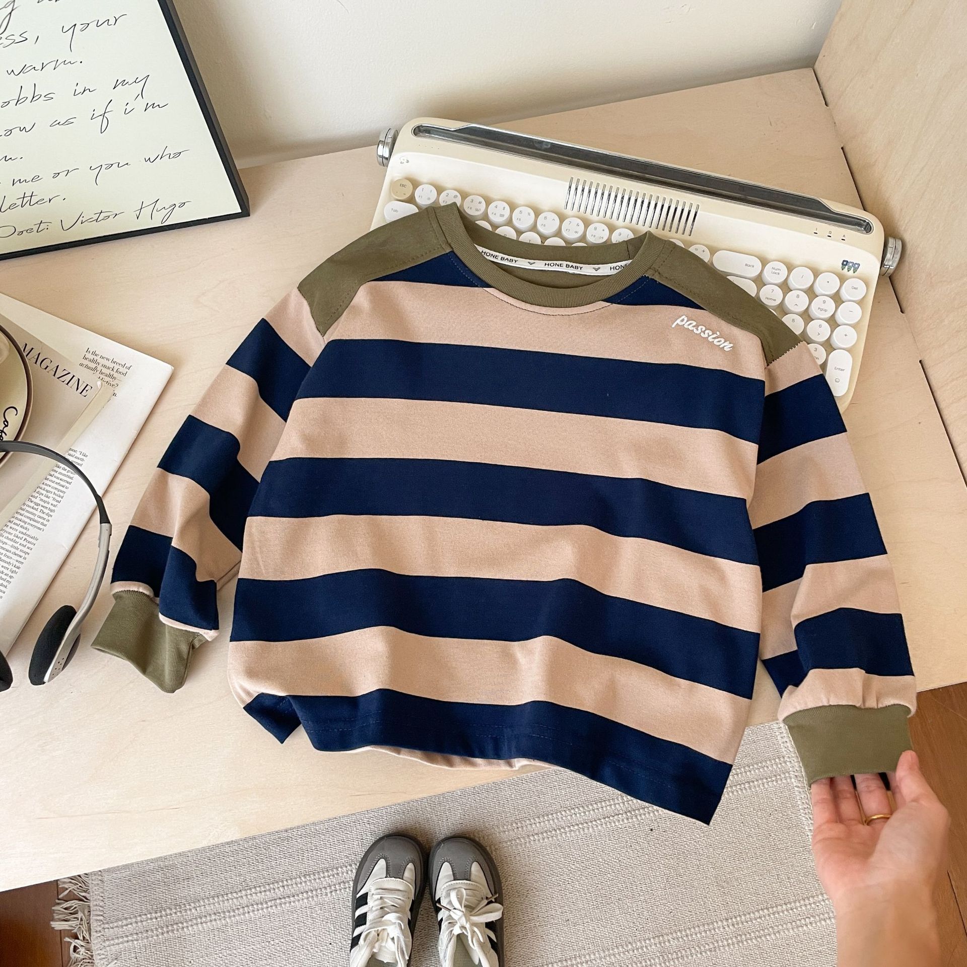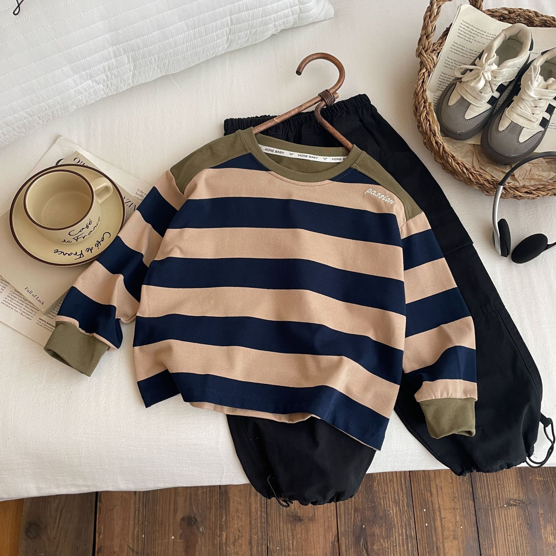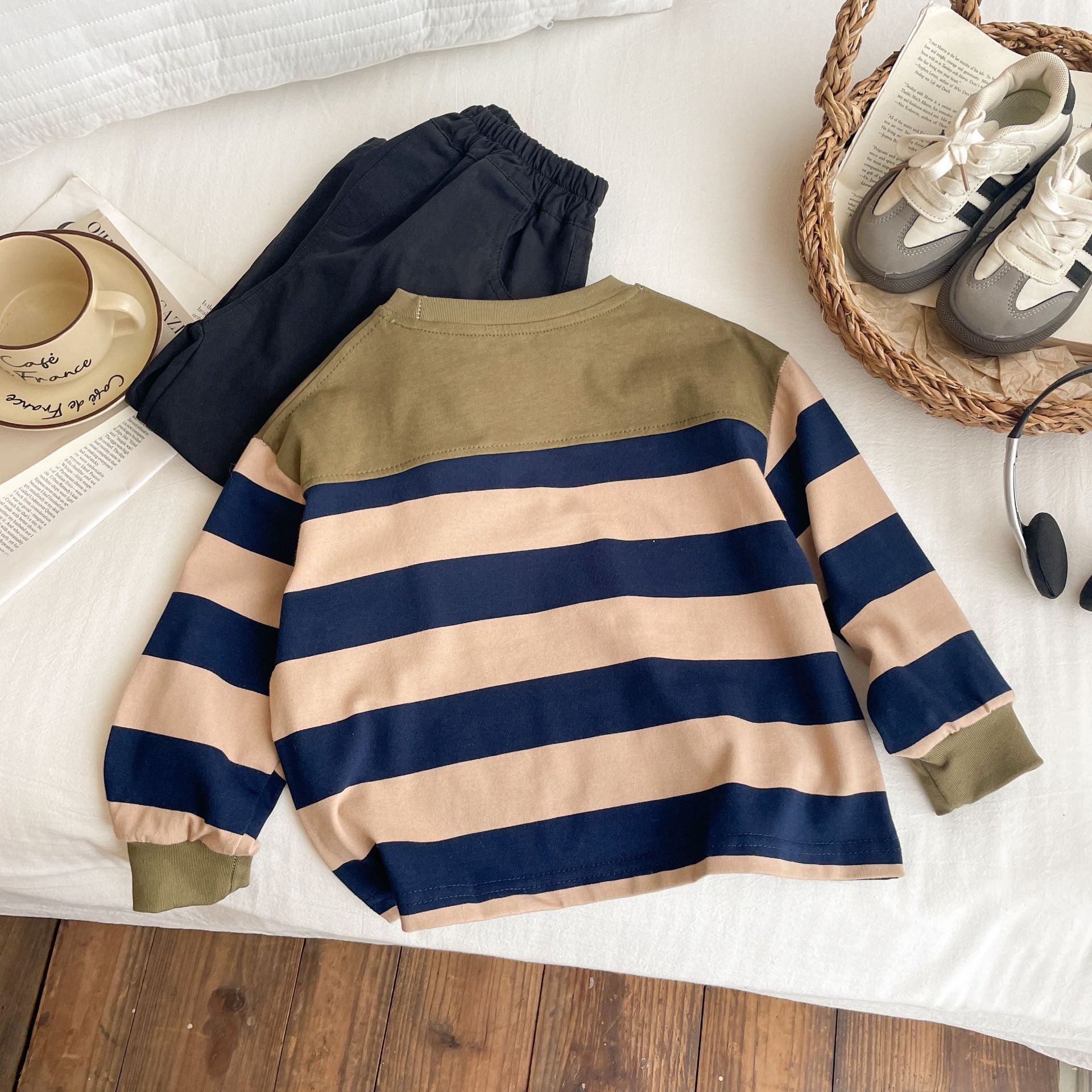 어린이 순수 코튼 컬러 블록 긴팔 탑 2024 가을, 겨울 소년 아기 한국어 버전 다목적 스트라이프 스웨트 도매 대비 색상스토어 가기