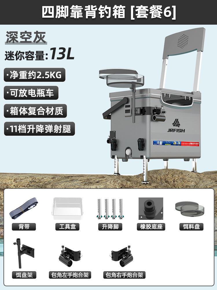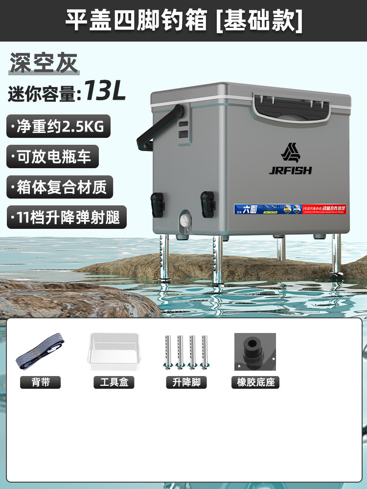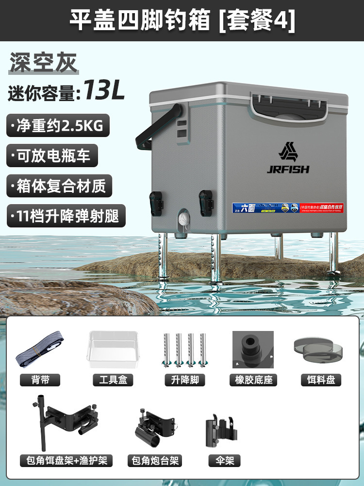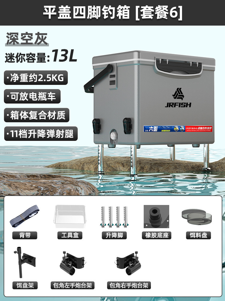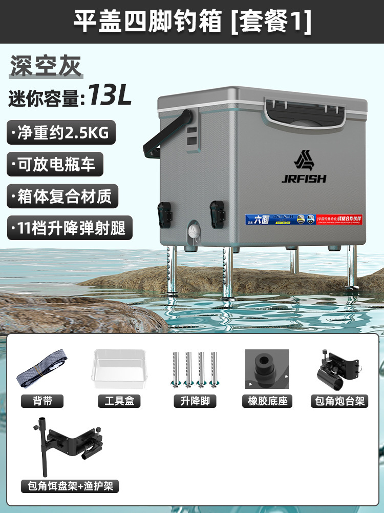 • 다리가 있는 13리터 회색 플랫 커버(왼쪽 및 오른쪽 터렛 + 미끼 상자 홀더 + 미끼 상자)