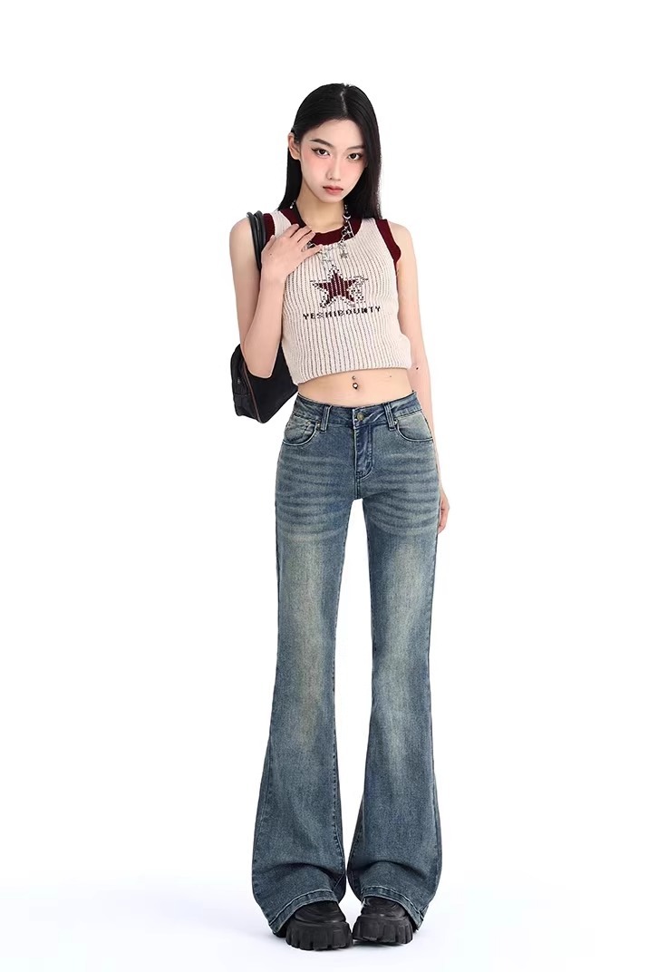 여성을위한 미국 복고풍 마이크로 플레어 청바지 2025 새로운 스타일 핫 소녀 로우 허리 슬리밍 와이드 레그 스트레치 바닥 길이 말굽 바지