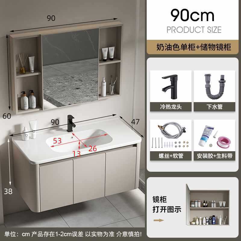 • 90 얇은 모서리 둥근 세면대 캐비닛 + 수도꼭지 + 수납 거울 캐비닛
