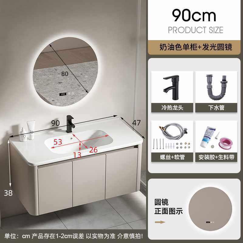 • 90 얇은 모서리 둥근 세면대 캐비닛 + 수도꼭지 + 김서림 방지 야광 거울 캐비닛